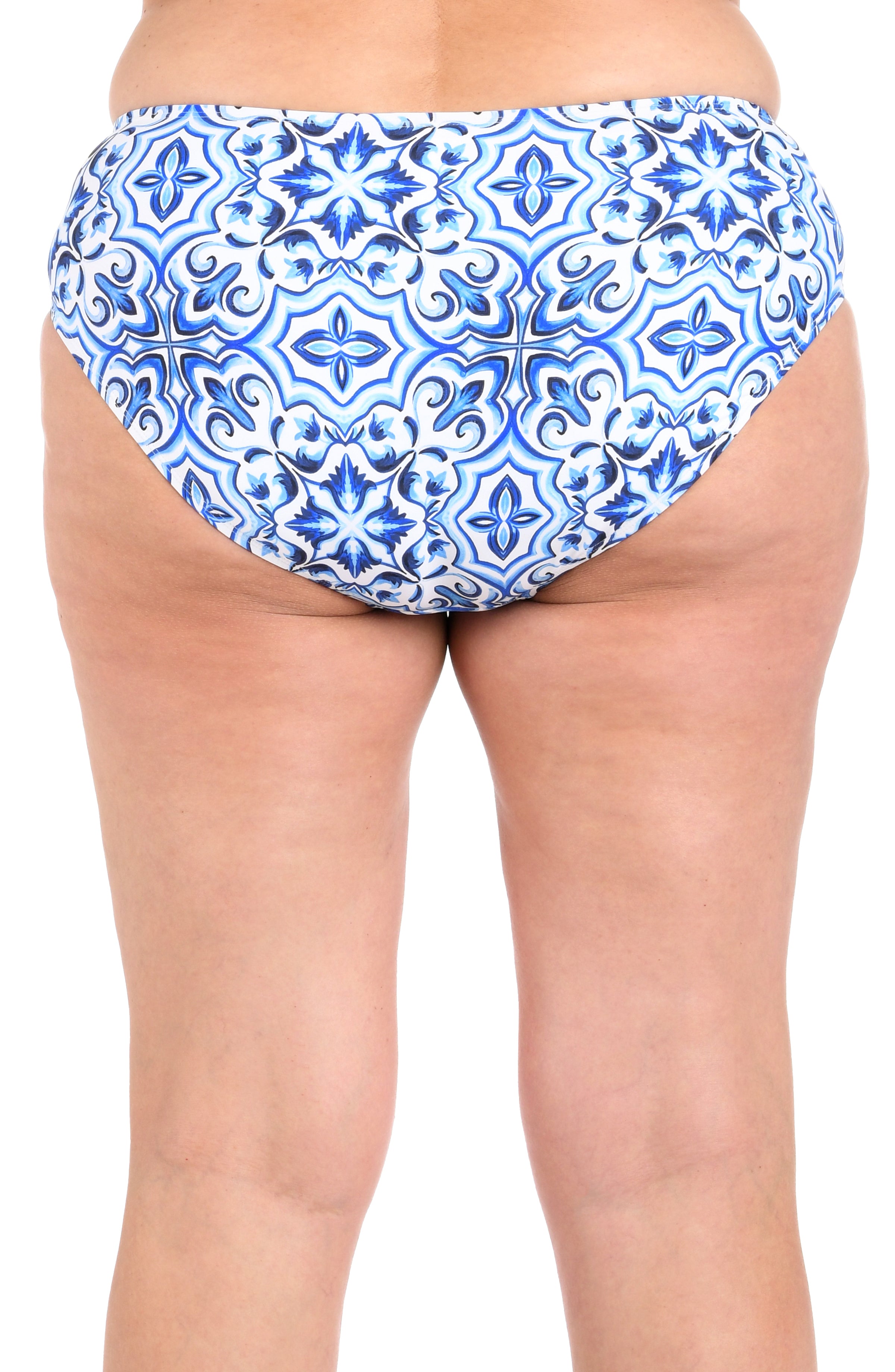 Inspired by Mediterranean tile artistry, the design brims with rich blue and white hues, accented by hints of yellow and red that lend warmth and contrast. These classic hipster bottoms feature moderate coverage all around and are perfect for a day spent lounging on the beach or soaking up the sun by the pool.