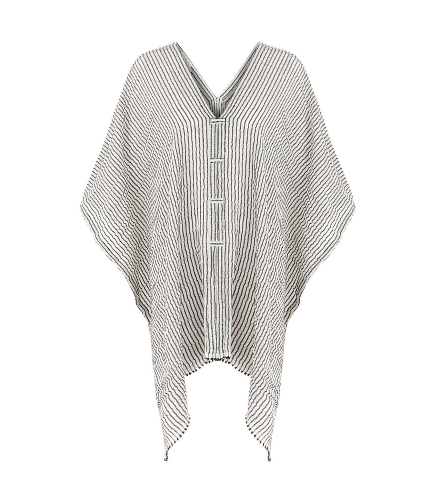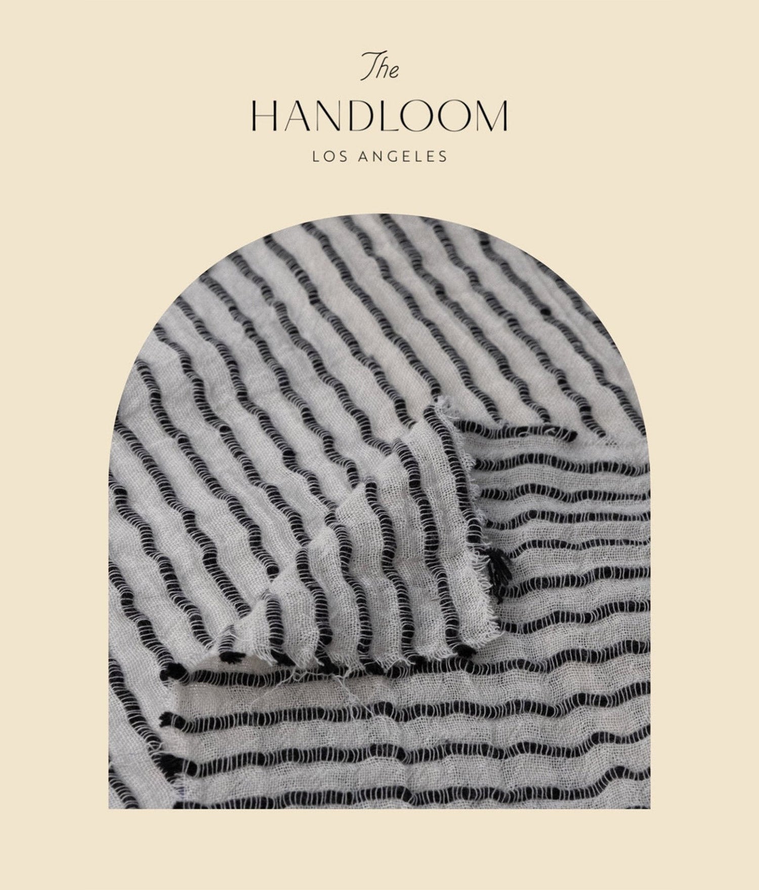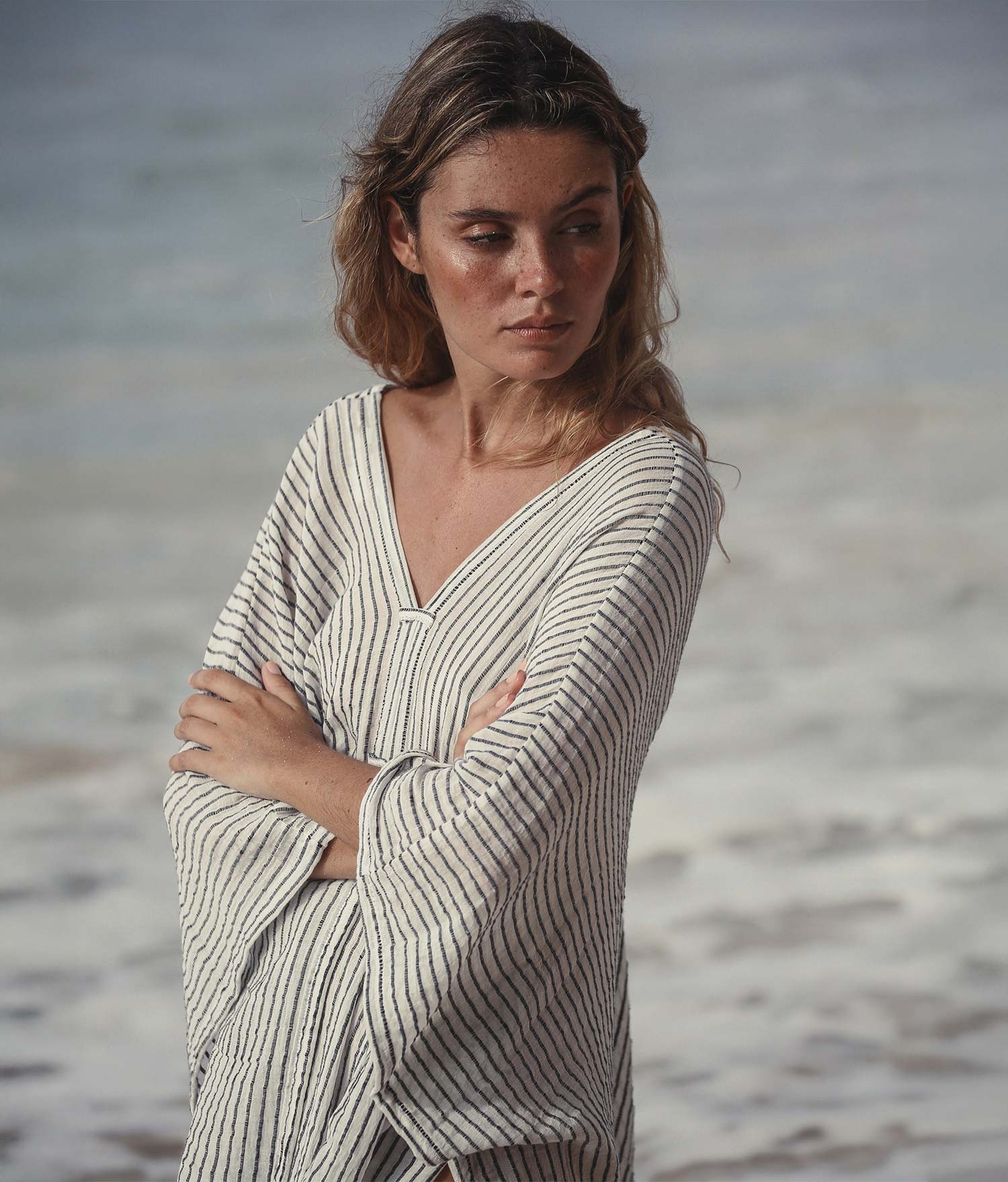 Make a memorable statement by the sea or in the lounge with the hand loomed Ava Kimono Black Stripes. An asymmetric frayed hem along with side slits, add movement and flow to a roomy drape. Featured artisanal striped motifs woven into its flowy fabric which boasts a linen-like feel. Breathable fibers and naturally built-in cooling properties make this the perfect beach kaftan.