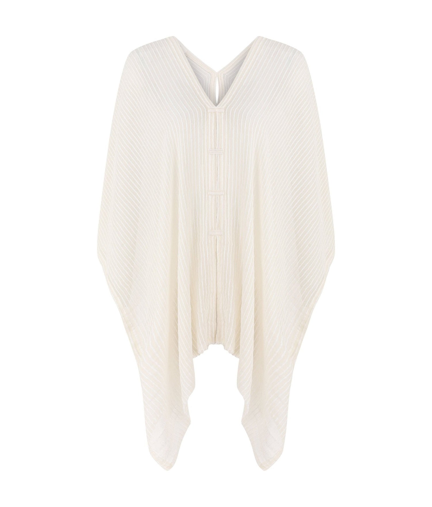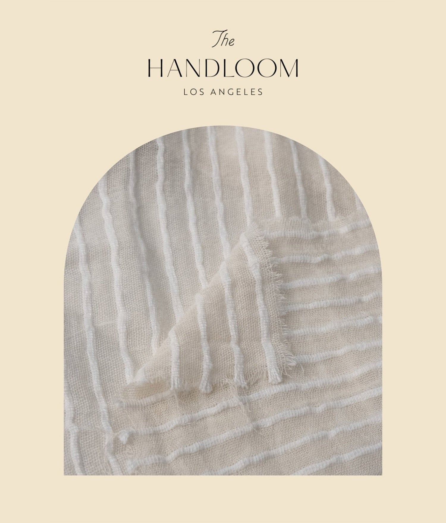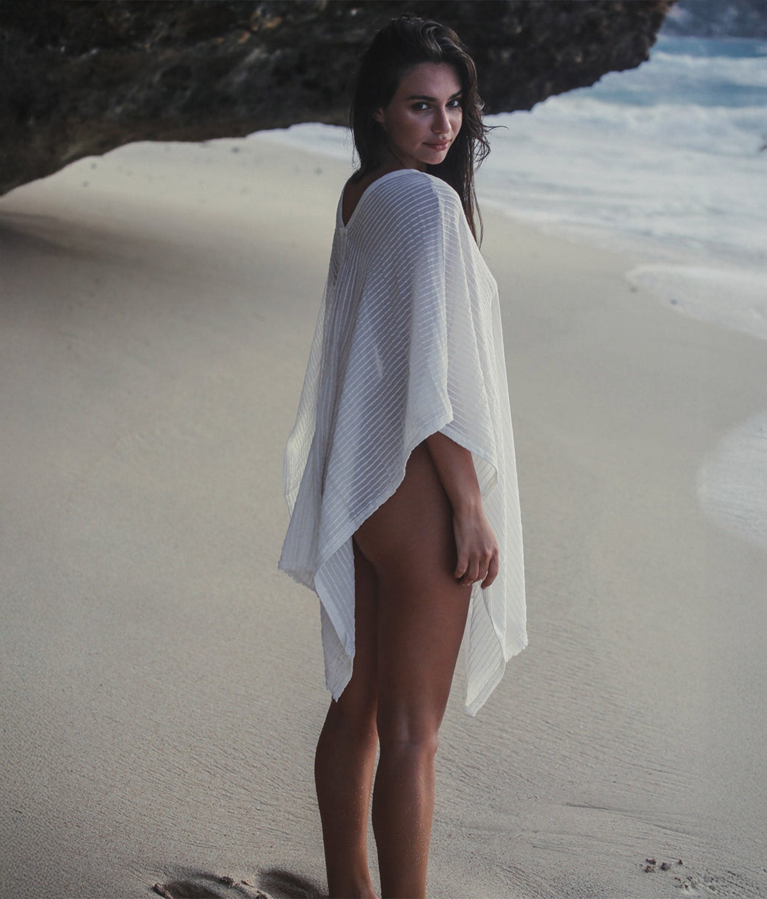 Make a memorable statement by the sea or in the lounge with the hand loomed Ava Kimono White Stripes. An asymmetric frayed hem along with side slits, add movement and flow to a roomy drape. Featured artisanal striped motifs woven into its flowy fabric which boasts a linen-like feel. Breathable fibers and naturally built-in cooling properties make this the perfect beach kaftan.