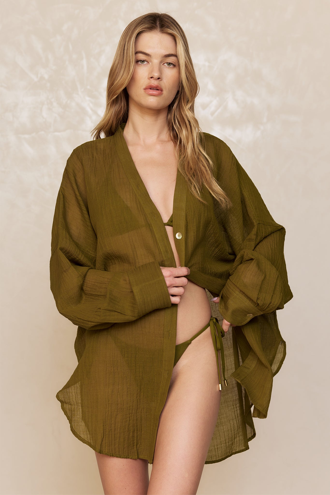 The ultimate beach to bar look can be achieved in the Barcelona Tunic. With an airy oversized fit, this transitional piece can be worn open, over your favorite swimwear or tied at the front with cute pants. Complete with side slits, flowy sleeves and center front seashell buttons.