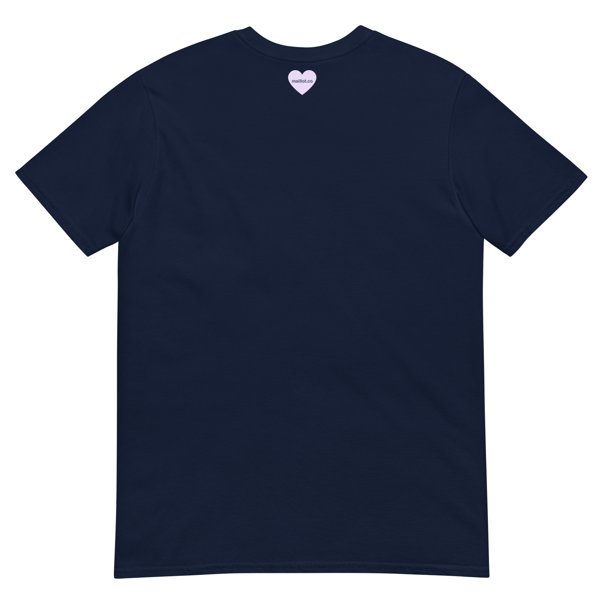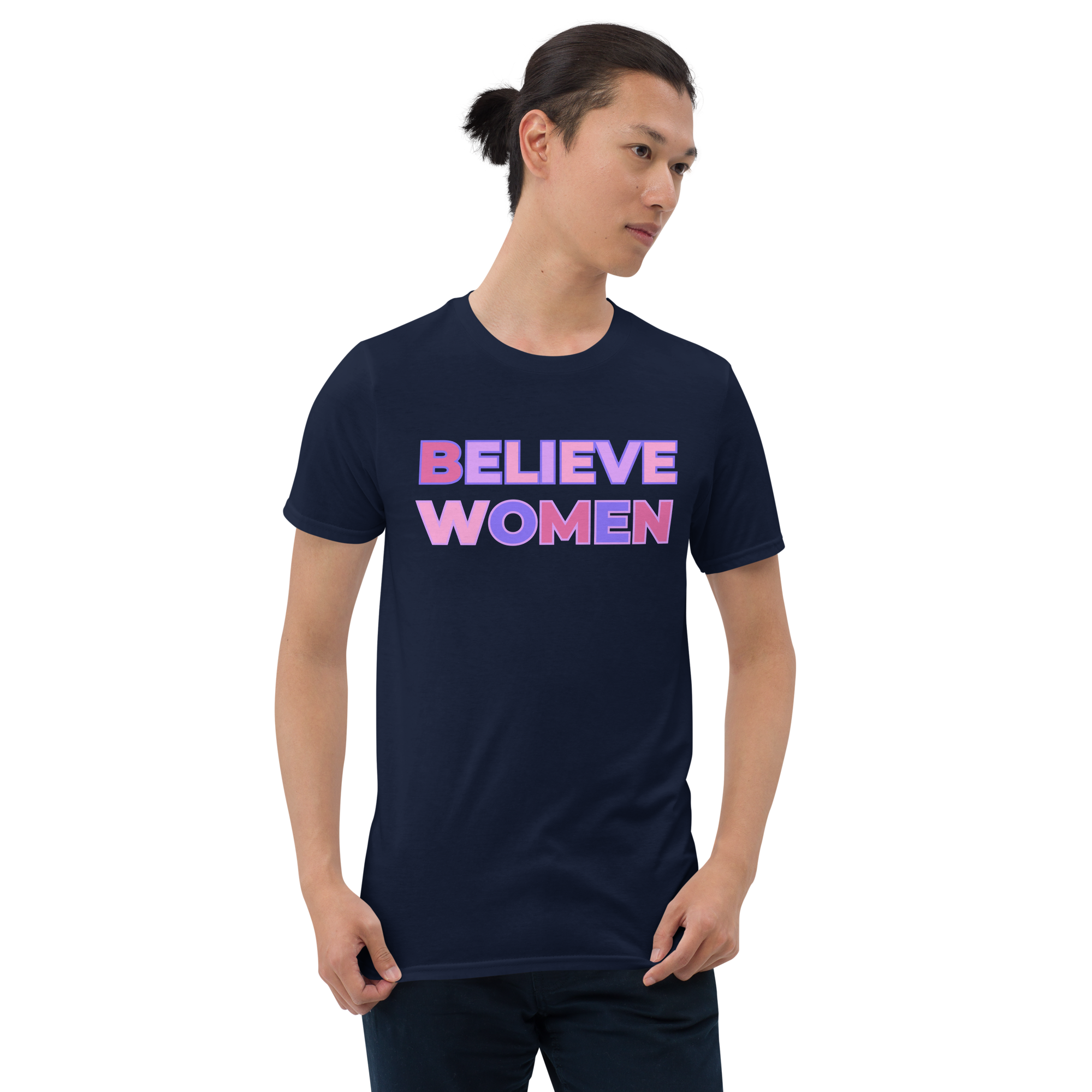 Navy blue crew neck short-sleeve t-shirt with pink & purple “BELIEVE WOMEN” slogan.