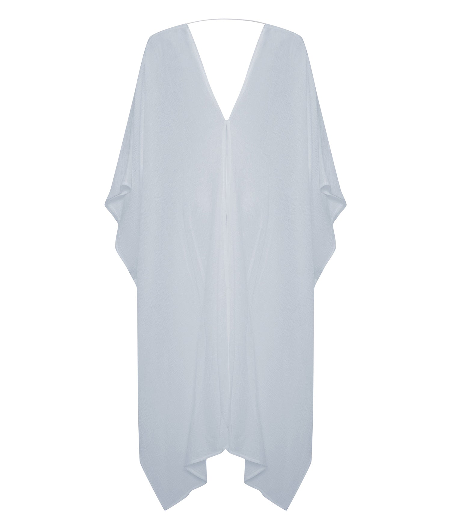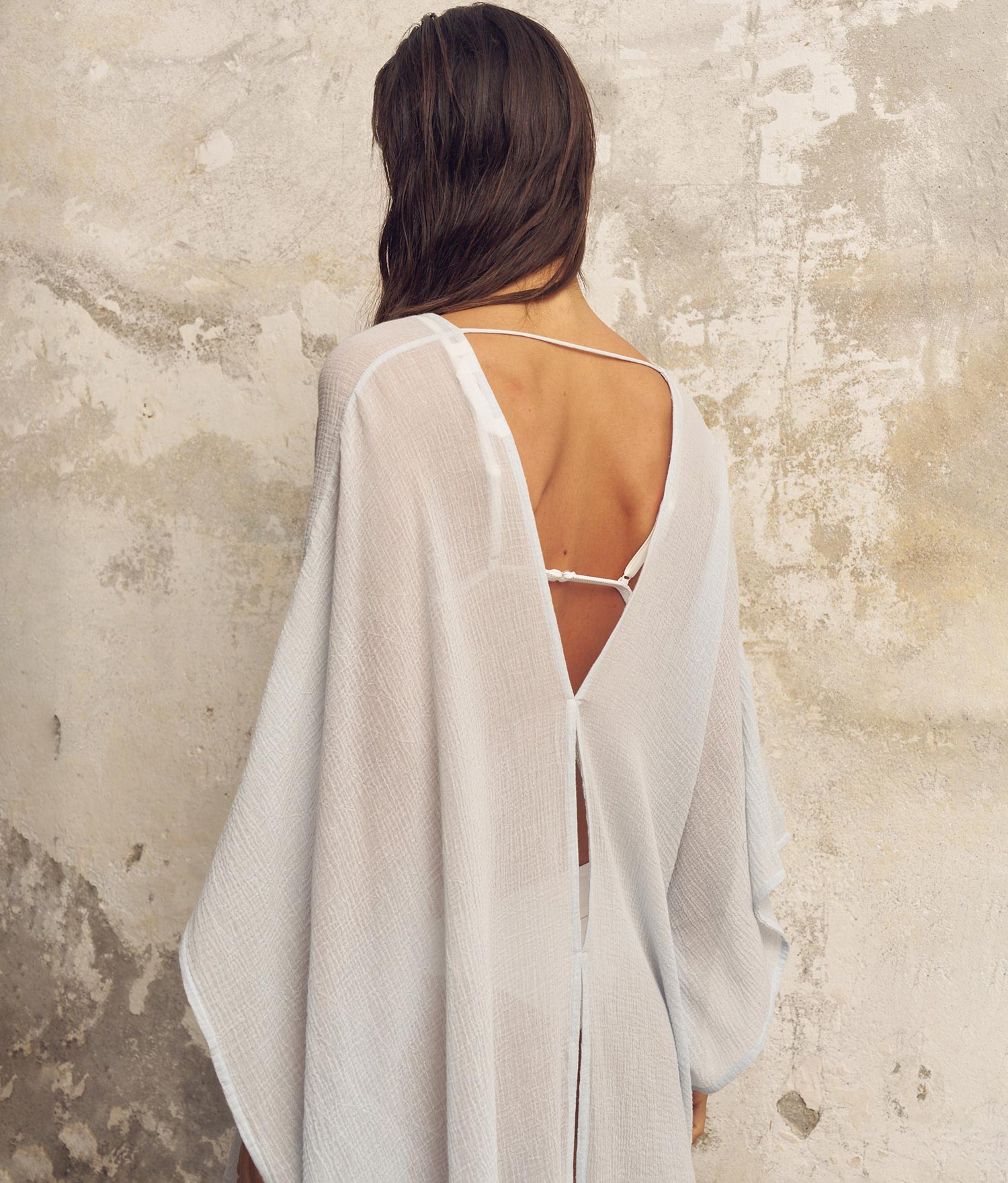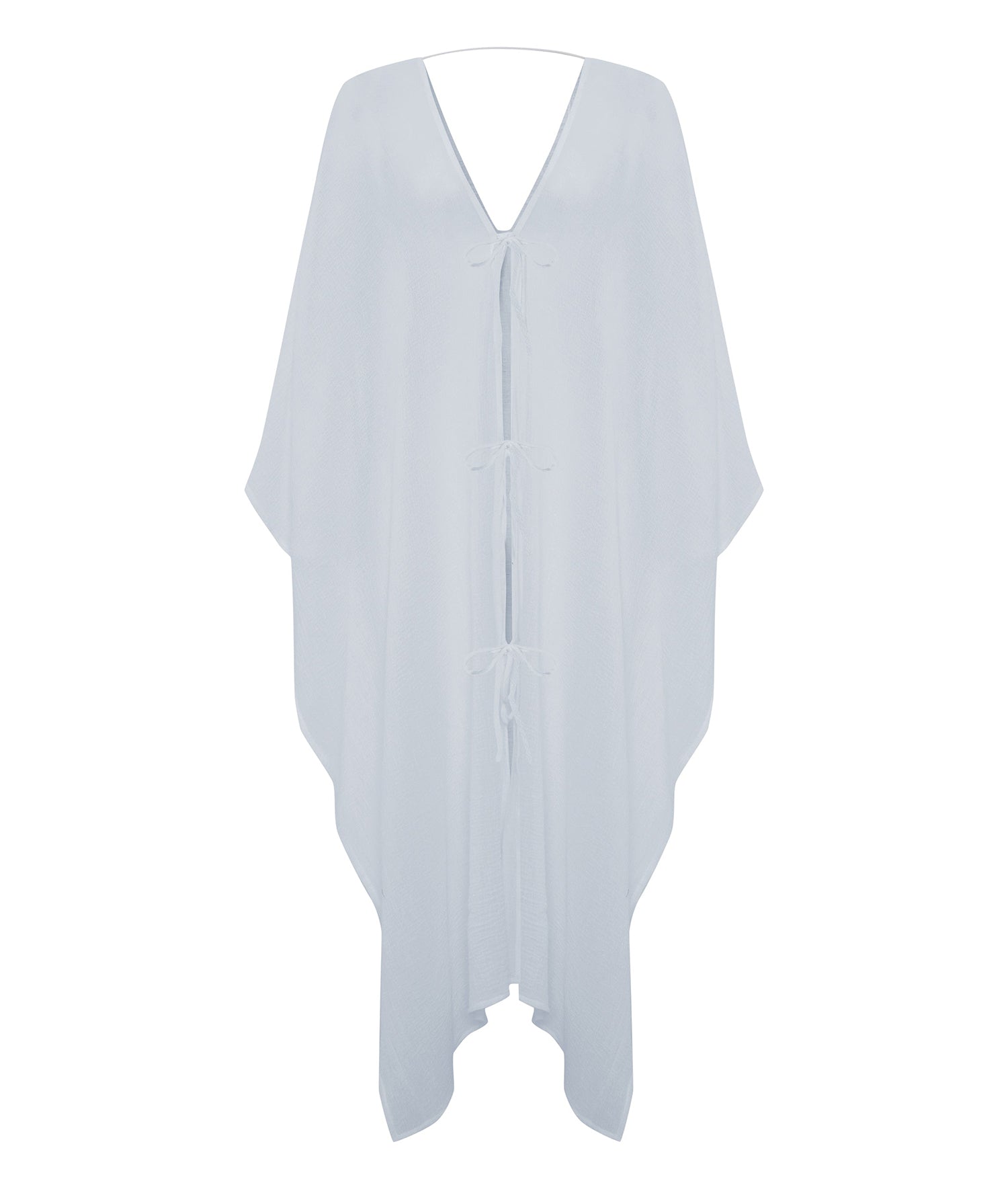 This kaftan features an ethereal, see-through design that drapes effortlessly over the body. Its delicate, ultra-flowy fabric offers a luxurious feel, perfect for breezy beach days or relaxed resort styling. Designed with a deep V-neckline, front tie closures, and an elegant open back with a subtle strap detail, it adds an air of understated sophistication. A truly special piece that embodies effortless elegance and versatility.
