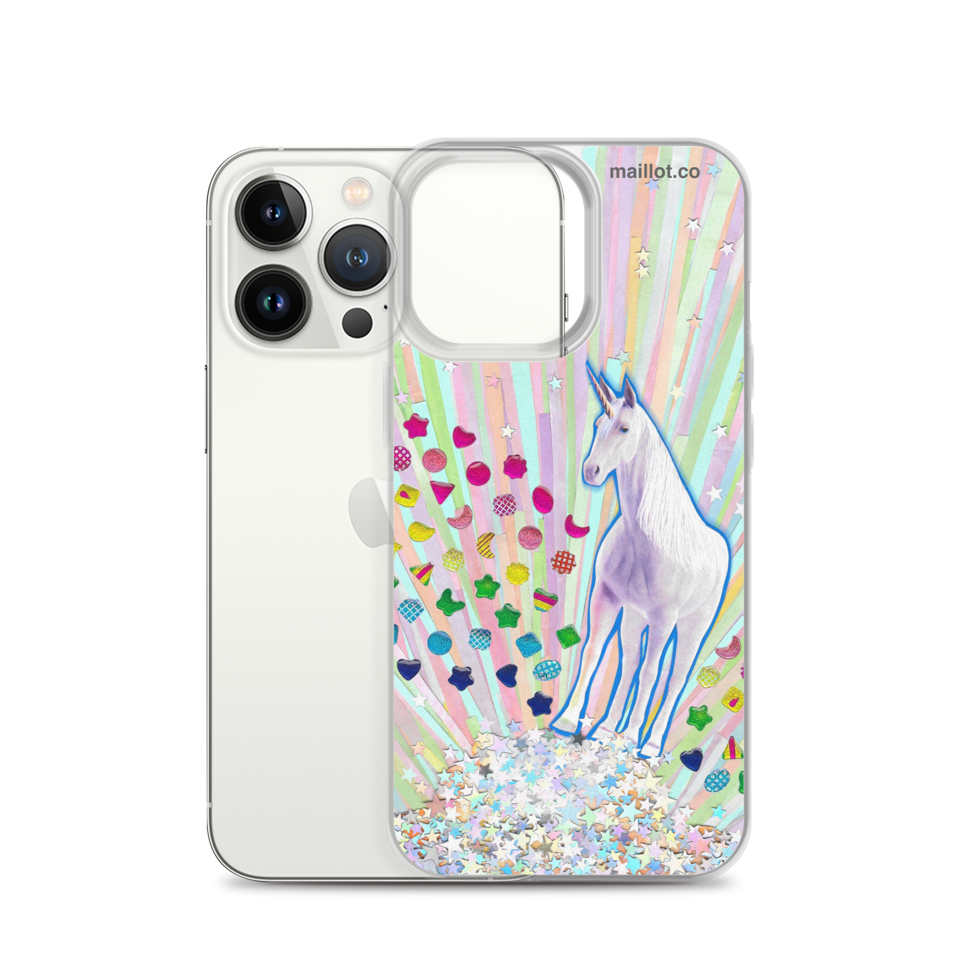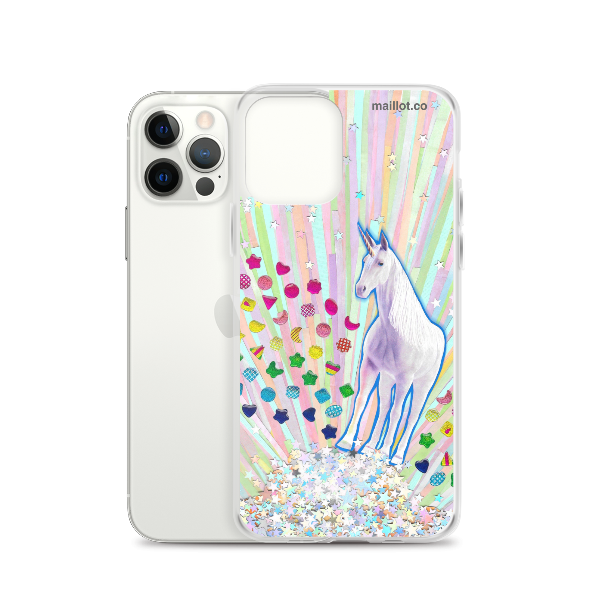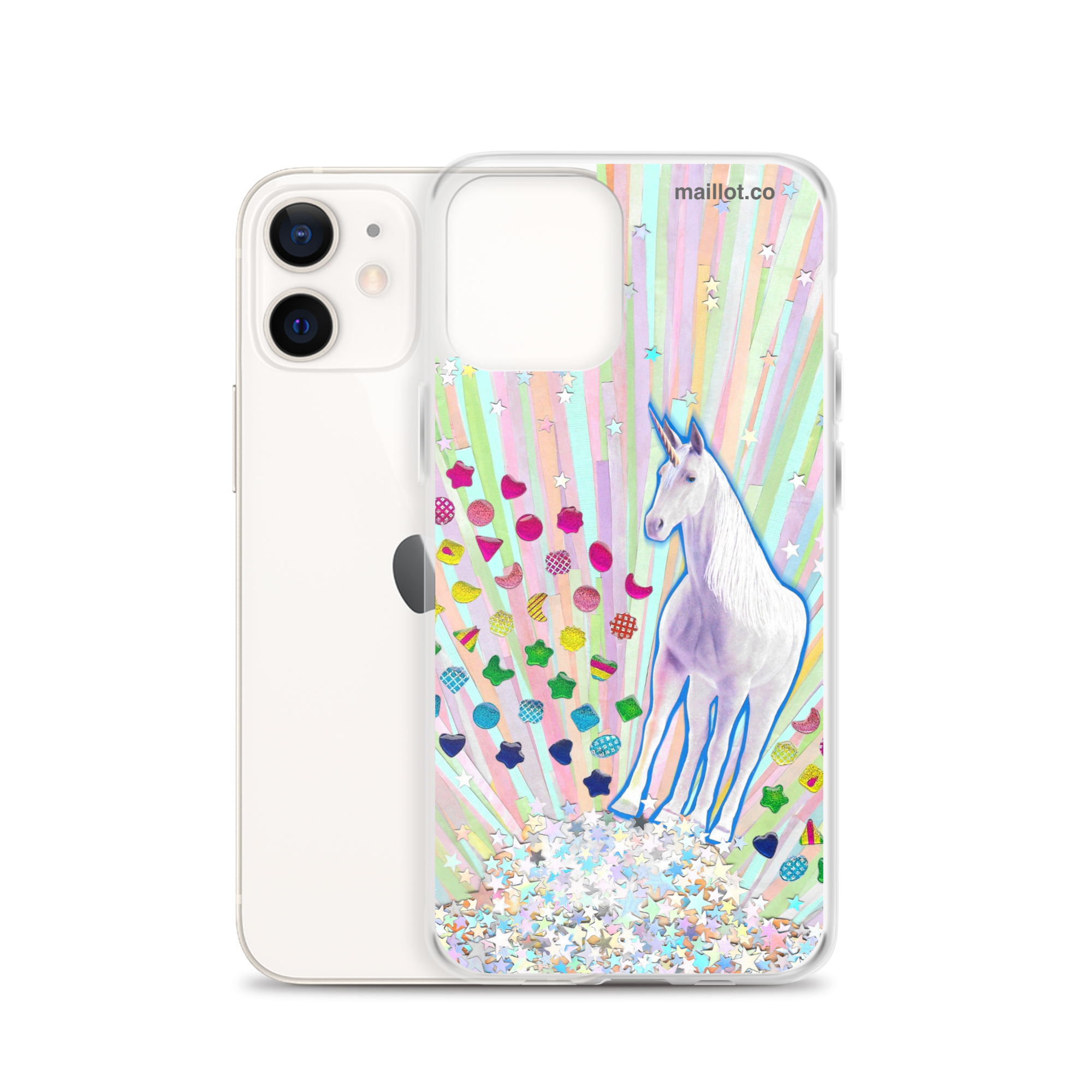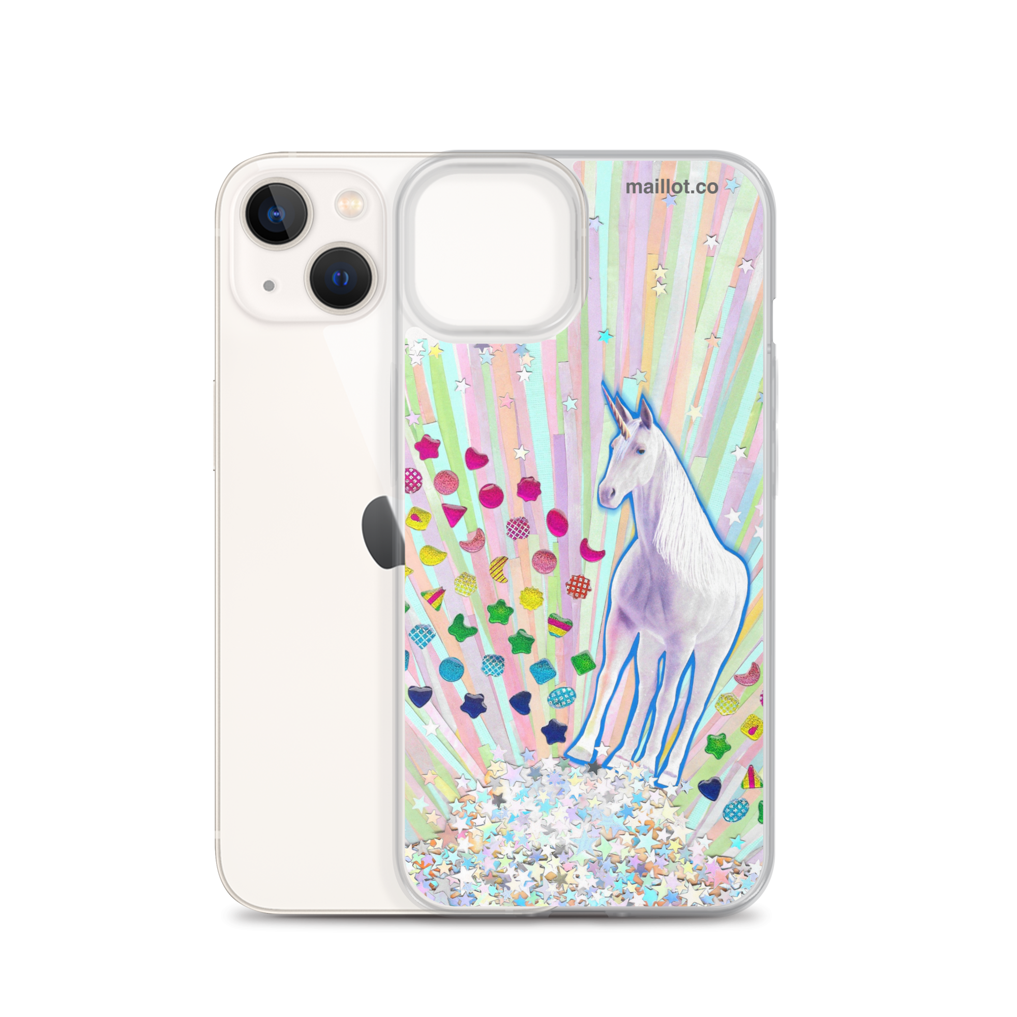 Clear matte iPhone case with original handmade collage artwork exclusive to maillot.co.