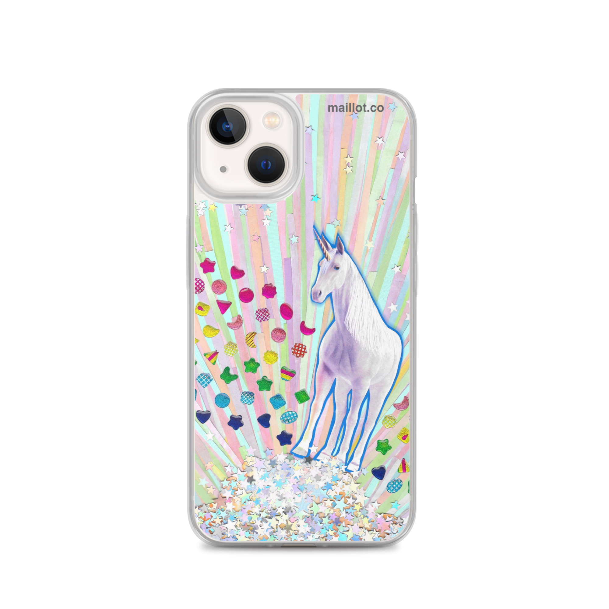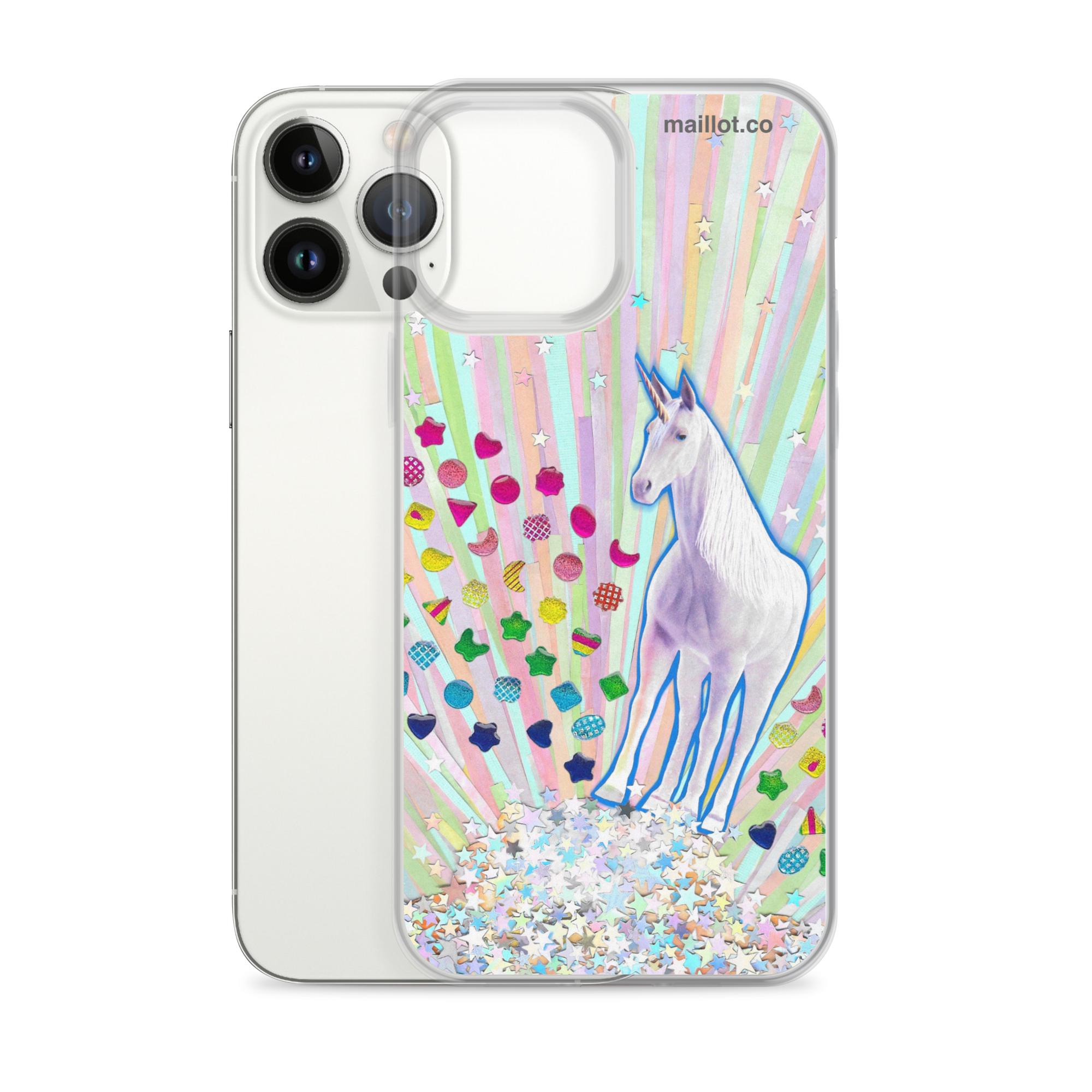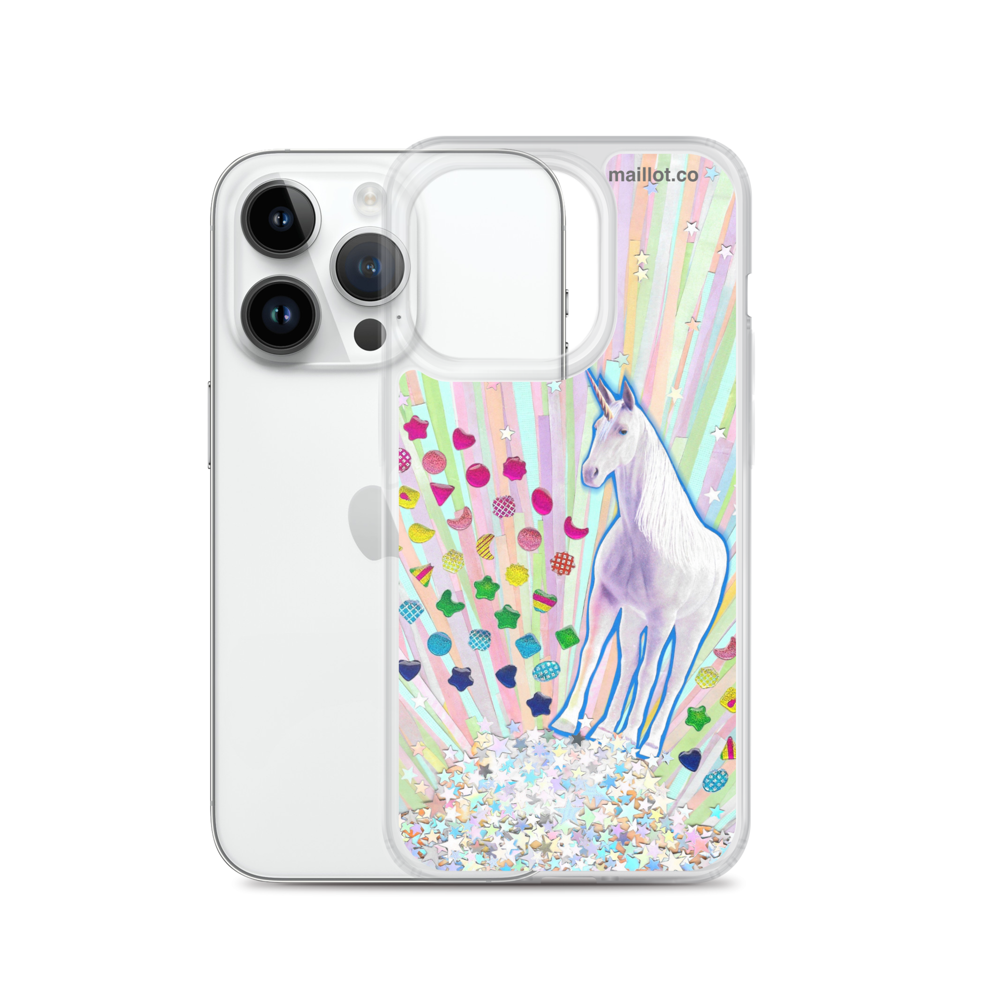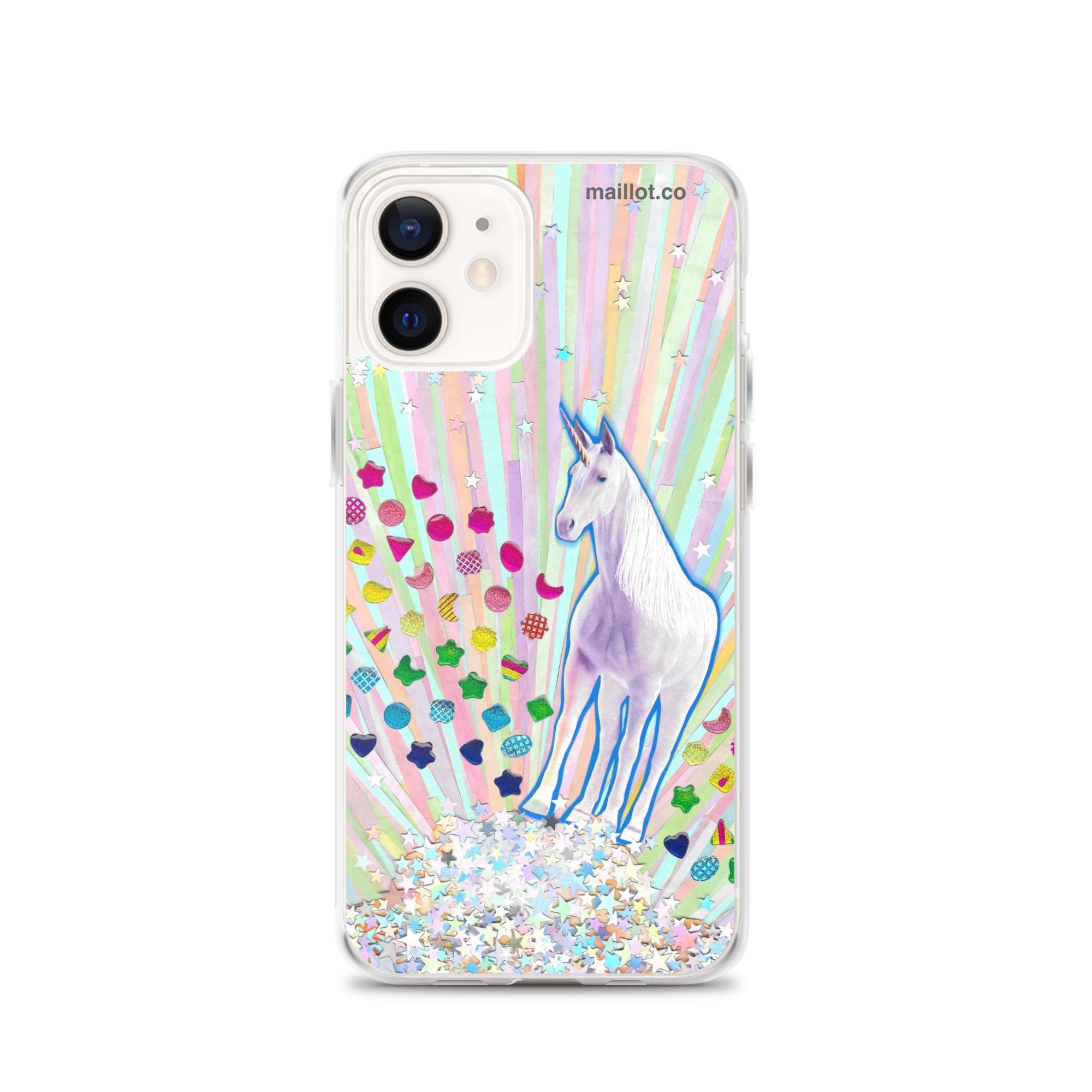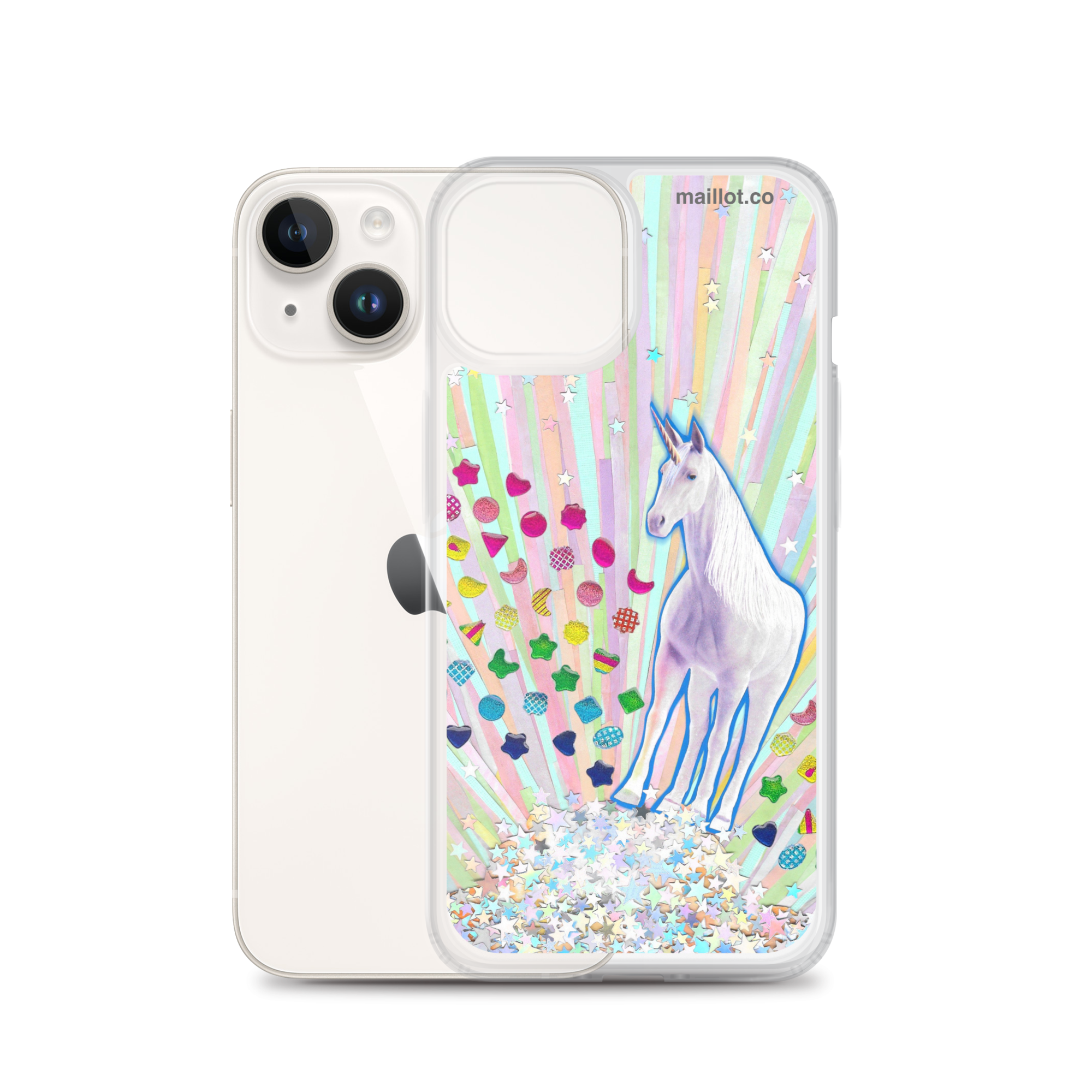 Clear matte iPhone case with original handmade collage artwork exclusive to maillot.co.