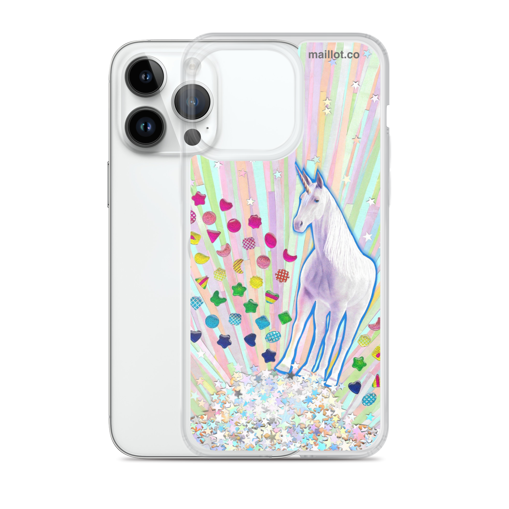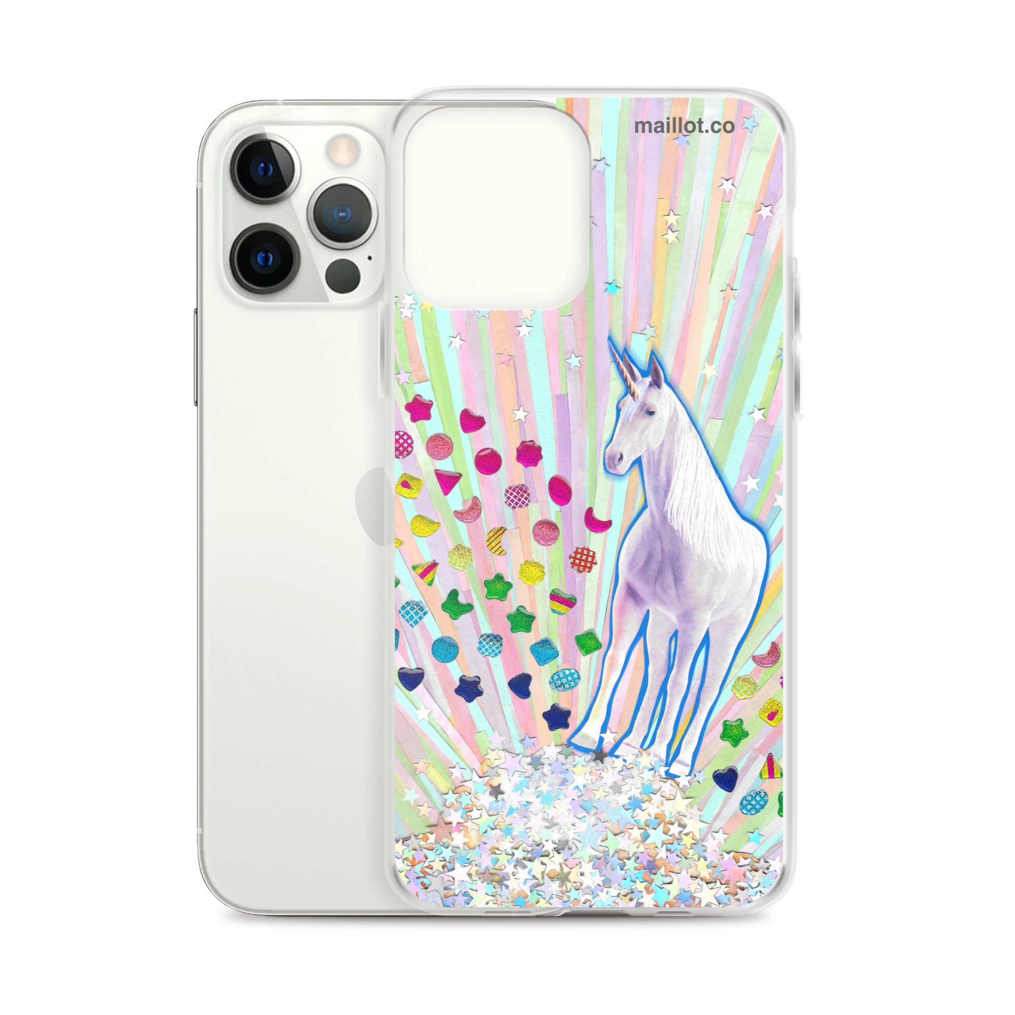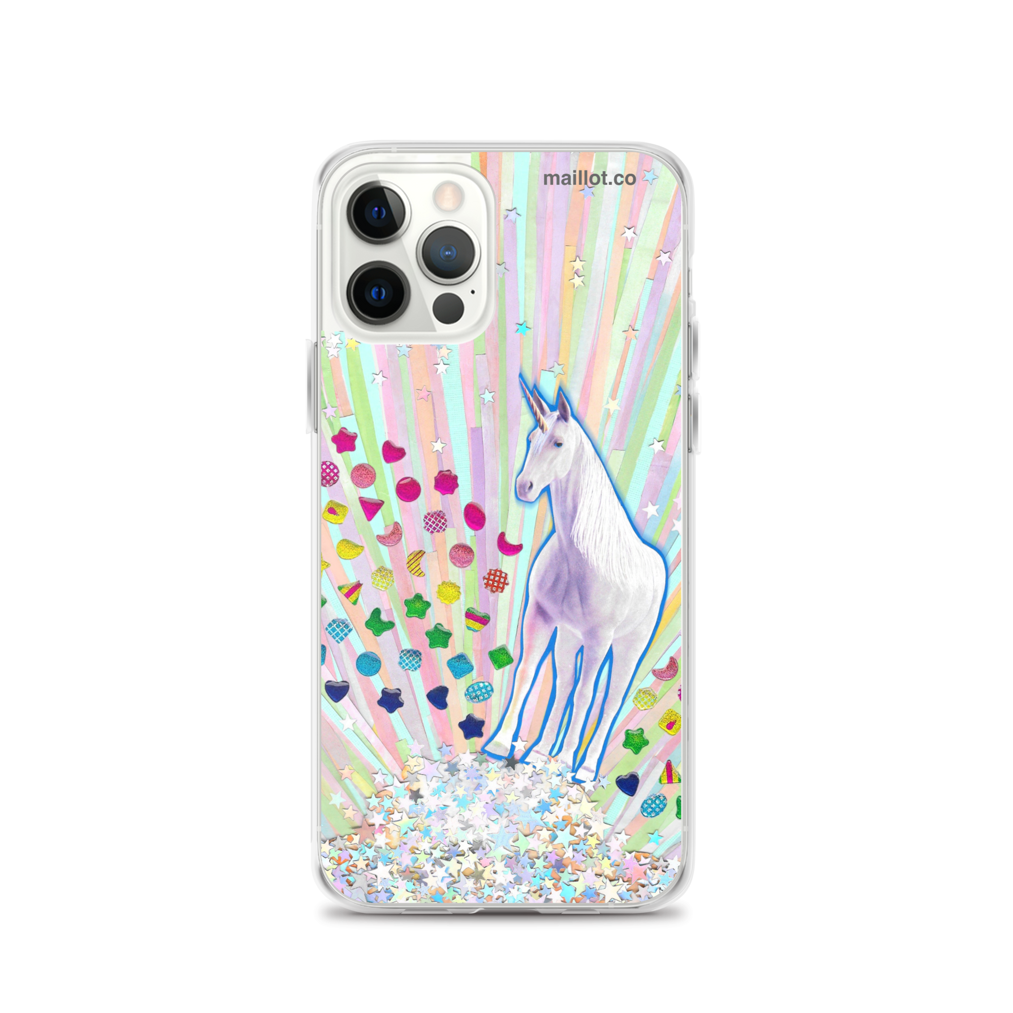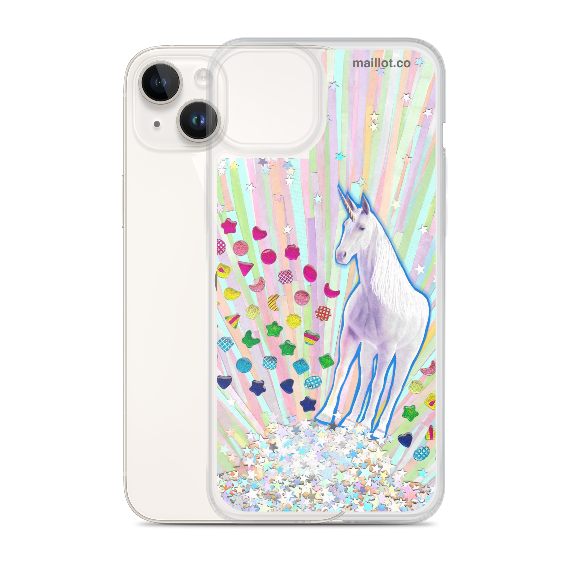 Clear matte iPhone case with original handmade collage artwork exclusive to maillot.co.