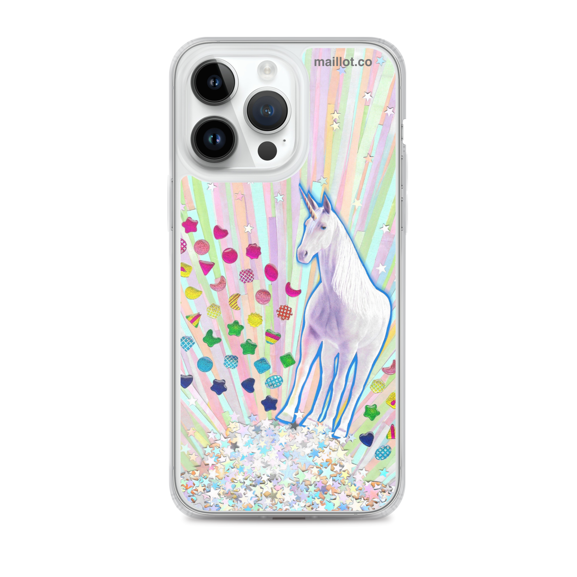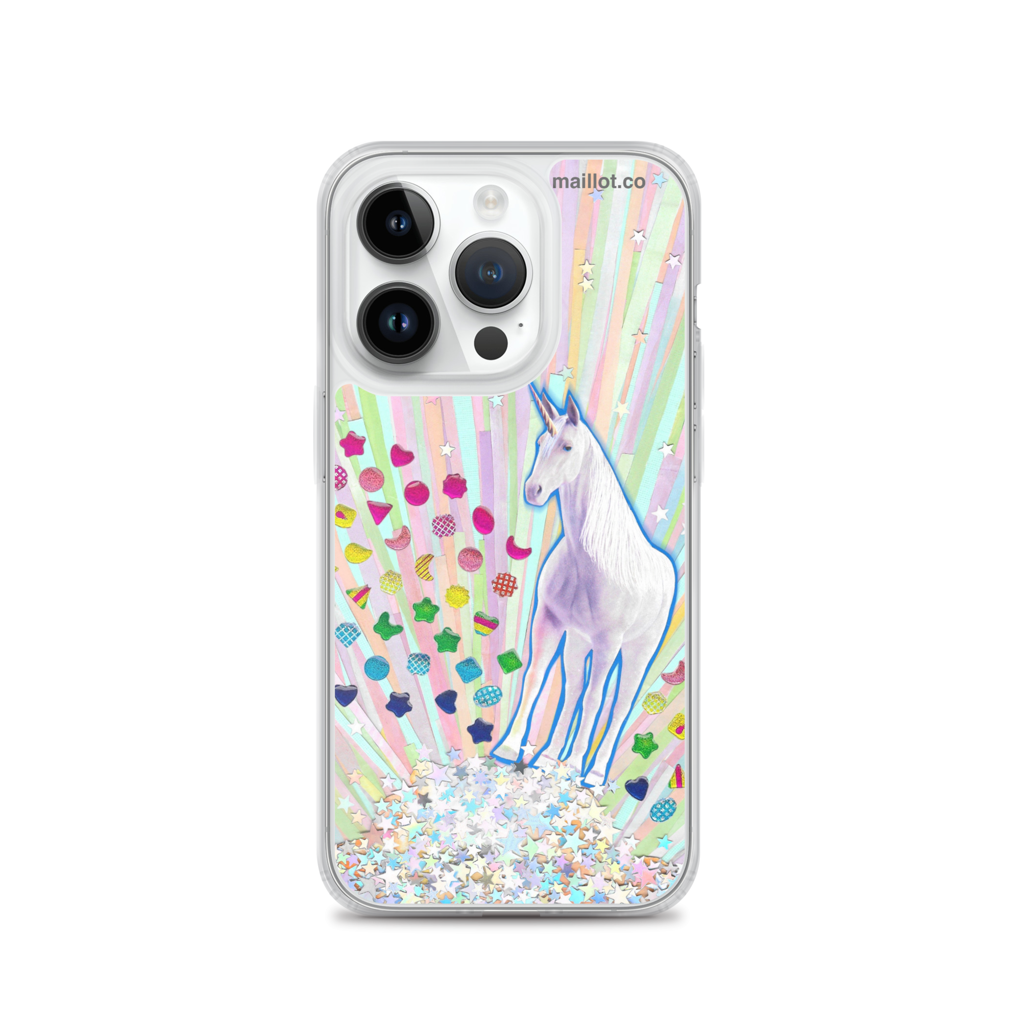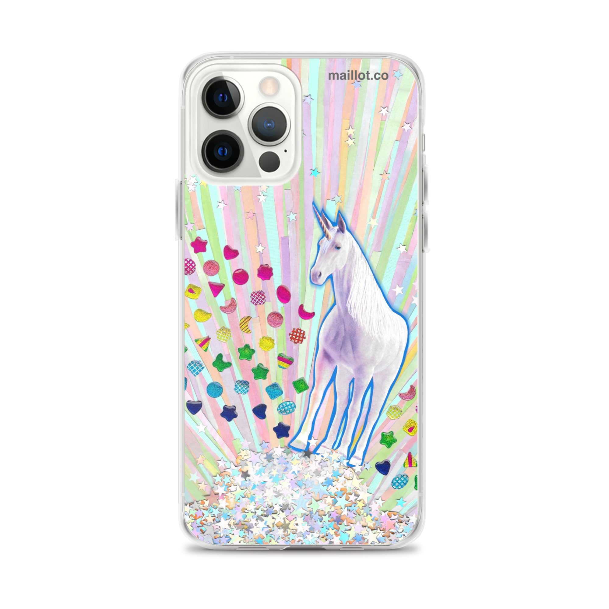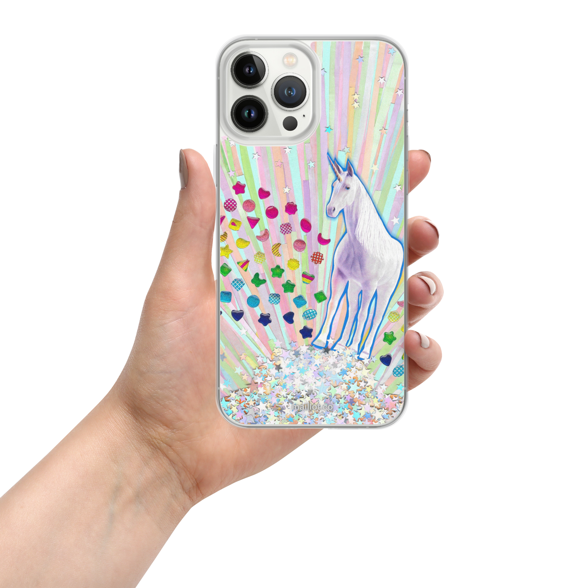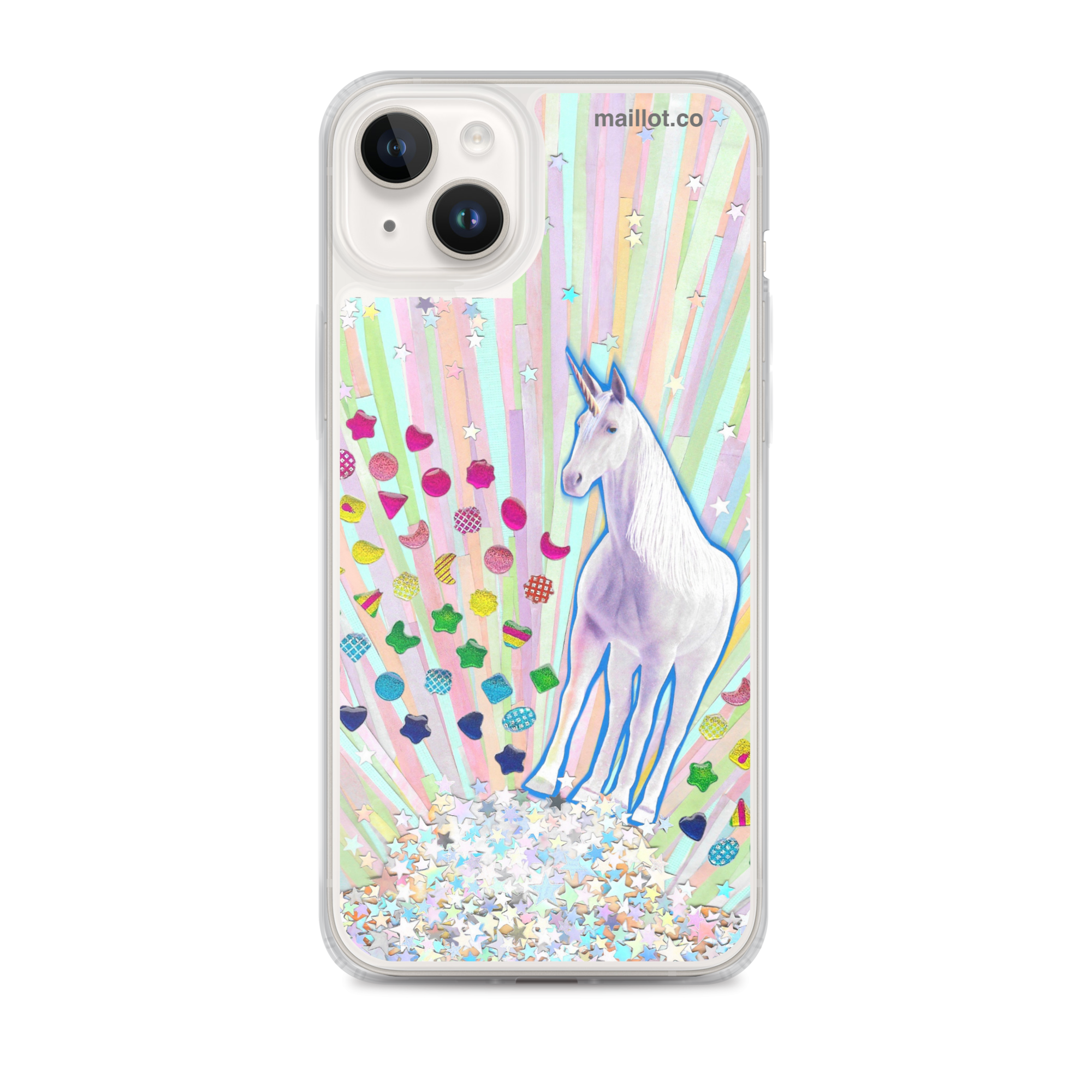 Clear matte iPhone case with original handmade collage artwork exclusive to maillot.co.