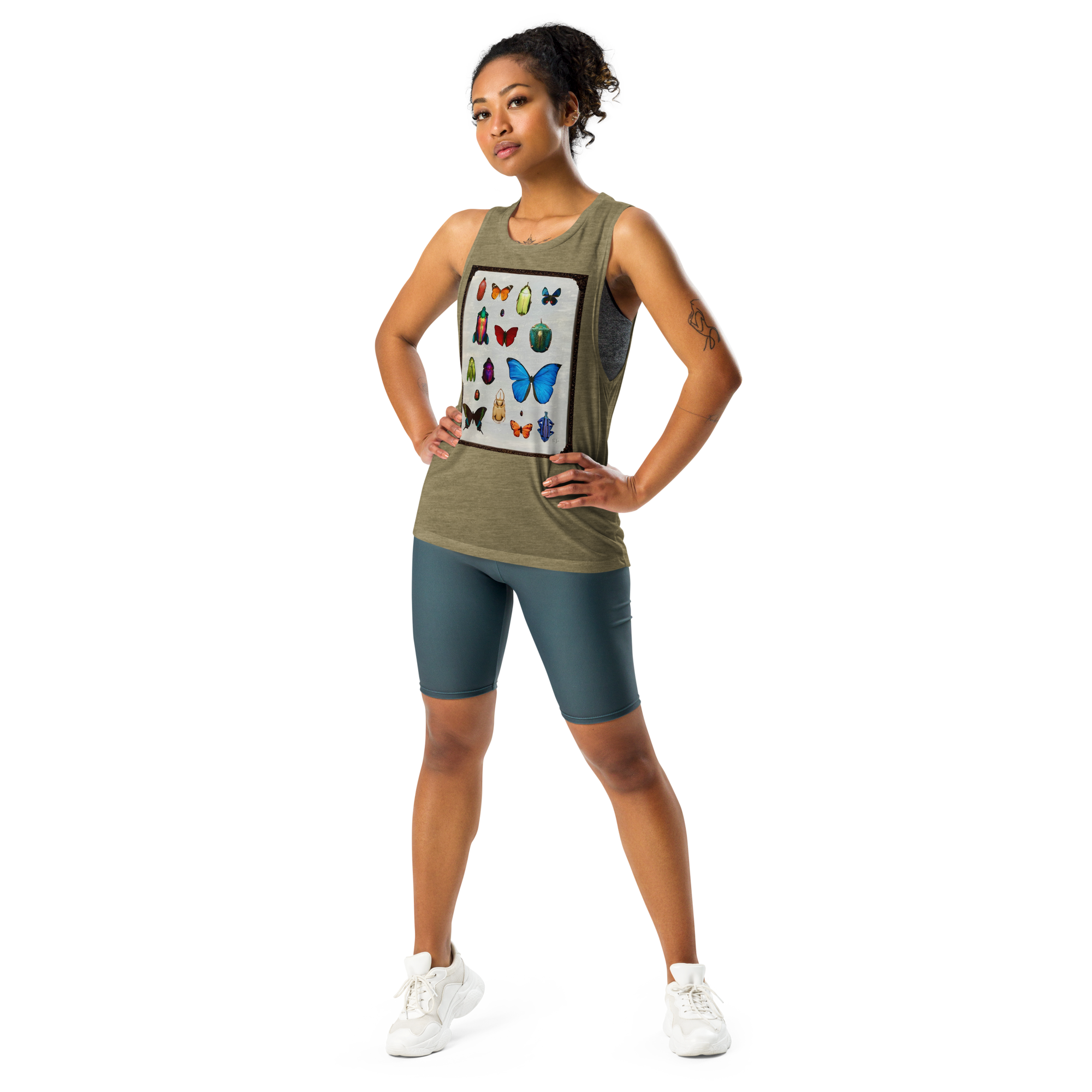 Olive green muscle tank top with original hand-cut collage artwork featuring an array of colorful insects.