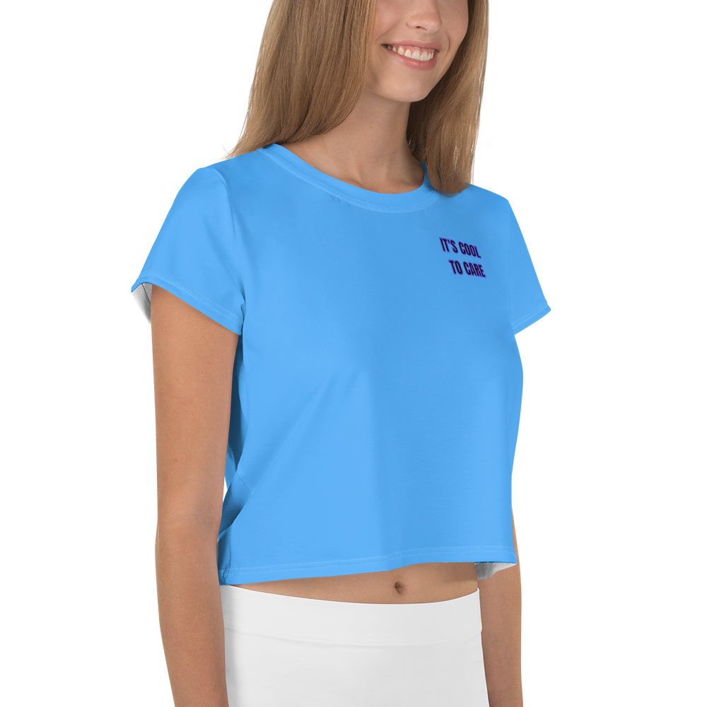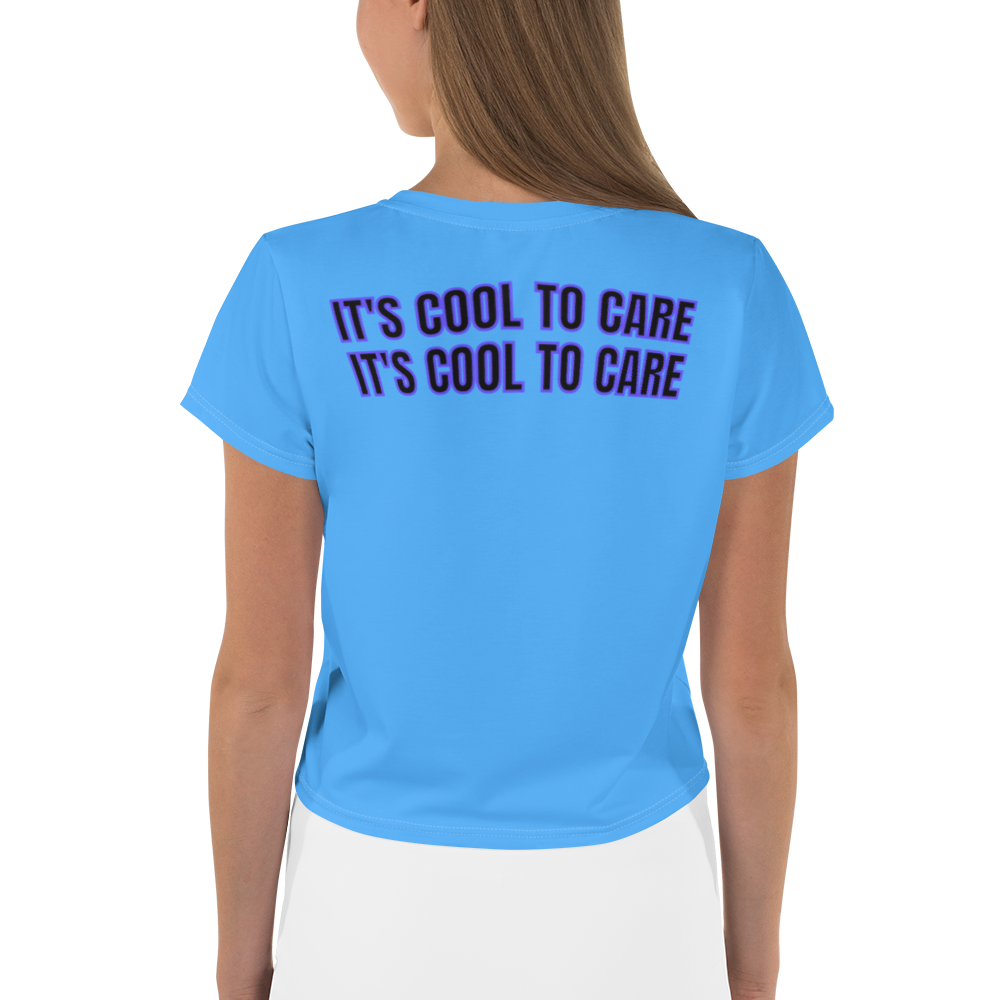 Bright blue short-sleeved cropped t-shirt with “IT’S COOL TO CARE” graphic slogan at the chest and back.