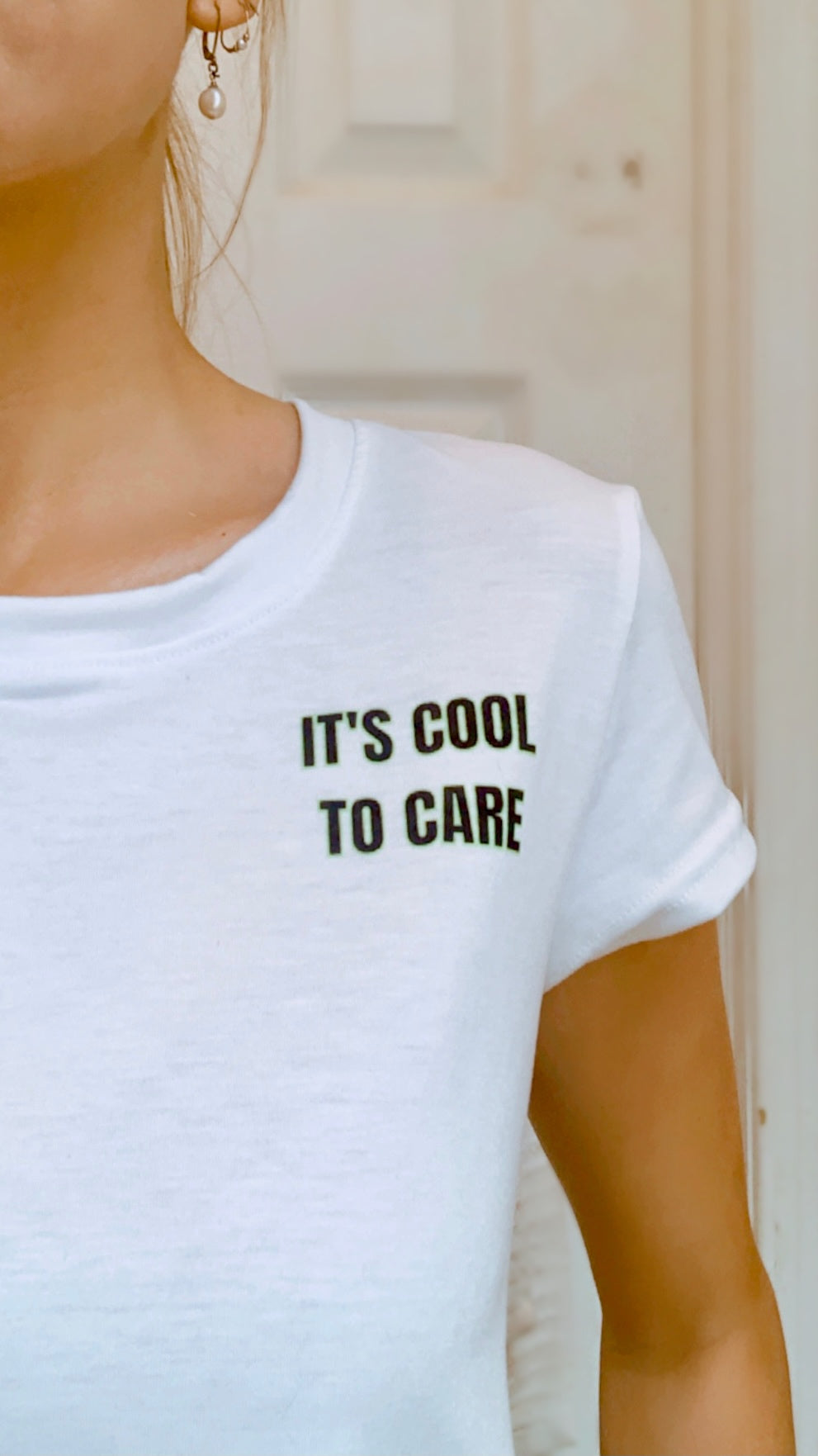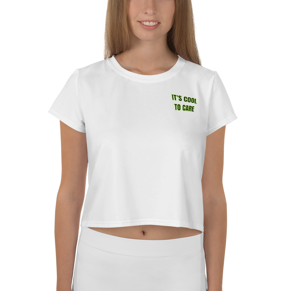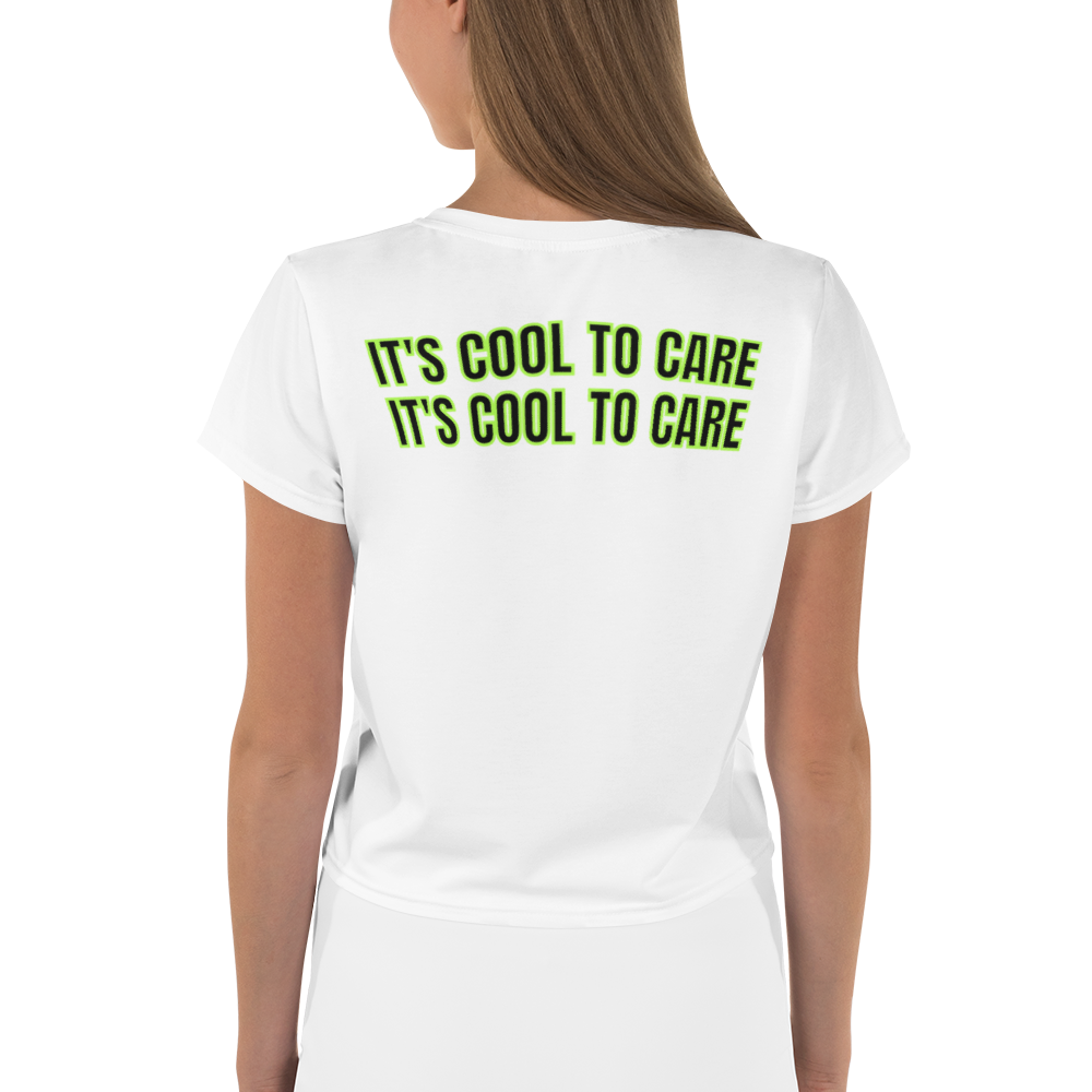 - The white short-sleeve cropped tee coordinates with ALL other pieces in our It’s Cool To Care collection. We especially love this tee with the coordinating Heart Print Joggers in White/Lime Green.