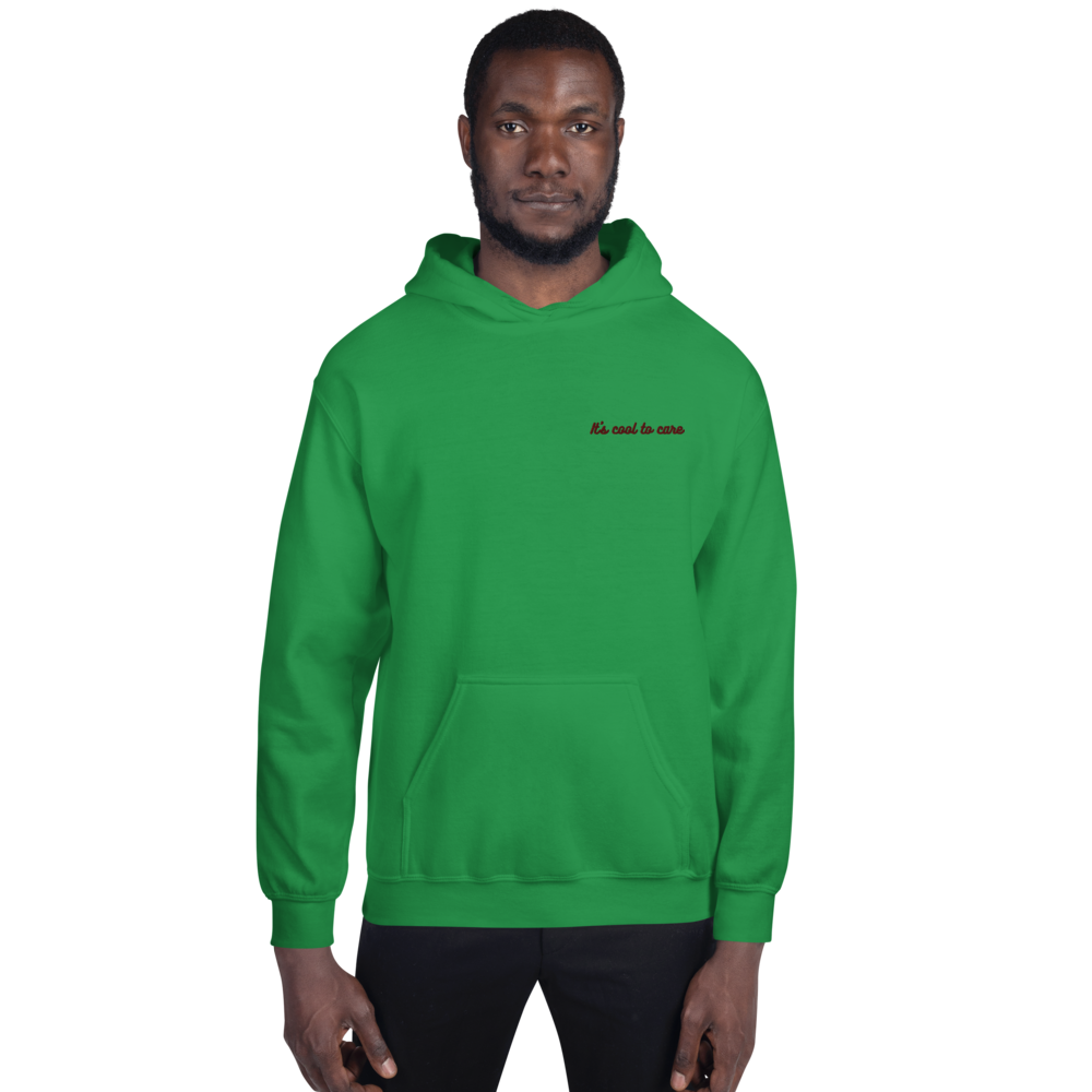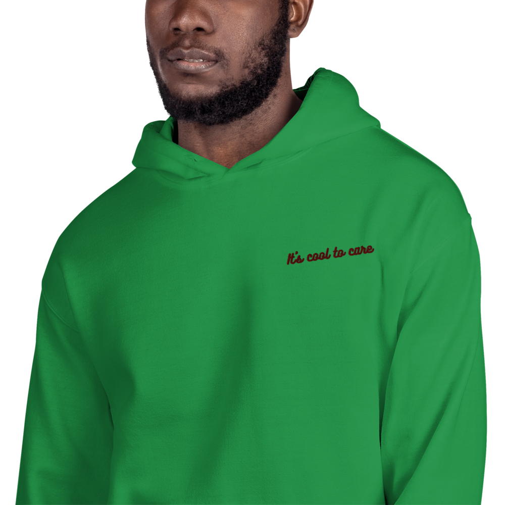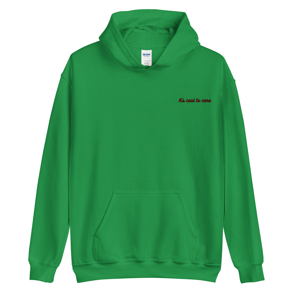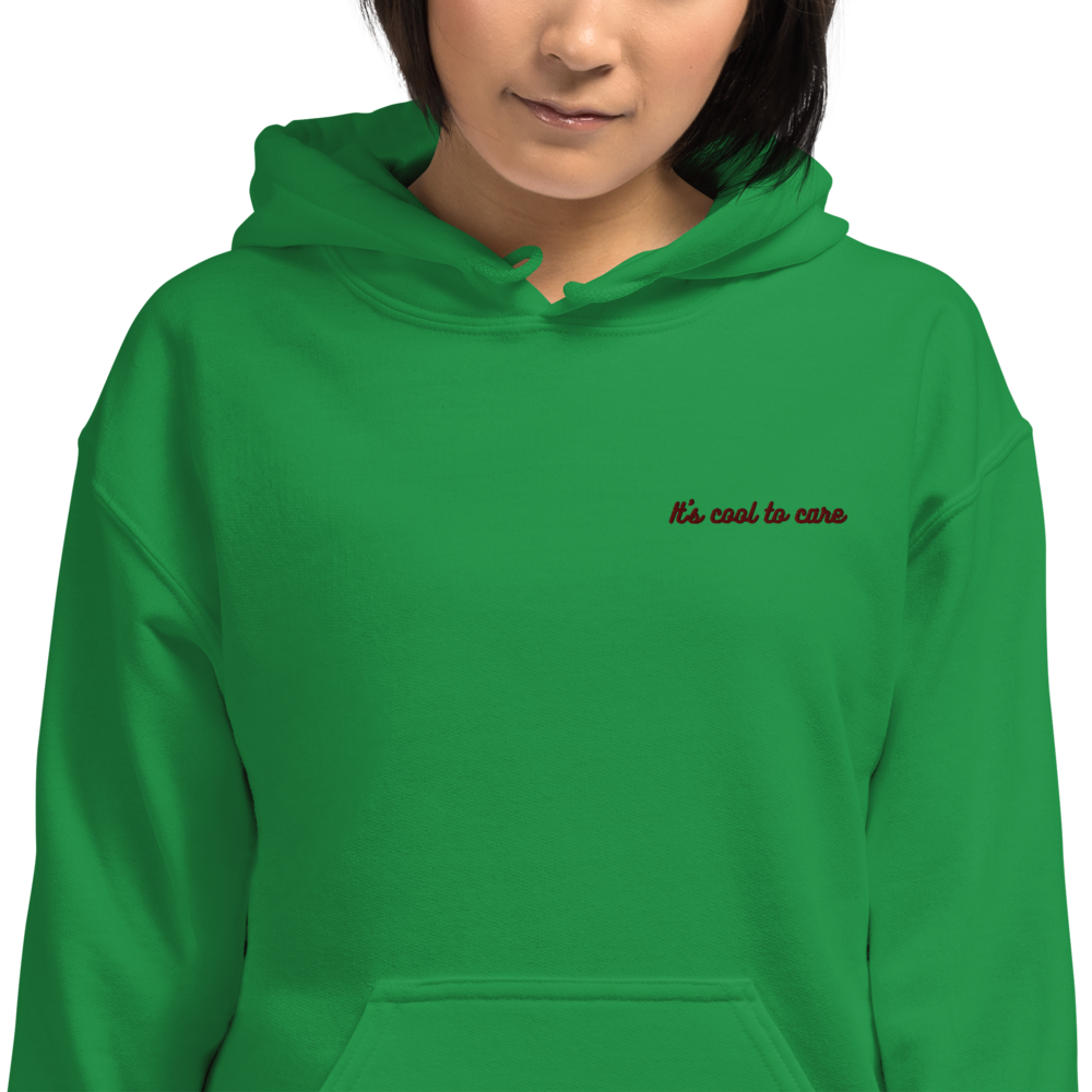 Bright green hooded sweatshirt with “It’s cool to care” embroidered on chest in contrast red cursive.