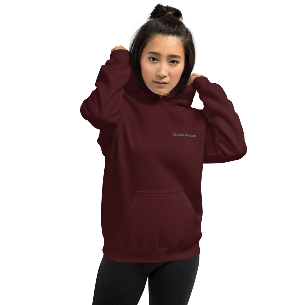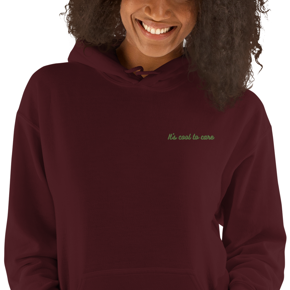 Maroon hooded sweatshirt with “It’s cool to care” embroidered on chest in bright green cursive.