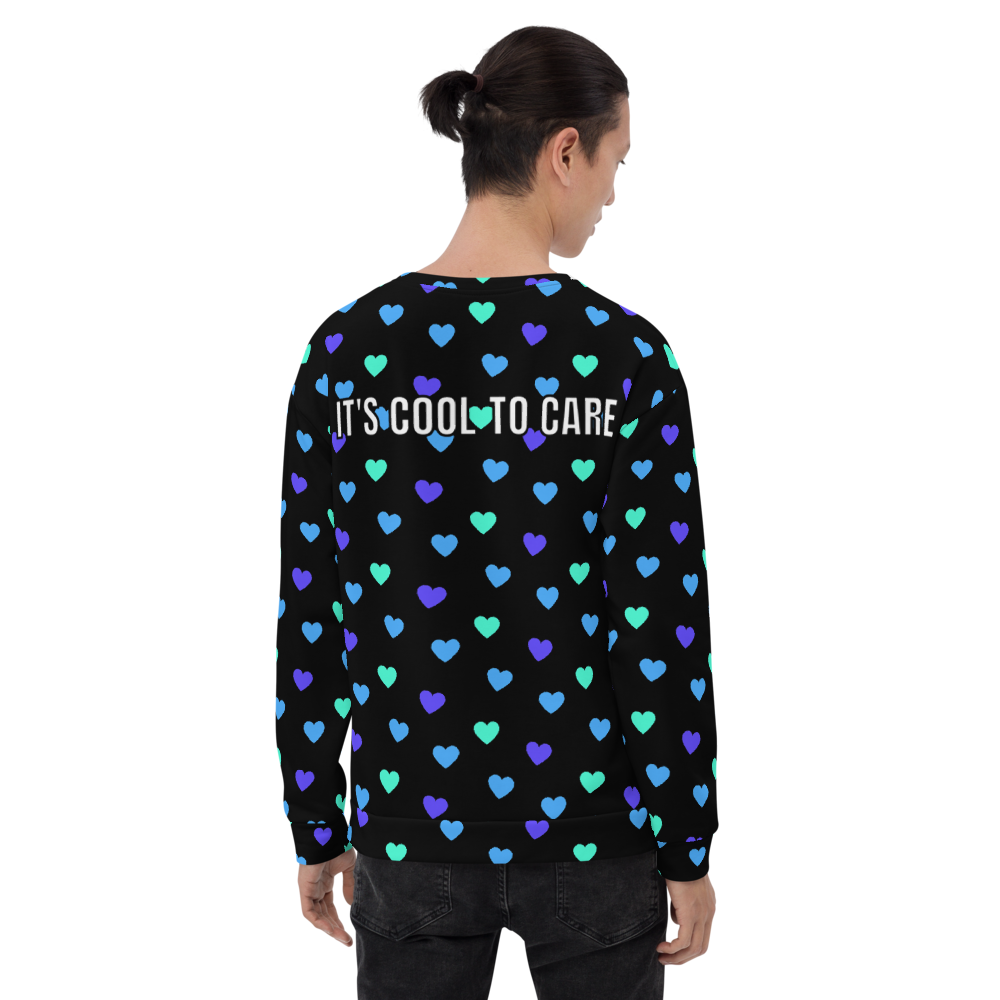 Soft black pull-over sweatshirt in multi-colored heart print with “IT’S COOL TO CARE” slogan at back.