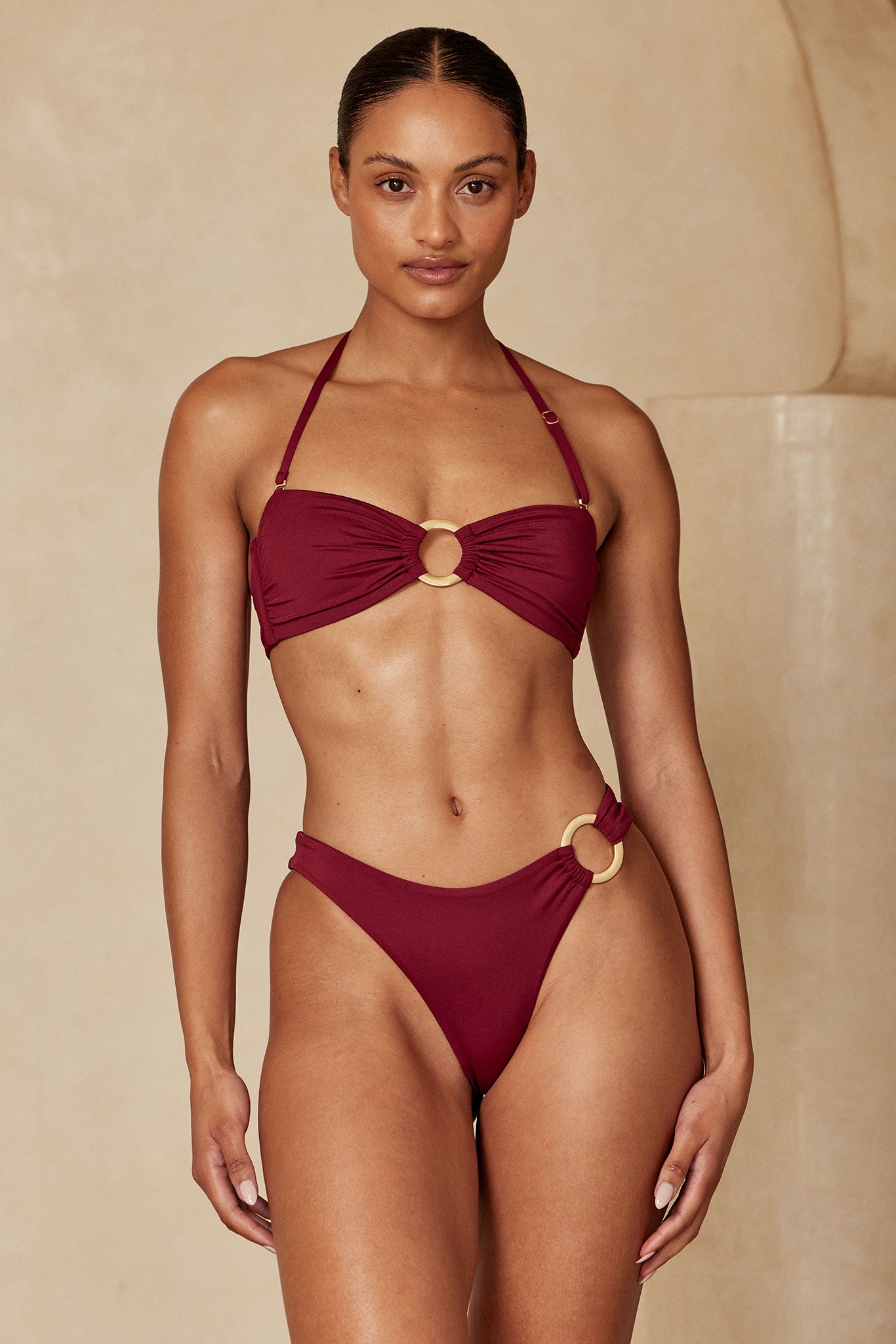 Soak in the sun while wearing the Costa Rica Top. This bandeau style top features a center front matte gold ring hardware and a removable halter strap that can be adjusted for the perfect amount of lift and support for all your beach adventures. Perfect for cup sizes A-D!
