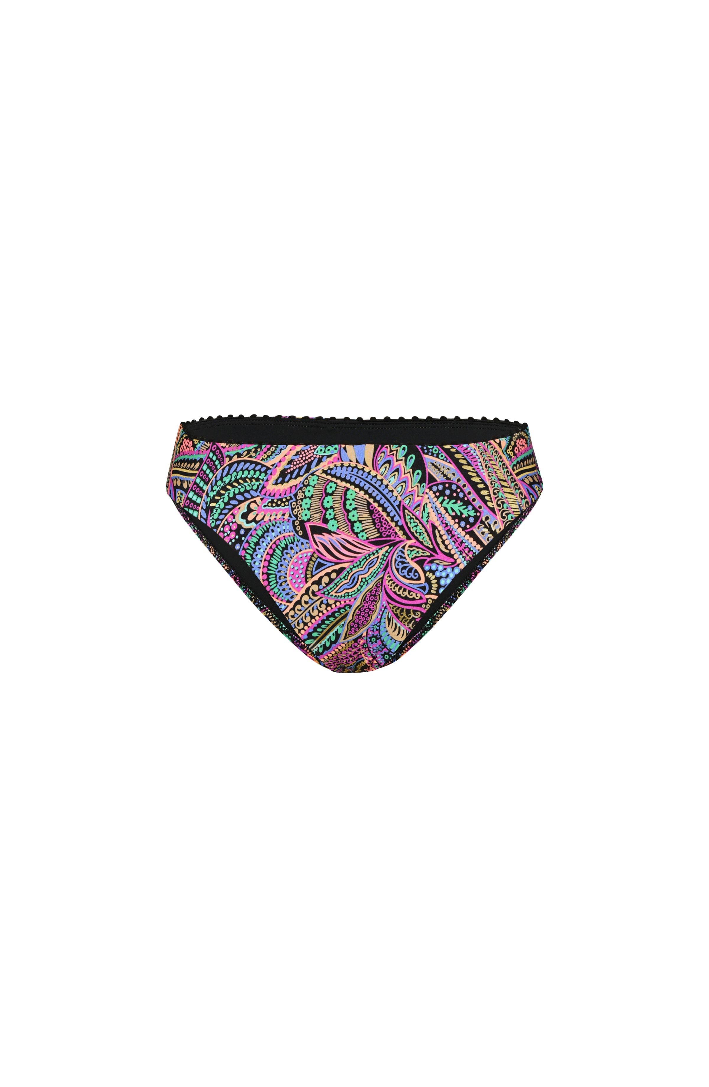 The Disco Dream foil print brings the party with its vibrant paisley pattern, swirling in shades of bright violet, pink, green, and black. This hipster bottom features pom-pom trim and moderate rear coverage to keep you comfortable yet feeling confident.