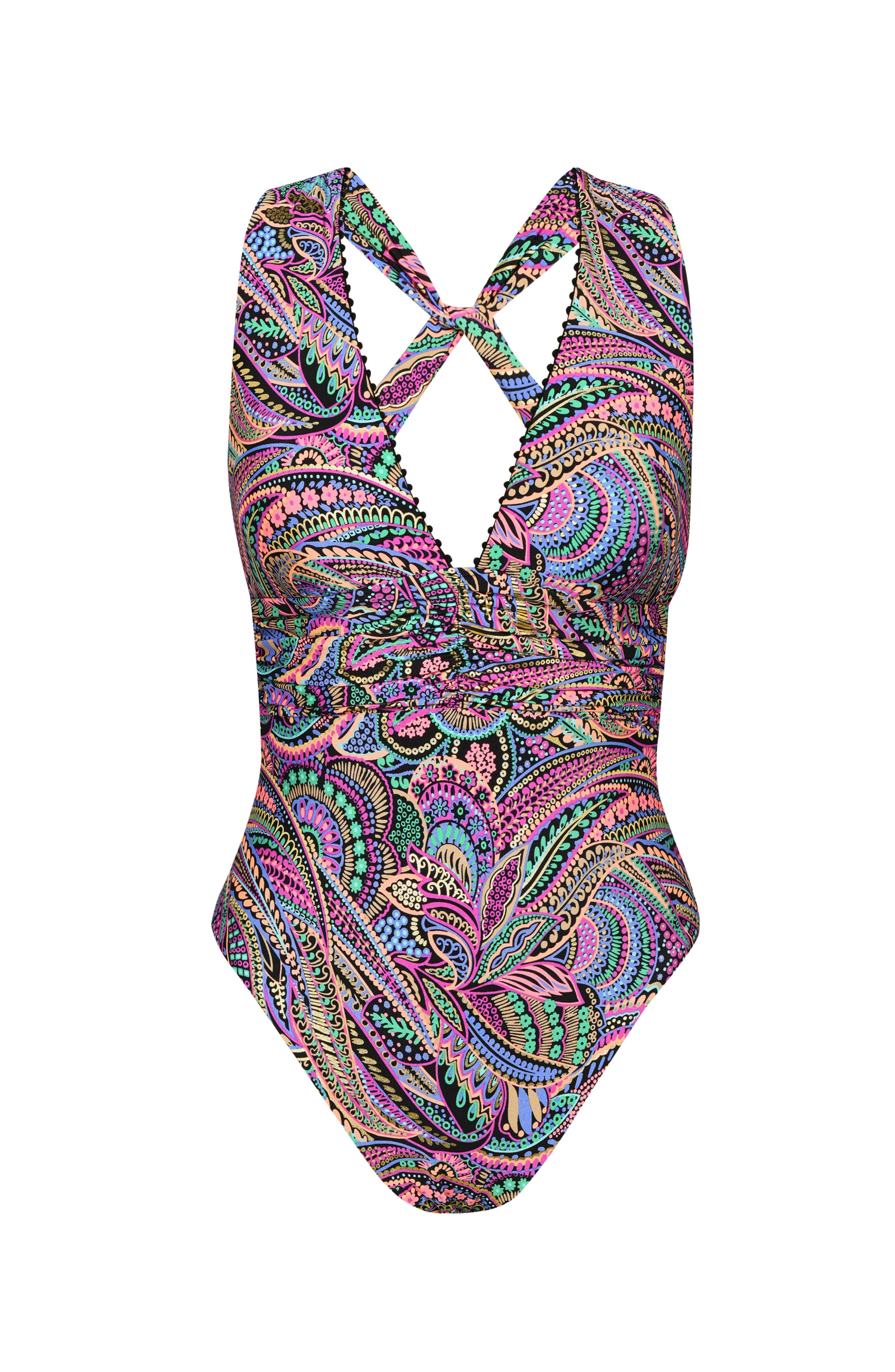 The Disco Dream foil print brings the party with its vibrant paisley pattern, swirling in shades of bright violet, pink, green, and black. This V-plunge one piece trimmed with pom-poms, features removable cups, shaping control, and a plunging v-neckline that accentuates the bust, offering just-right coverage to keep the look sultry. Twist back straps and moderate rear coverage ensure a comfortable and confident fit.