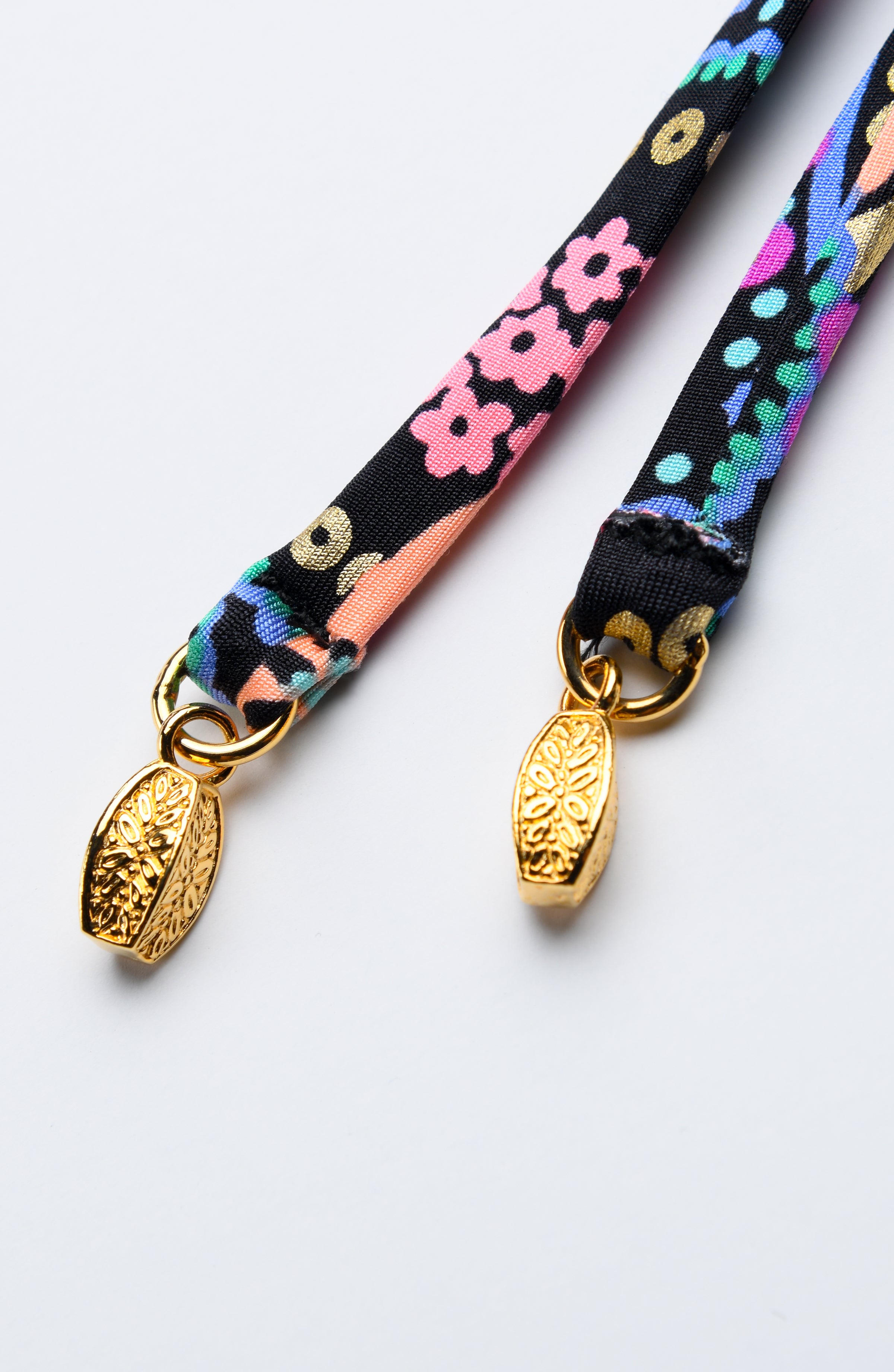 The Disco Dream foil print brings the party with its vibrant paisley pattern, swirling in shades of bright violet, pink, green, and black. This top shines with a chic triangle silhouette, trimmed with black pom-poms, and a plunging V-neck with gold floral lantern charms. For extra flair, the halter-style straps loop around the neck and tie into a flirty triangle shape.