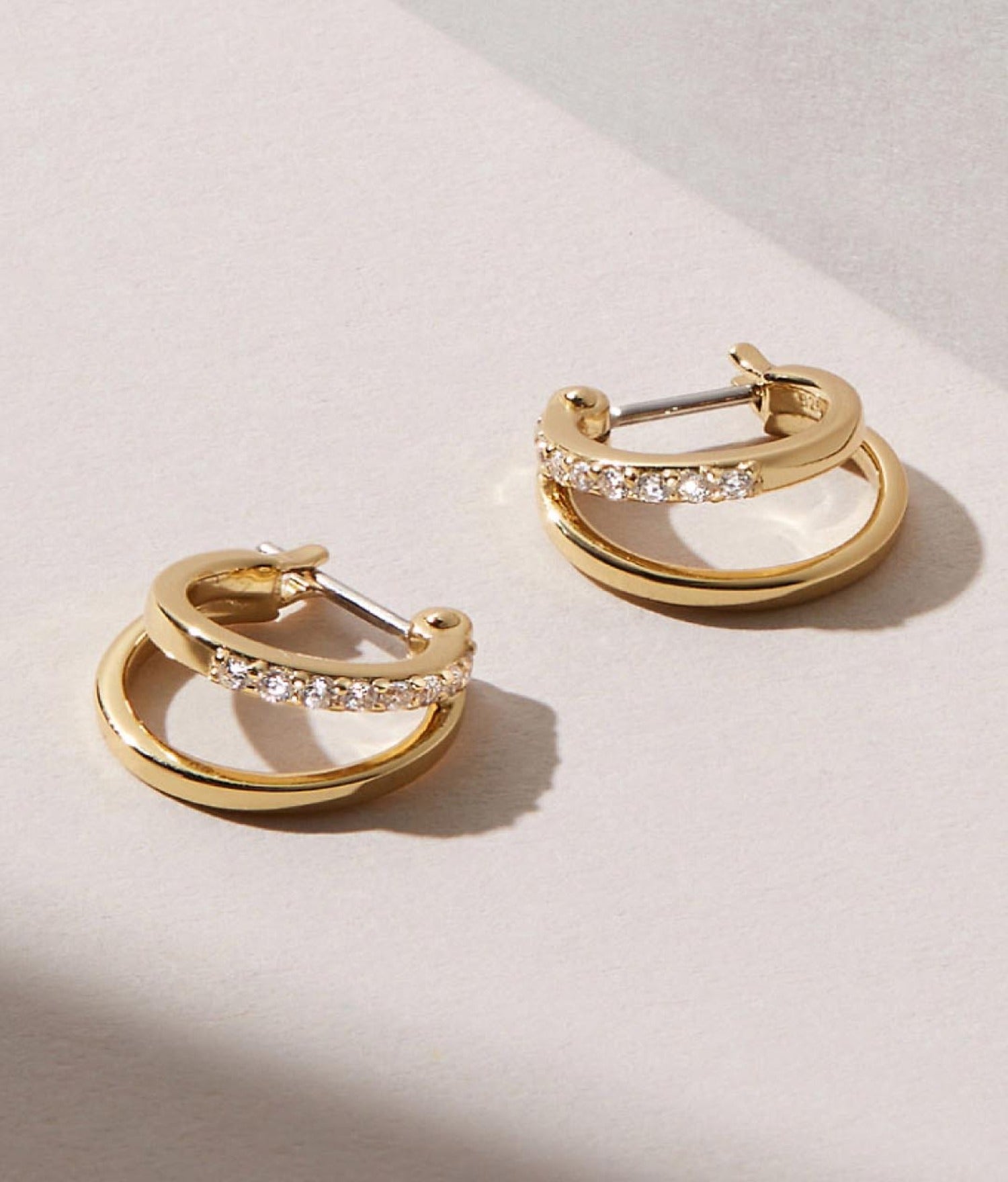 Getting a modern stacked look has never been easier – these double hoop earrings with sparkling cubic zirconia gems are this season's winning accessory. Crafted in 100% recycled Sterling Silver and dipped in 14k gold, these light double gold hoops will perfectly complement your style. Pair them with a dainty layered necklace to add volume to your look.