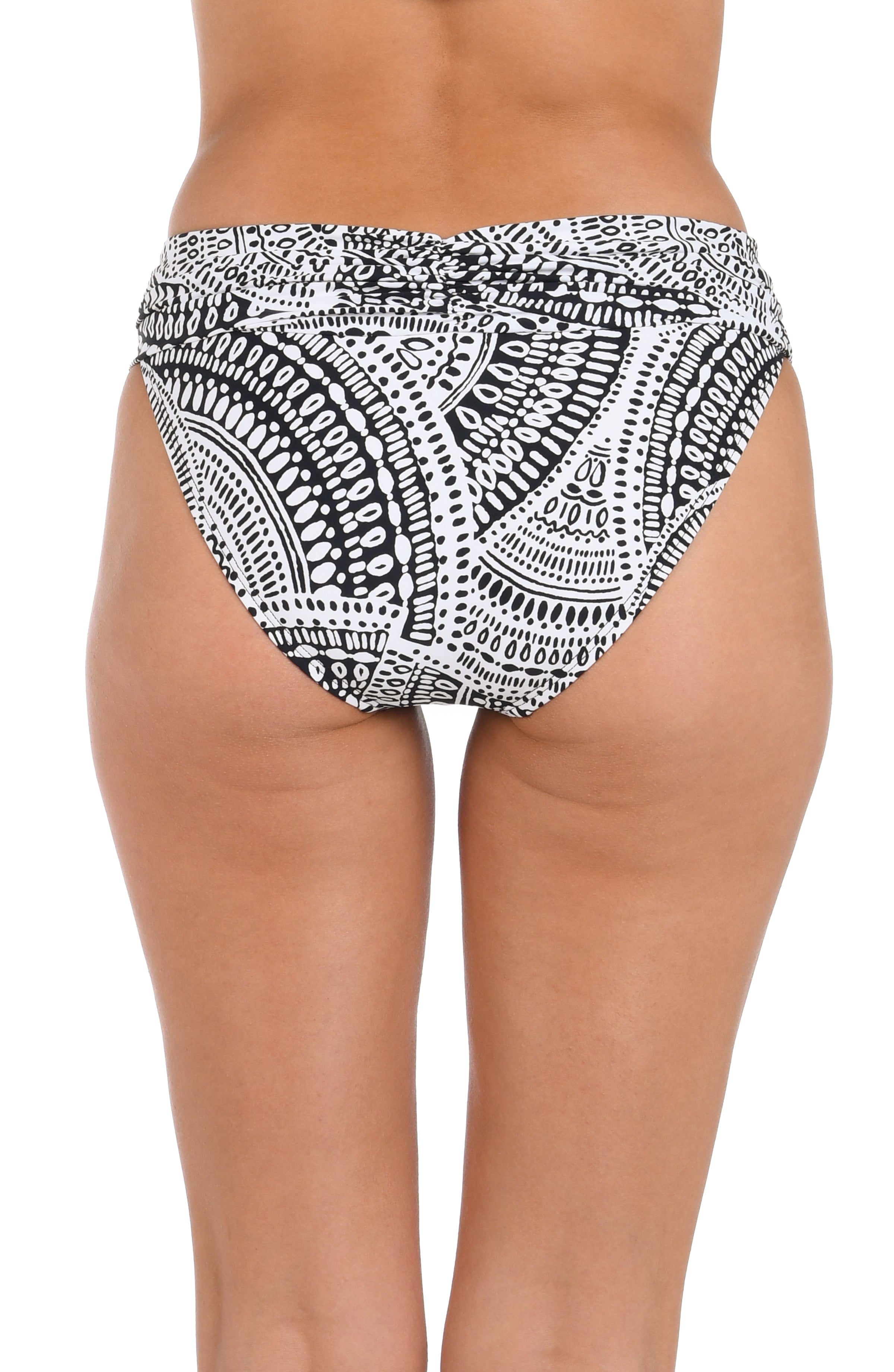 Intricate, symmetrical black and ivory mandala-inspired patterns create a visually captivating and dynamic design for this collection. These hipster bikini bottoms instantly smooth and slim with an eye-catching shirred band that conceals worry areas. The hipster cut flatters your figure in front with discreet coverage in back that won't take away from your curves.
