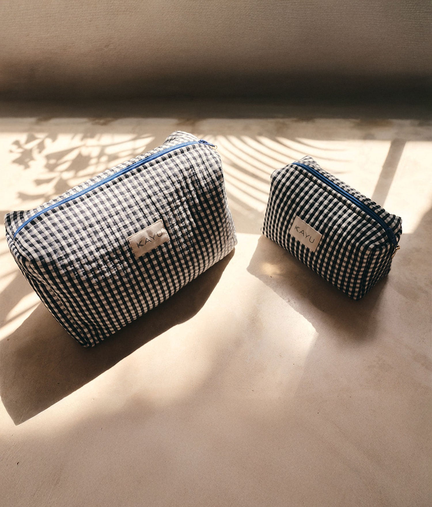 Quilted gingham cotton with contrasting piping make these adorable pouches the perfect place to stash your beauty essentials. The zip top with logo charm keeps your belongings secure.