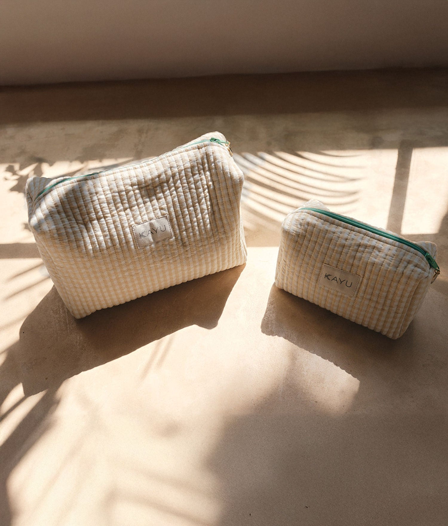 Quilted gingham cotton with contrasting piping make these adorable pouches the perfect place to stash your beauty essentials. The zip top with logo charm keeps your belongings secure.
