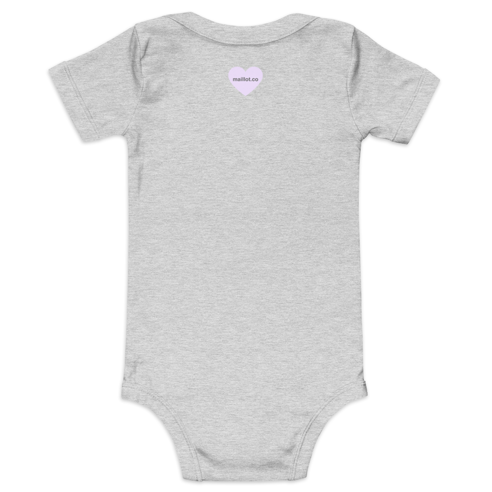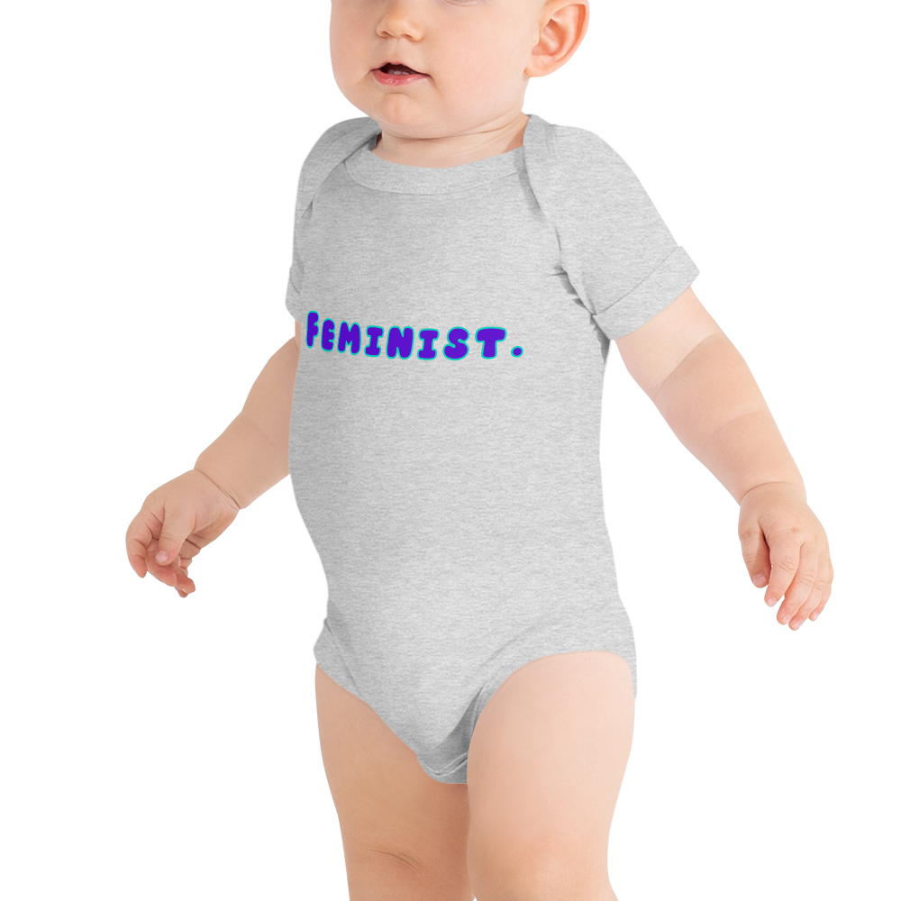 Soft 100% cotton light silver grey baby and toddler onesie with purple “FEMINIST.” text at front and small maillot.co heart logo at back.