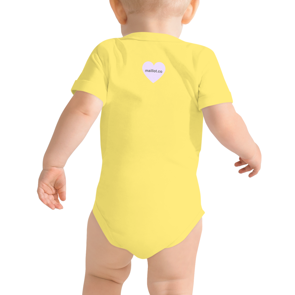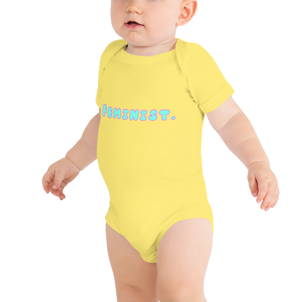 Soft 100% cotton in baby yellow color with contrast neon blue “FEMINIST” text at front and small maillot.co heart logo at back.