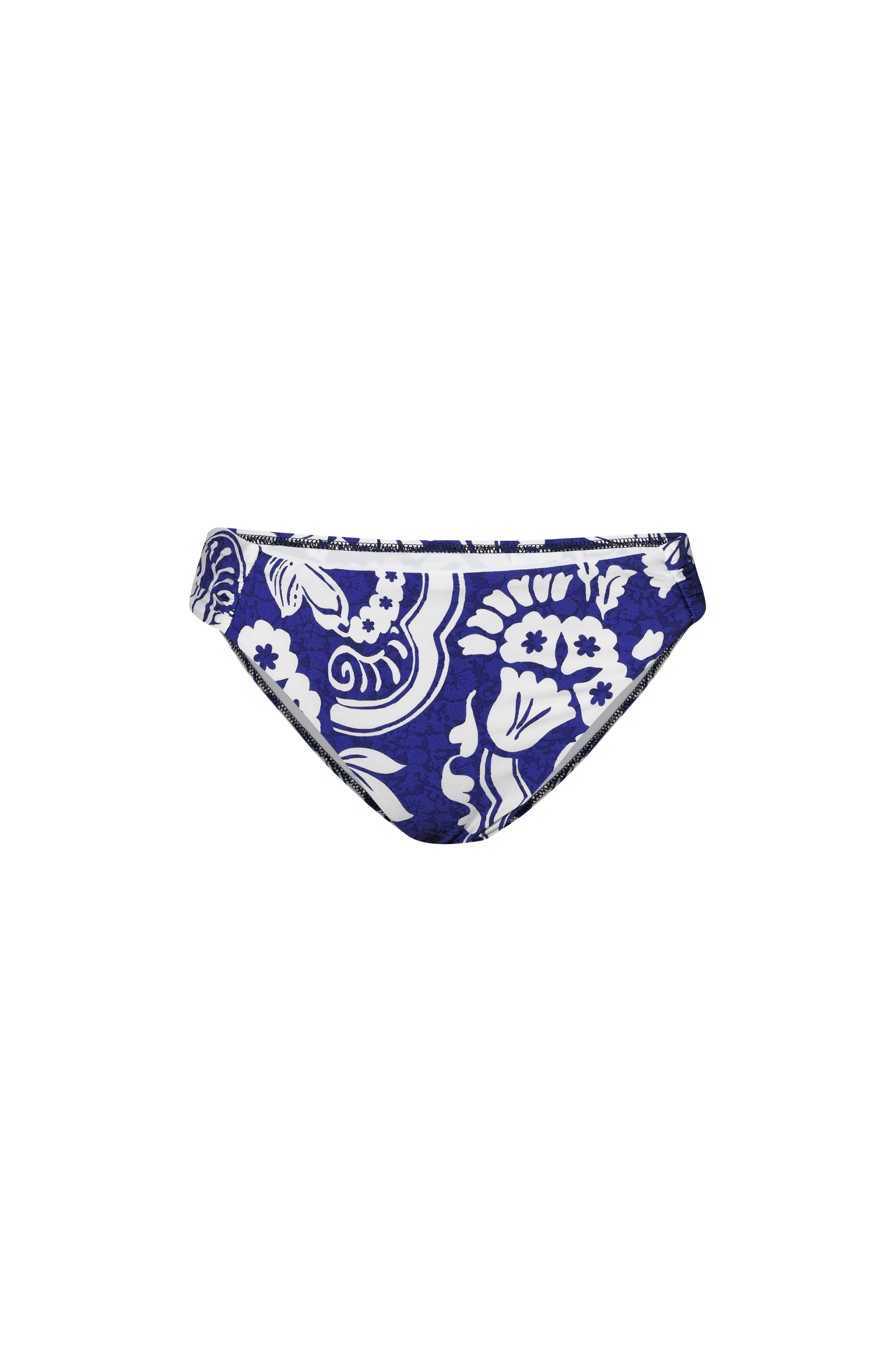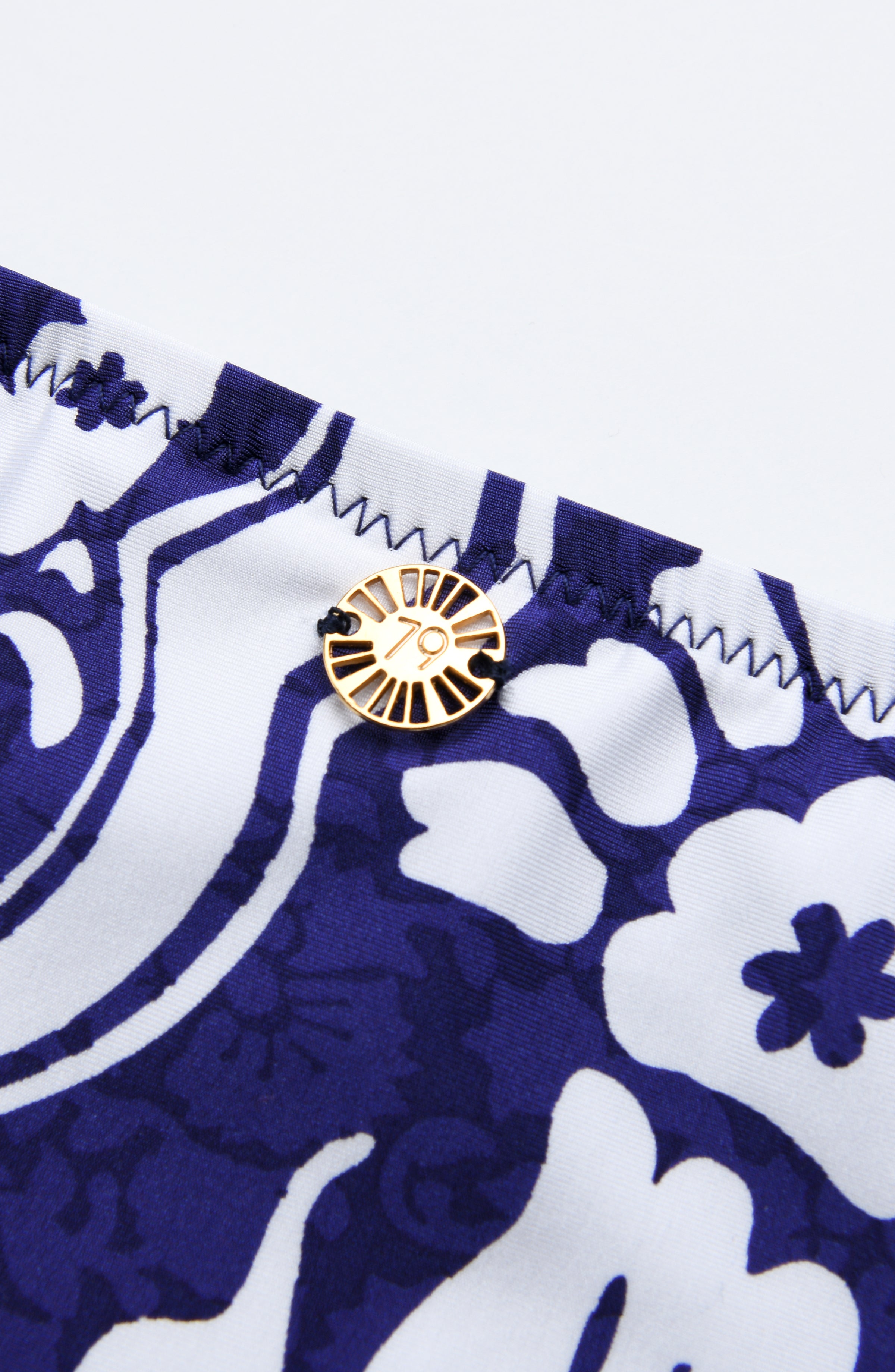Bright and bold, this bottom pops with a classic floral pattern in crisp white, set against a rich ultramarine backdrop! A hipster silhouette with hip-flattering shirring on each side offers just-right coverage to keep the look sophisticatedly seductive.
