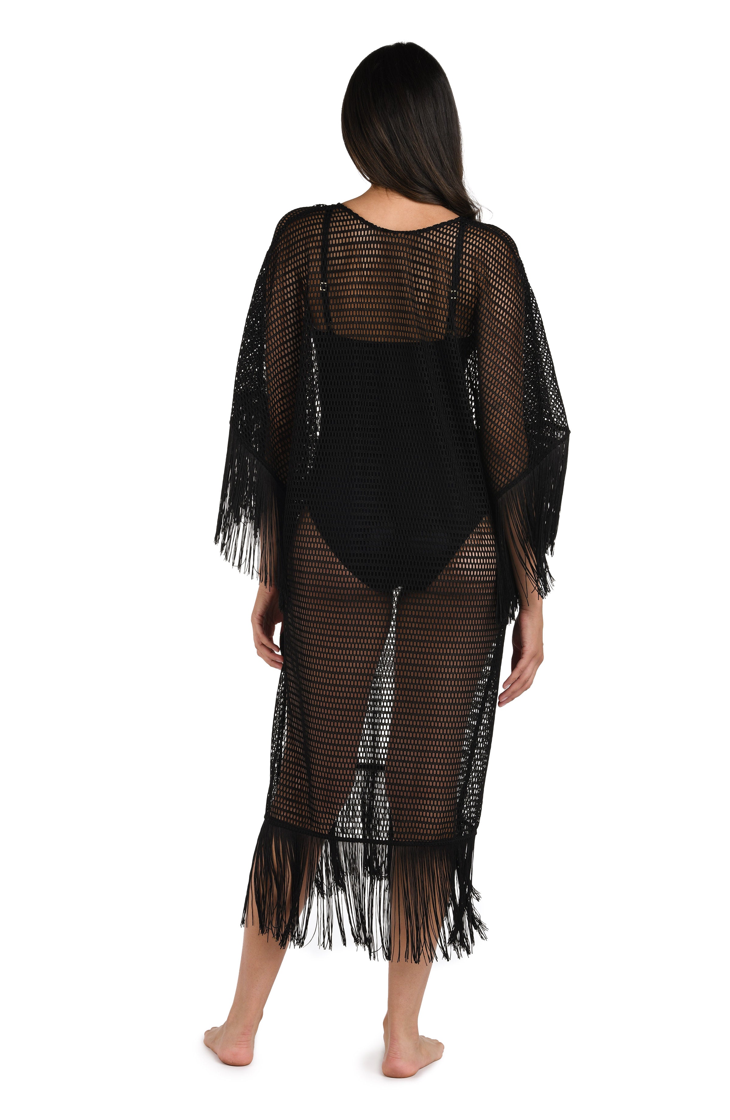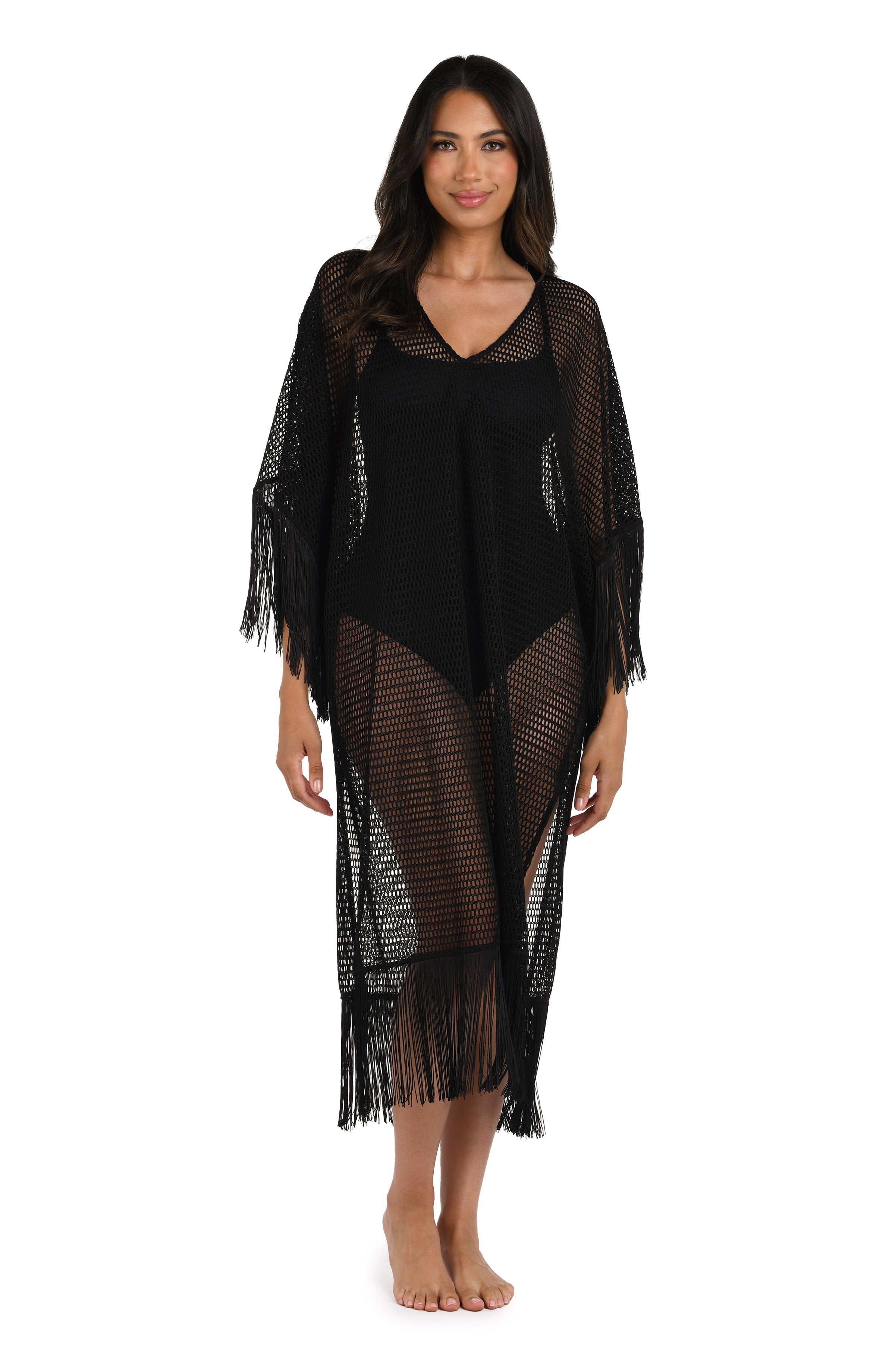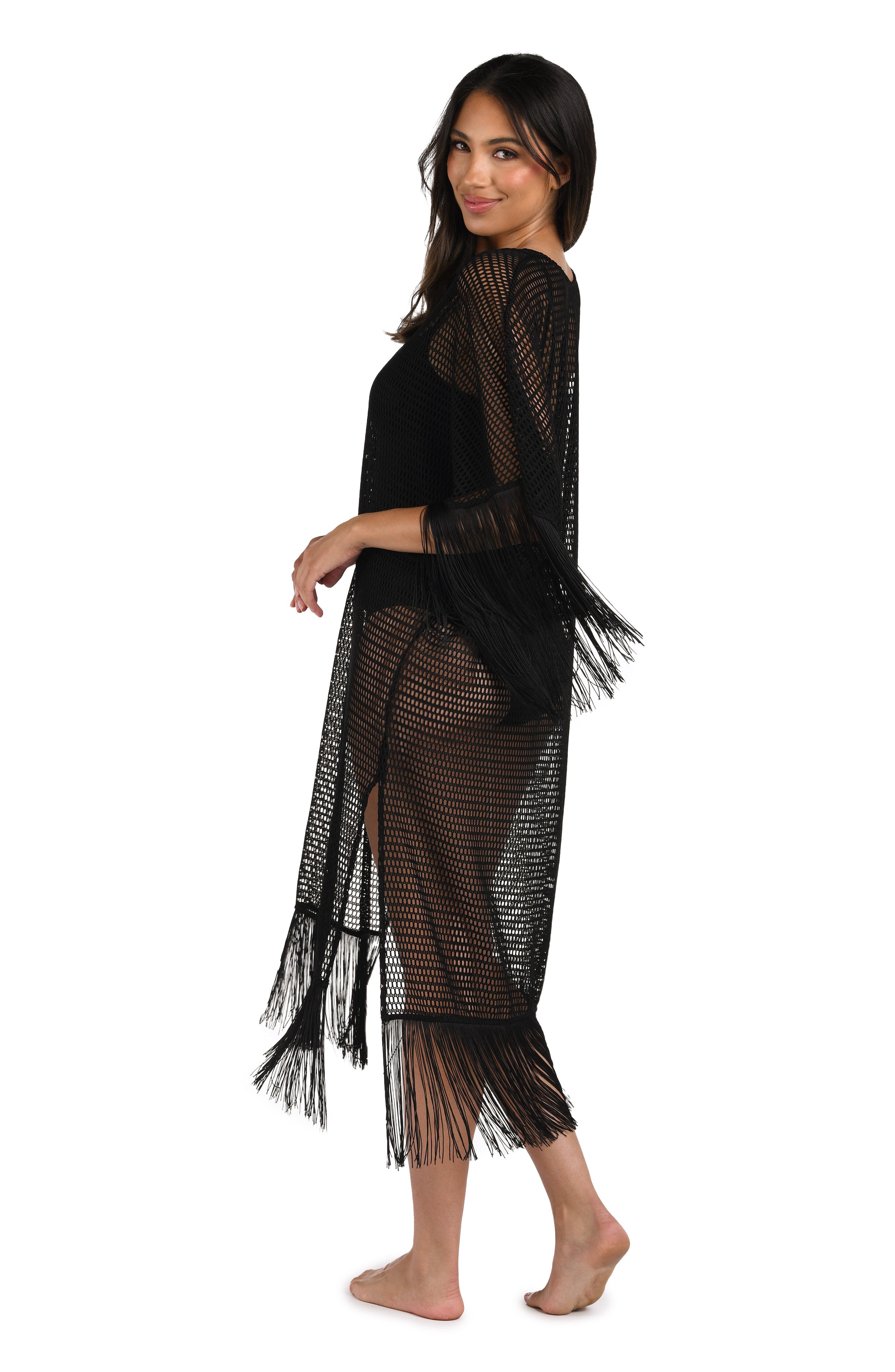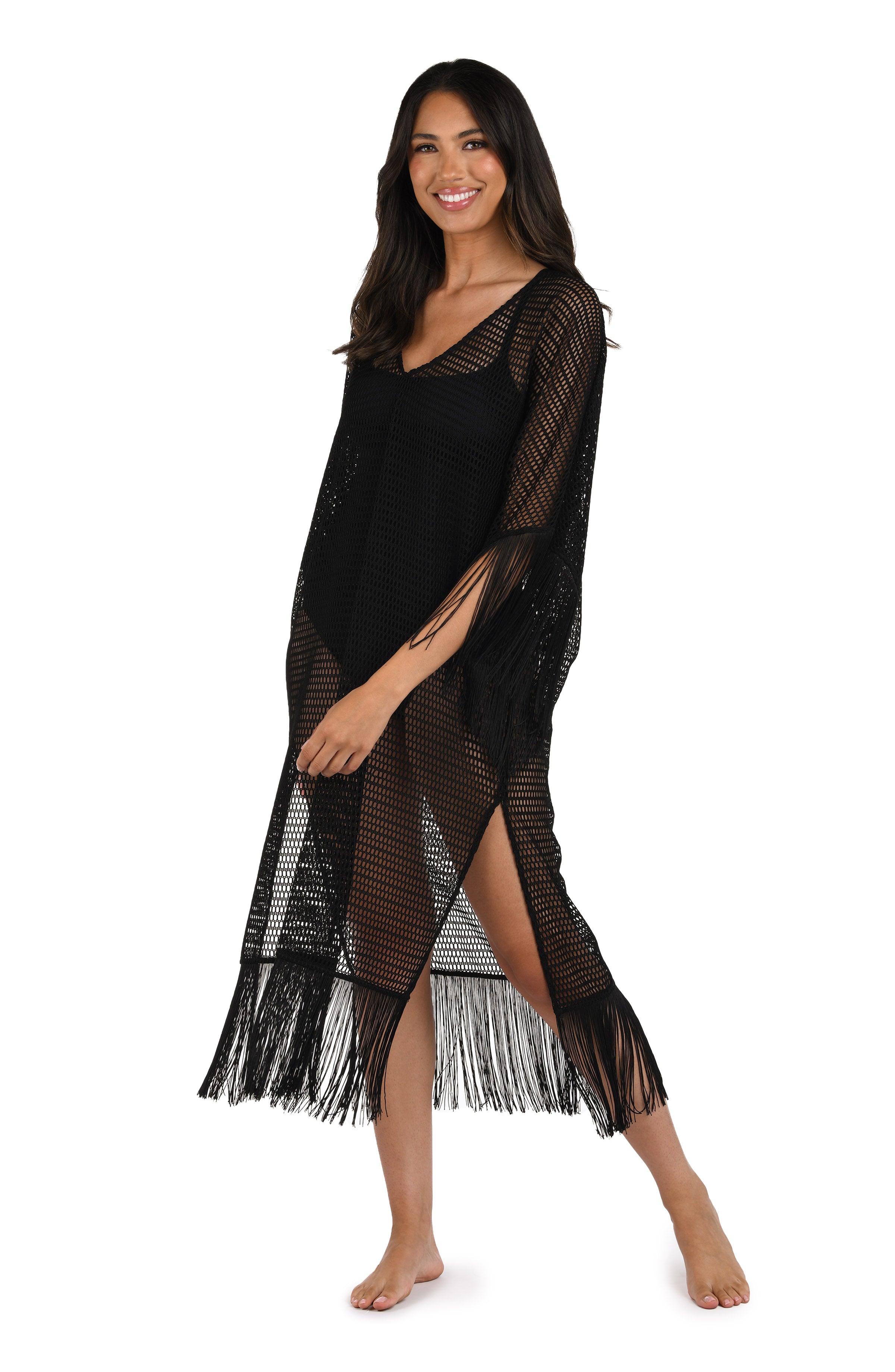 This novelty fabric features fringe detail at the hem, and an overall classic fishnet grid pattern for a sleek look. Offering just the right amount of coverage, this long caftan has an effortless silhouette for throw-on-and-go ease. Breezy dolman sleeves with fringe detail offer a comfortable, laidback look.