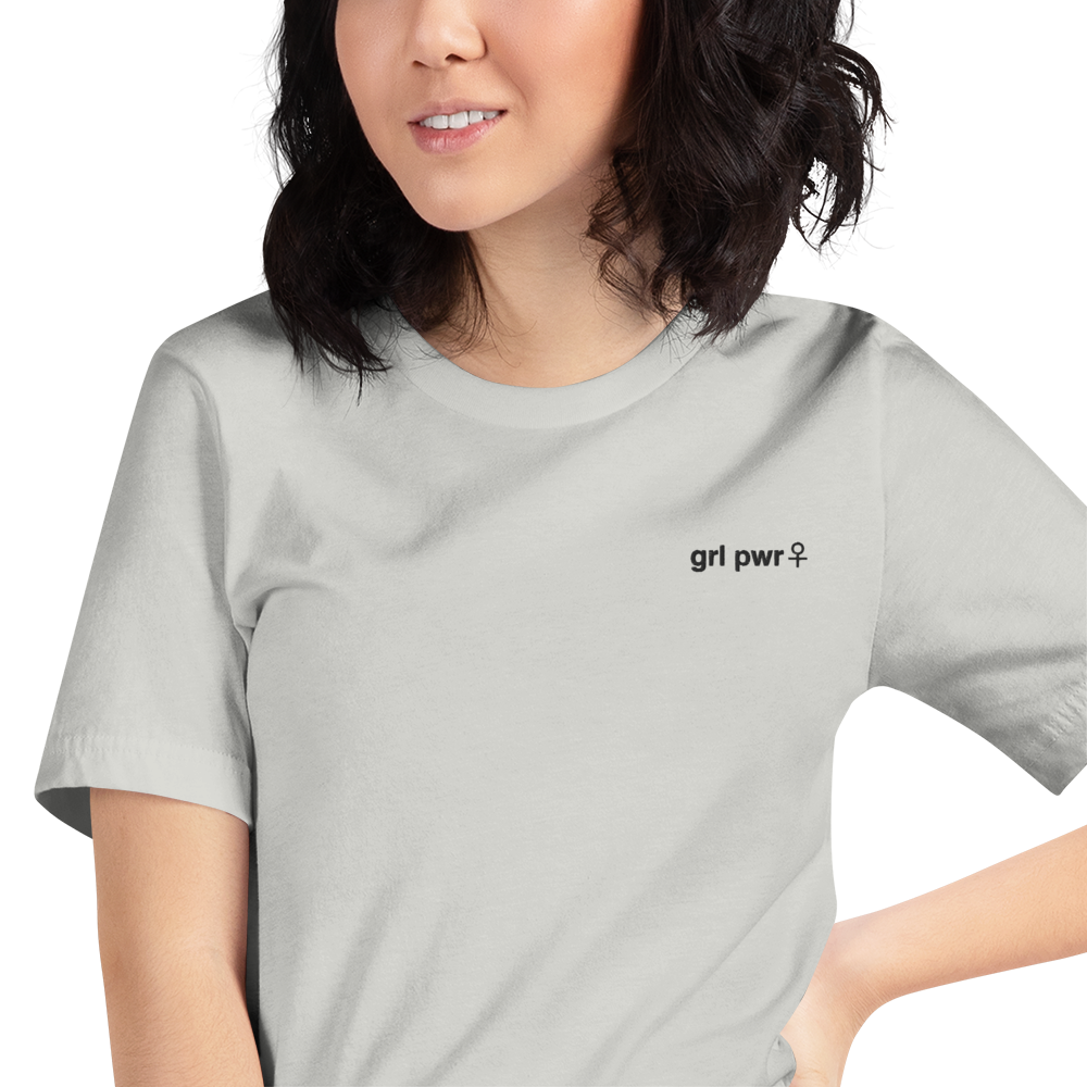 Light grey short-sleeved crew neck t-shirt with embroidered “grl pwr” slogan on chest.