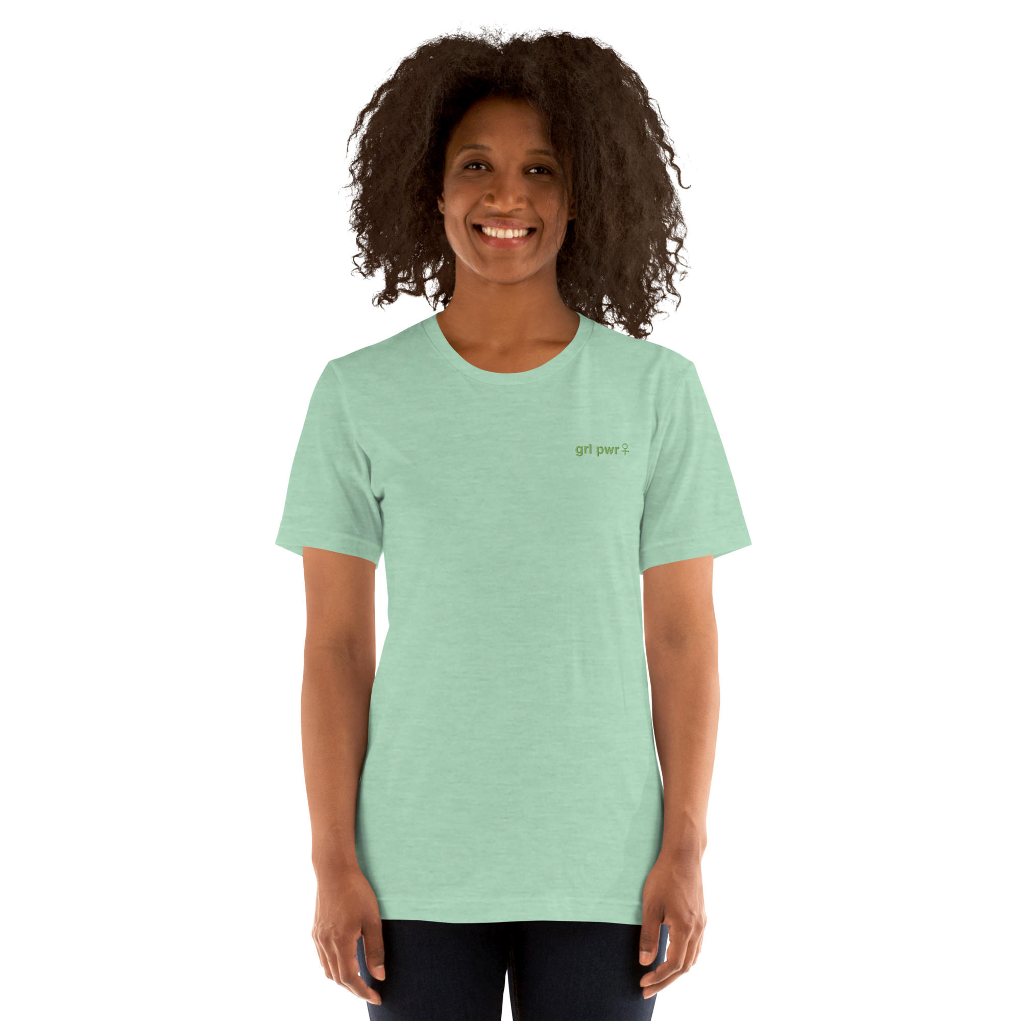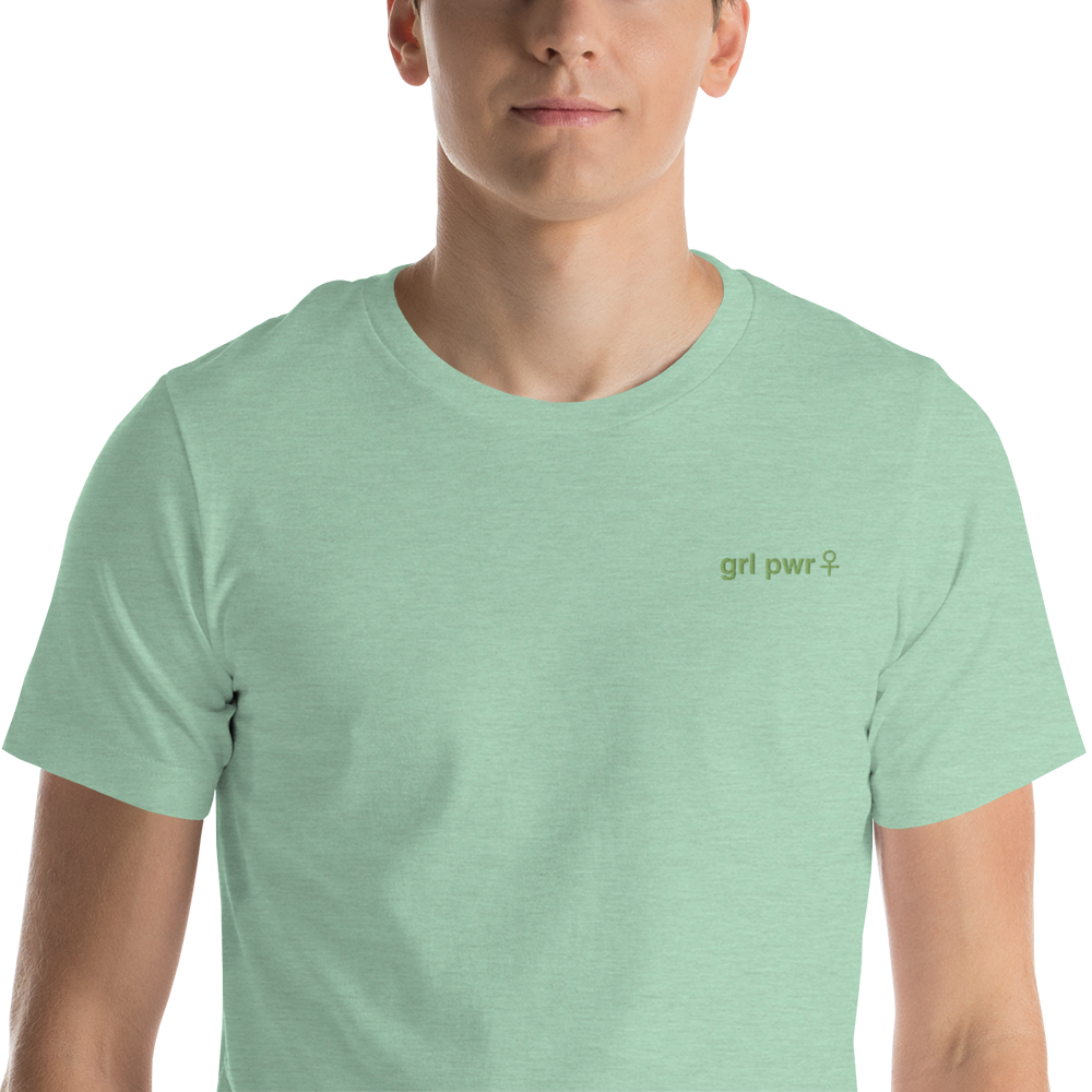 Mint green 100% cotton classic crew neck t-shirt with green embroidered “grl pwr ♀” slogan on chest.