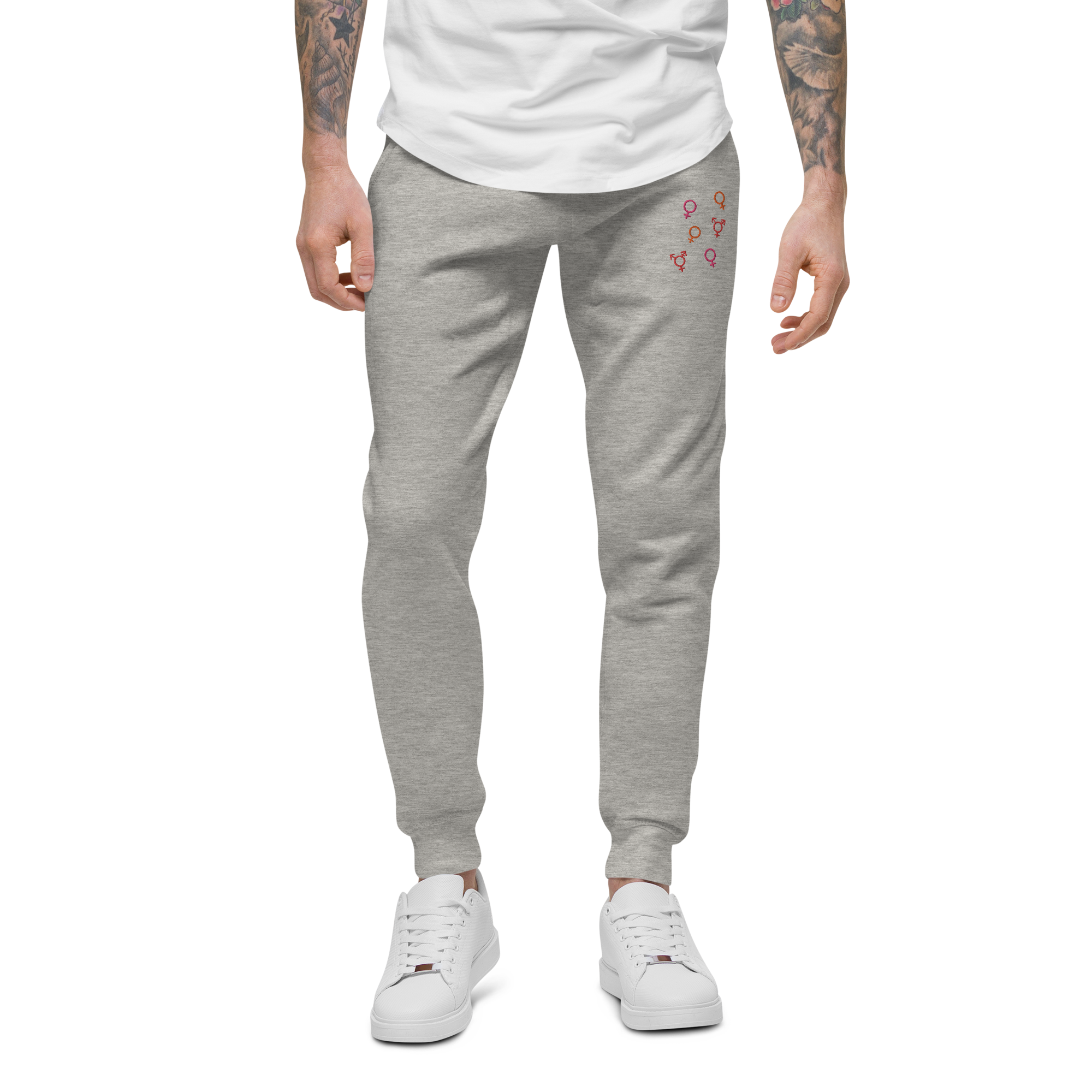 Fleece-lined unisex jogger sweatpants in medium grey color with a combination of gender symbols embroidered on the left pocket area.