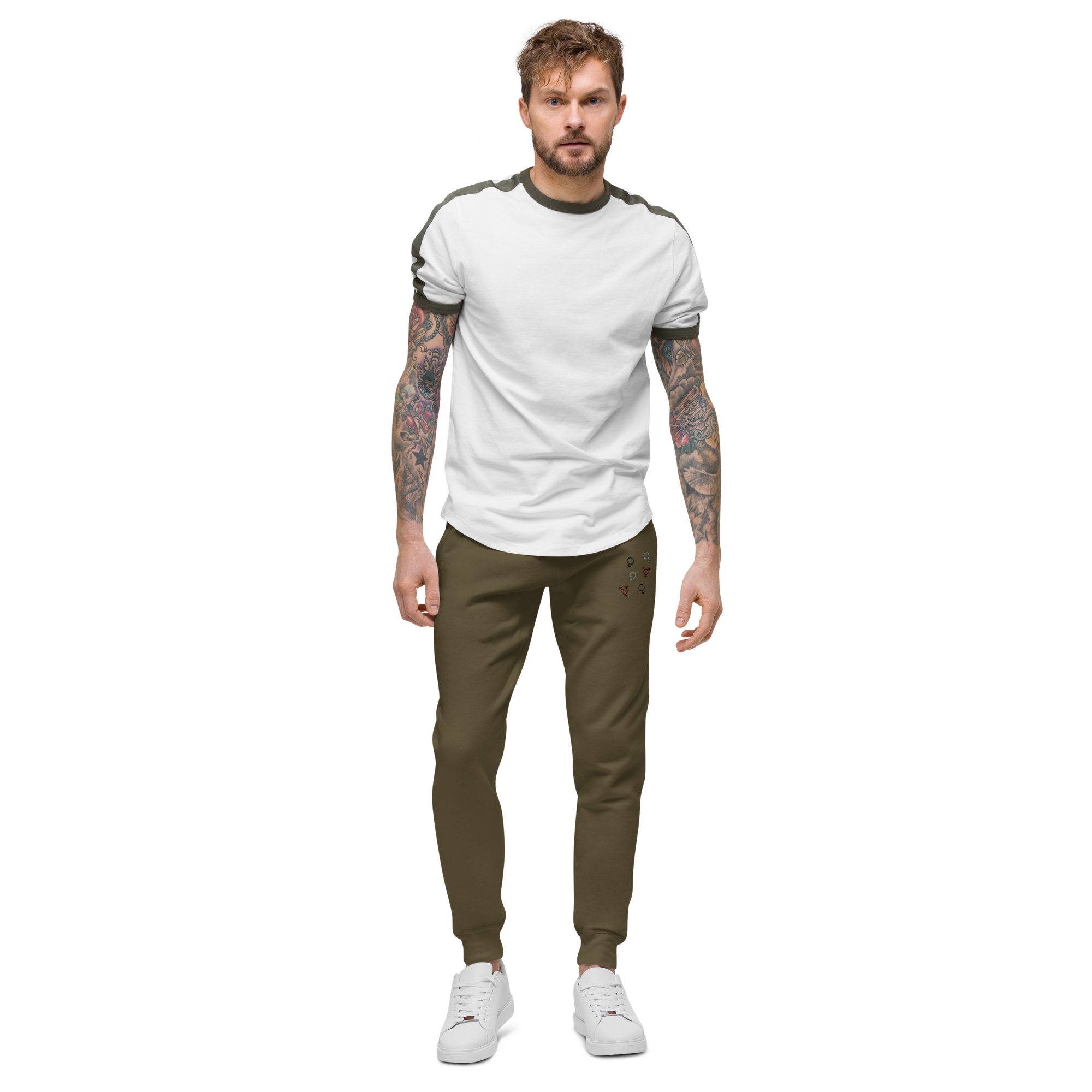Fleece-lined unisex jogger sweatpants in neutral military green color with a combination of gender symbols embroidered on the left pocket area.