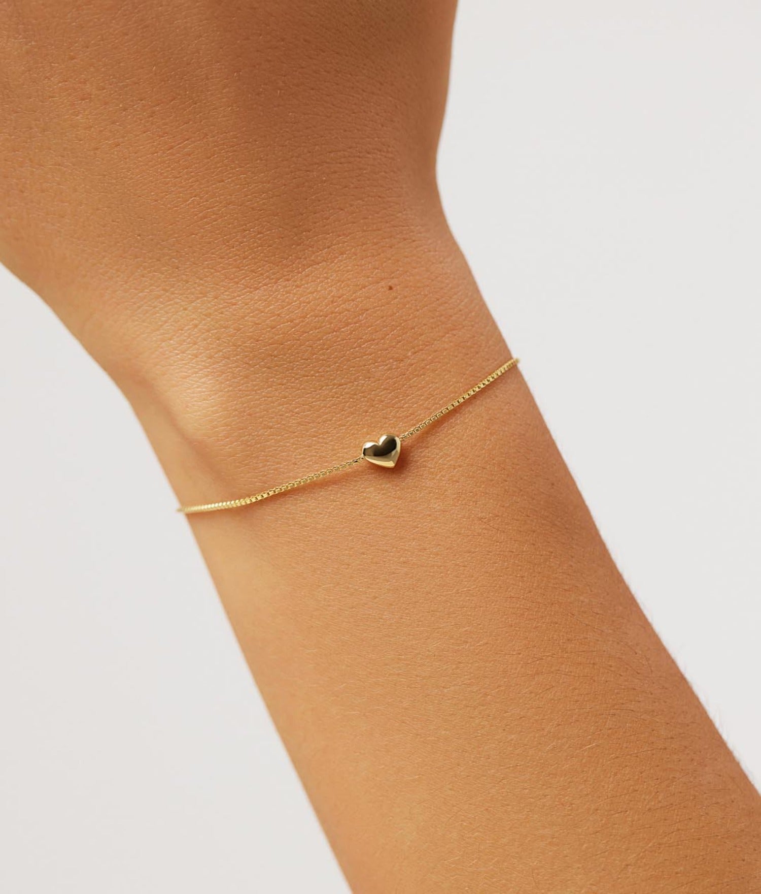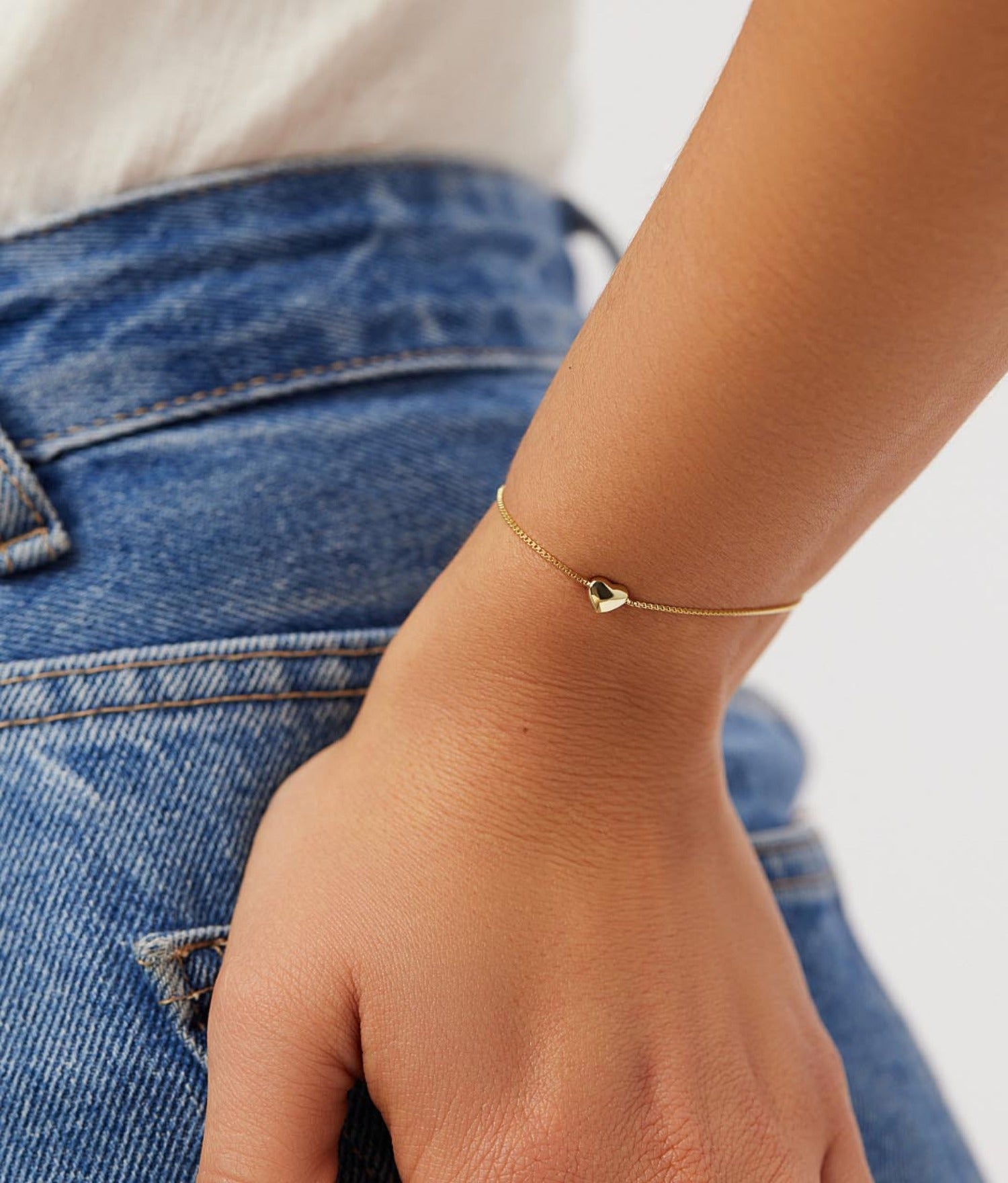 Delicate, dainty, and dipped in 14k gold, this heart bracelet is destined to become a staple in your everyday stack. Featuring a heart-shaped pendant and shiny polished finish, this bracelet is one you’ll fall in love with over and over again.