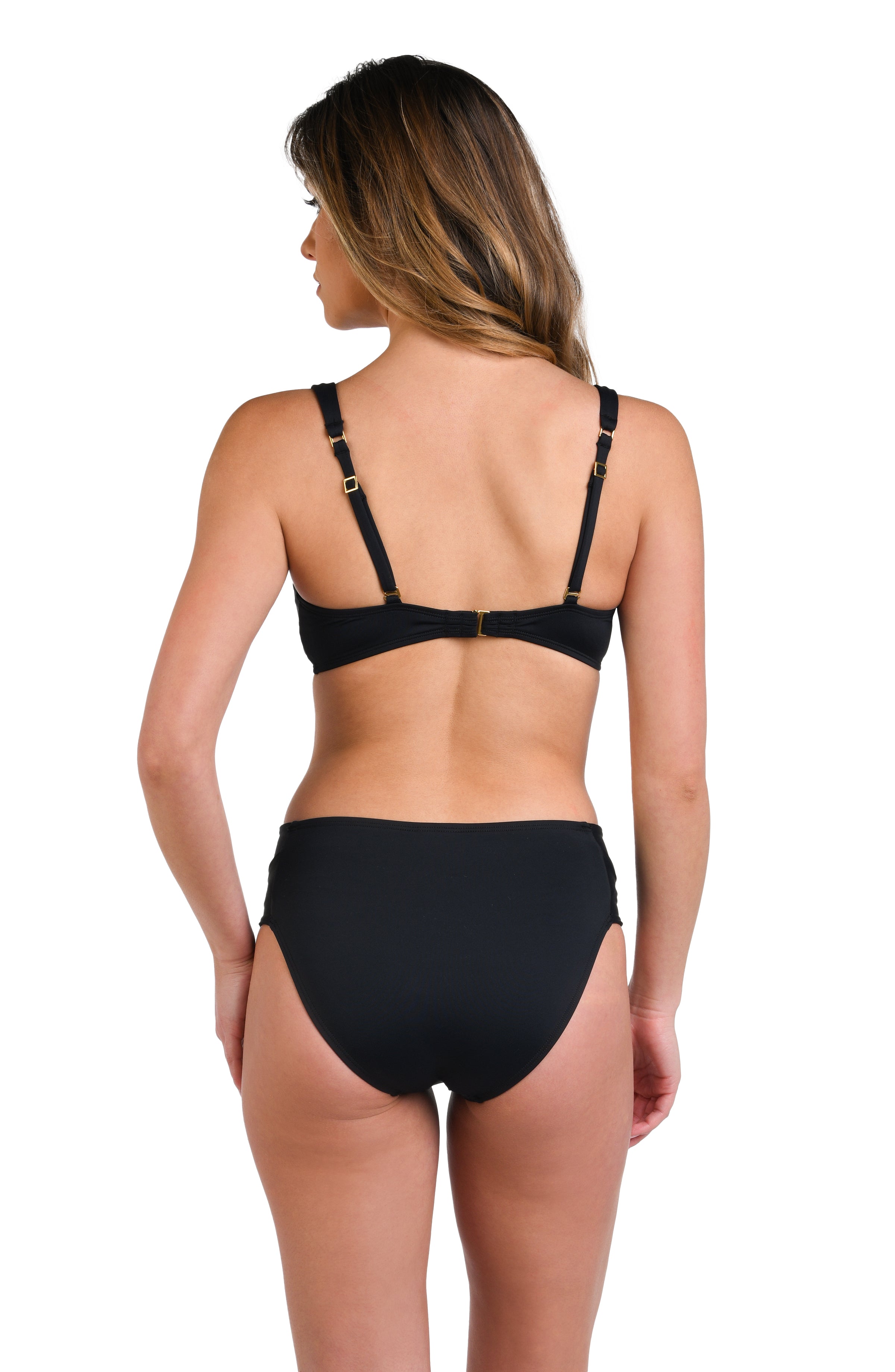 Have a blast on the pool deck in this classic, black V-neck bikini top. With wide adjustable straps, this top is designed to provide a comfortable yet secure fit for swimming activities. The wispy cut and deep v-neckline is playful, while the removable cups tailor to your coverage needs. Hook-back closures allow for full customization, suggesting a design that combines functionality with a touch of elegance.