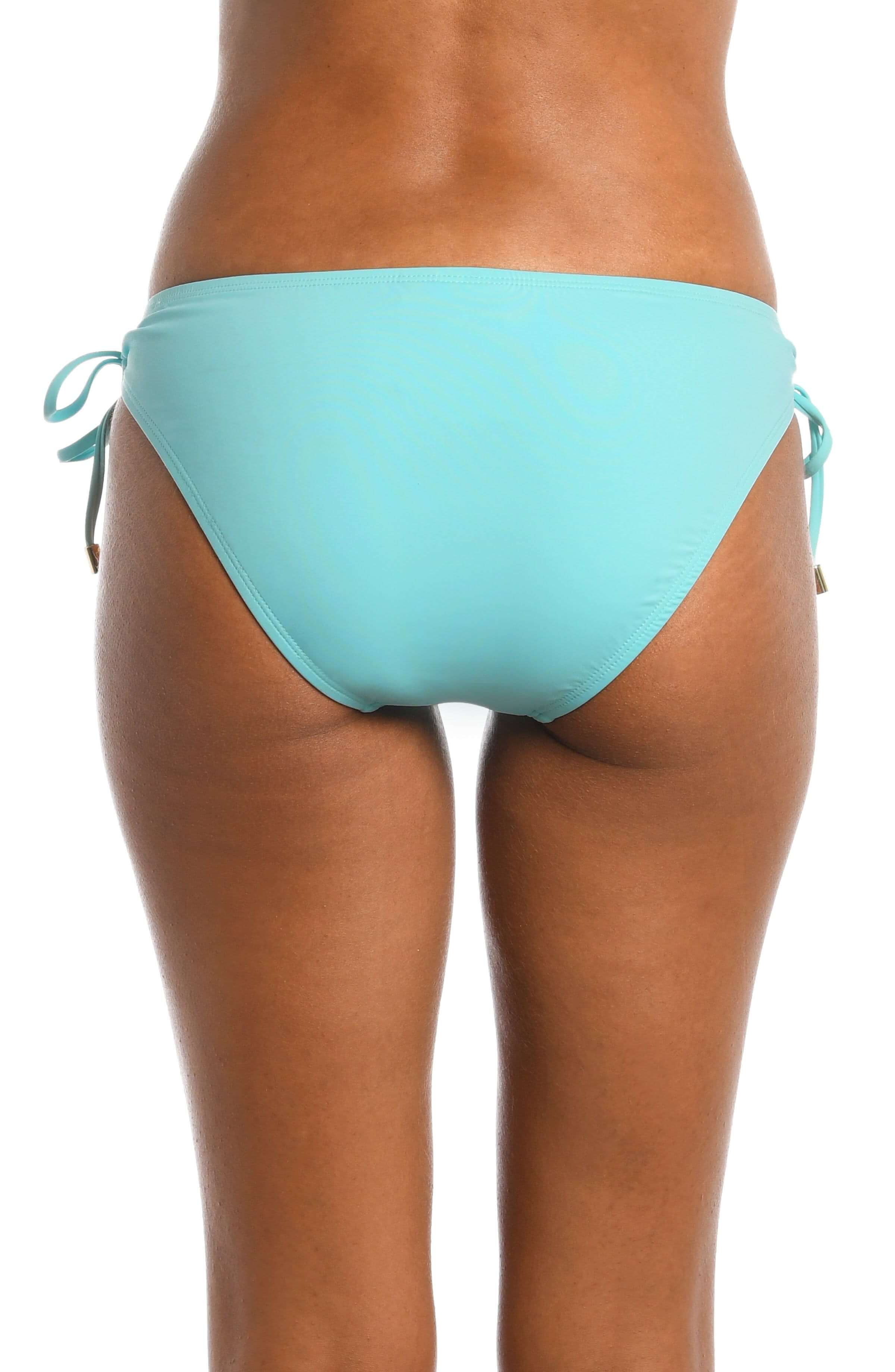 These bikini bottoms leave a little something to the imagination with adjustable side tie loops fitted with metal tips that reveal just a hint of skin. The hipster cut flatters the hips with just enough coverage in back so you won't have to worry about these bottoms riding up.