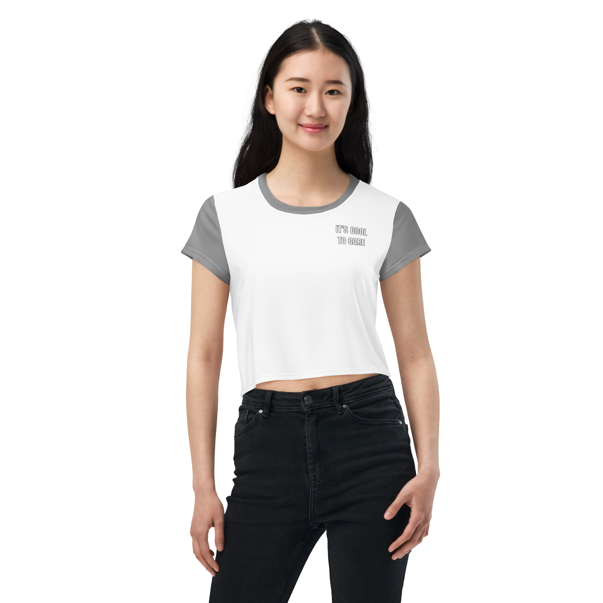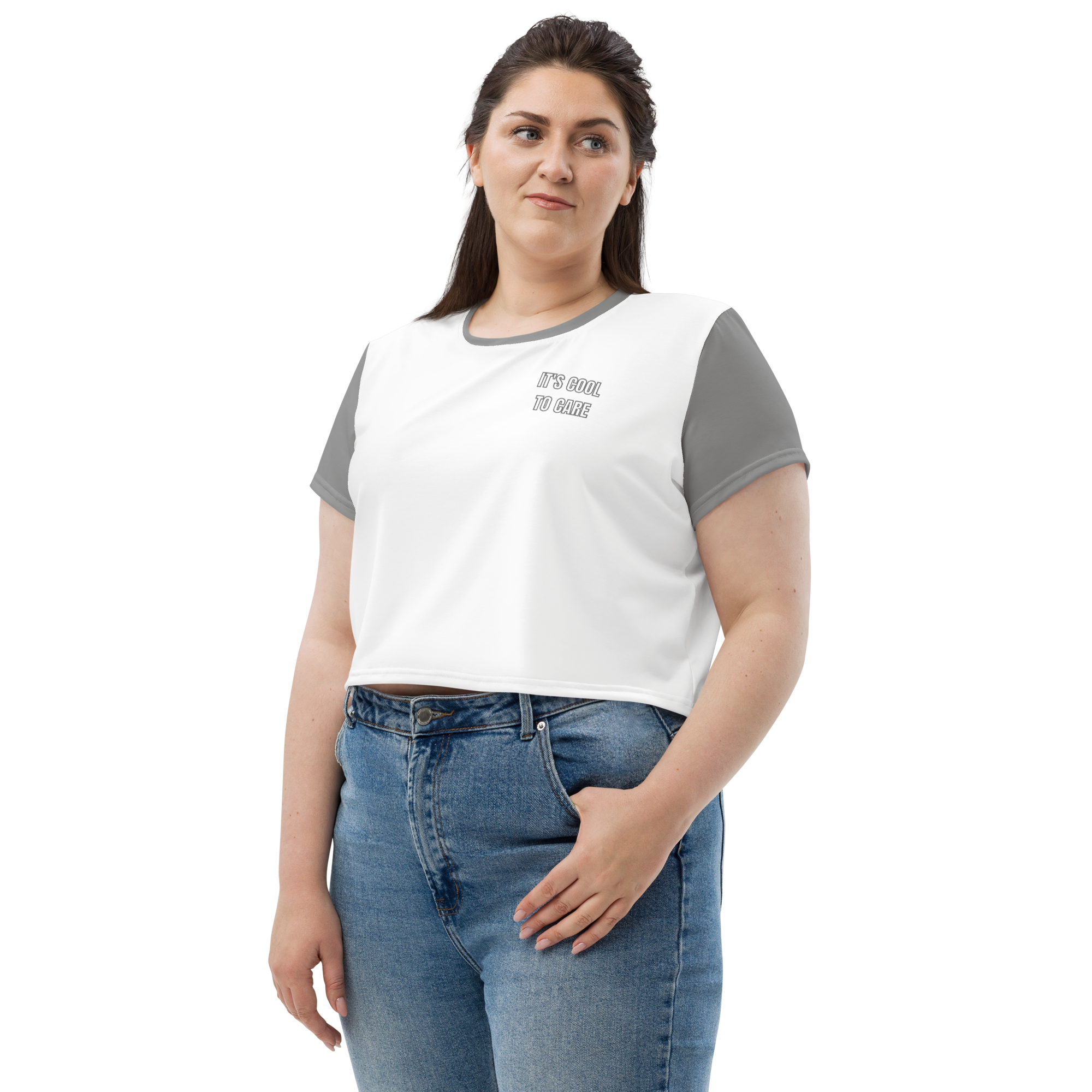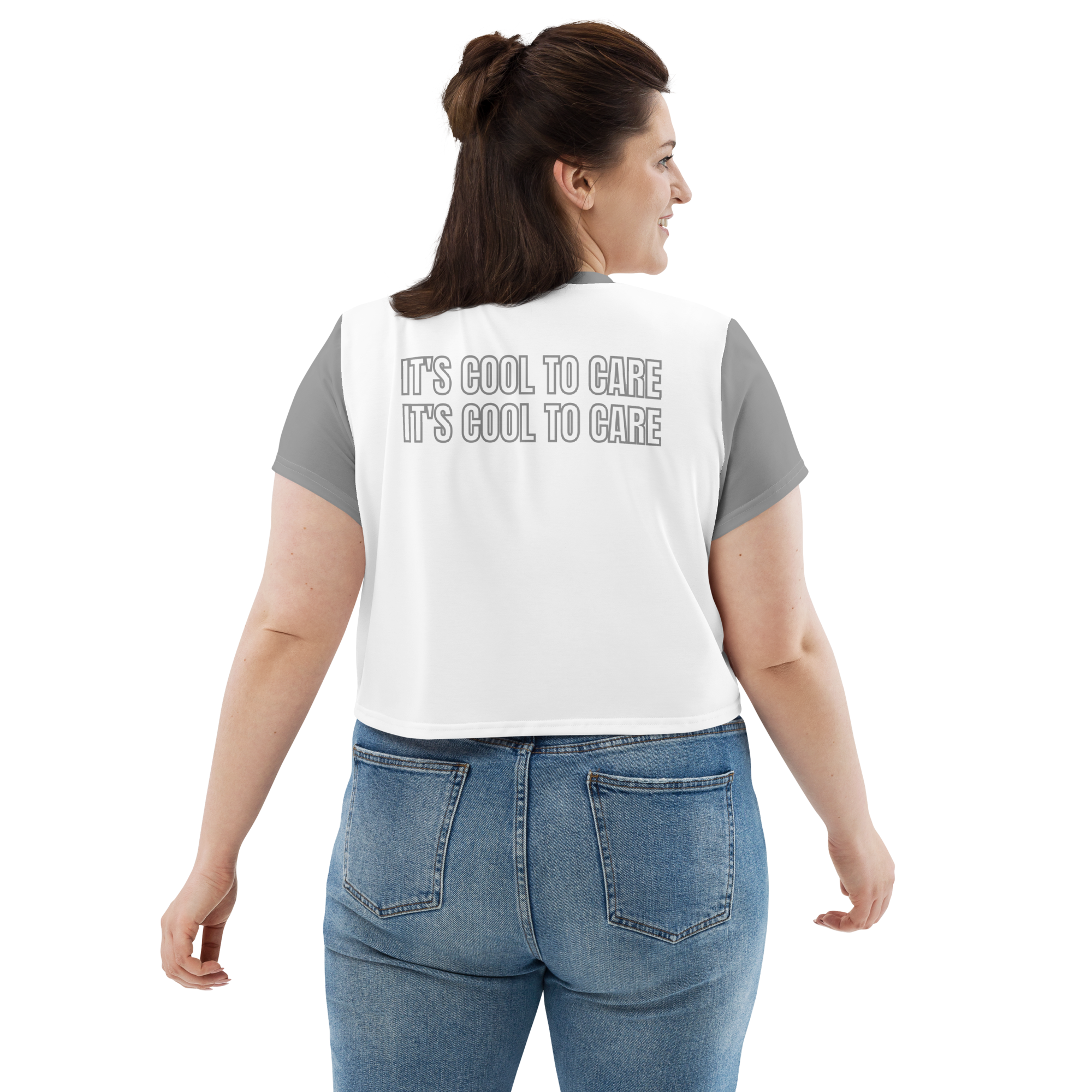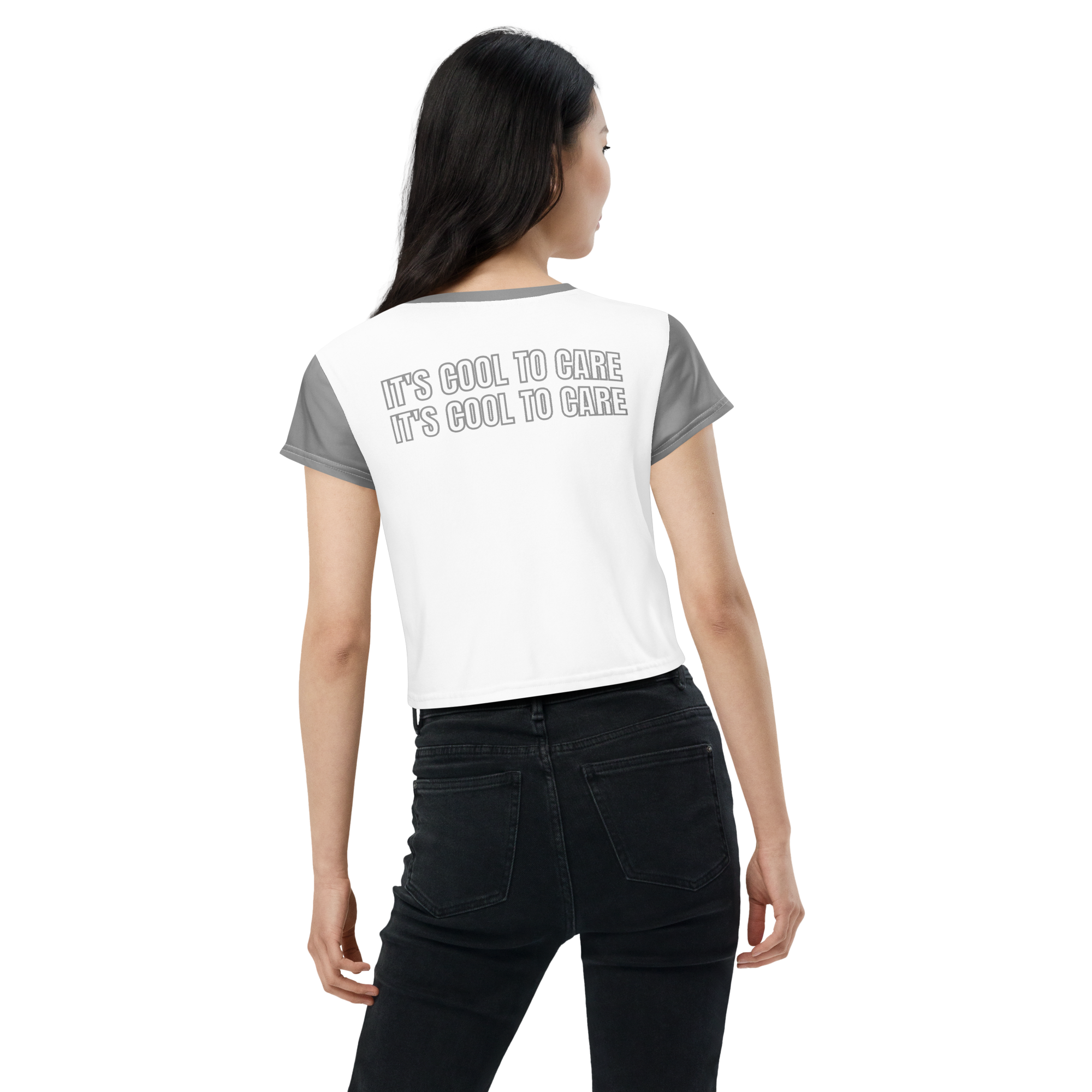 White short-sleeved cropped t-shirt with grey sleeves and neckline and “IT’S COOL TO CARE” printed on the chest and back.