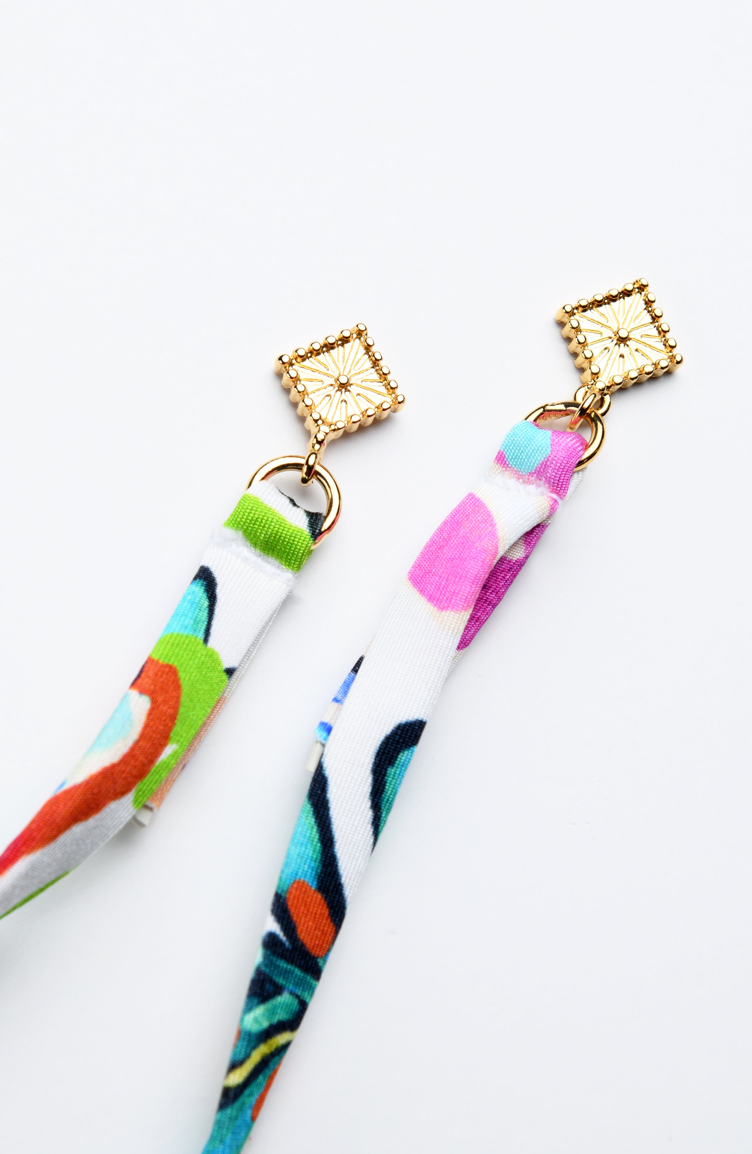 - Adjustable neck straps with gold charms