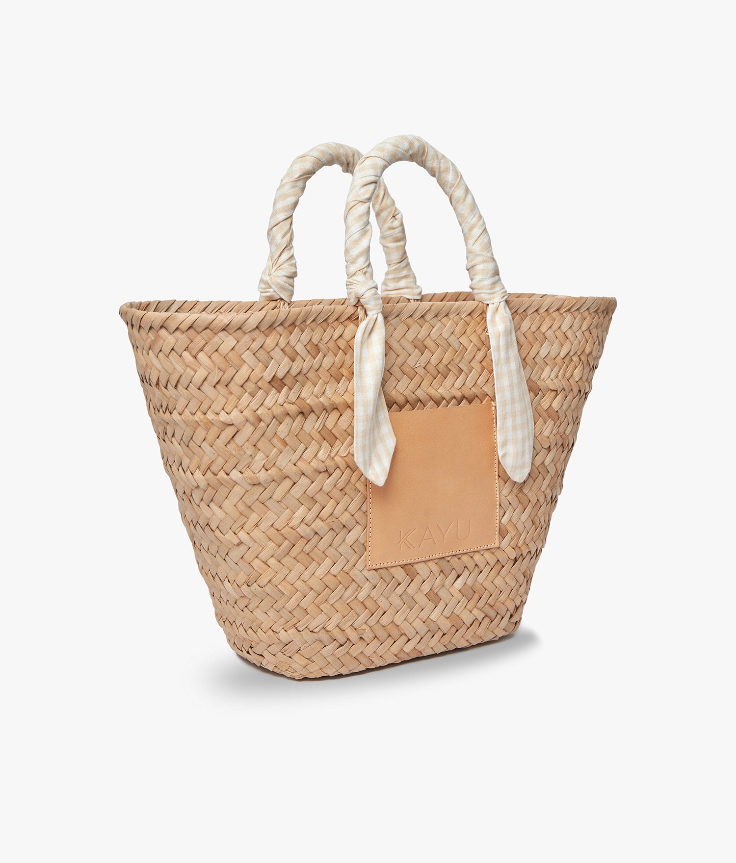 Scarf wrapped handles feature a cheery gingham print. Perfect for picnics, days by the beach or wherever you may go.