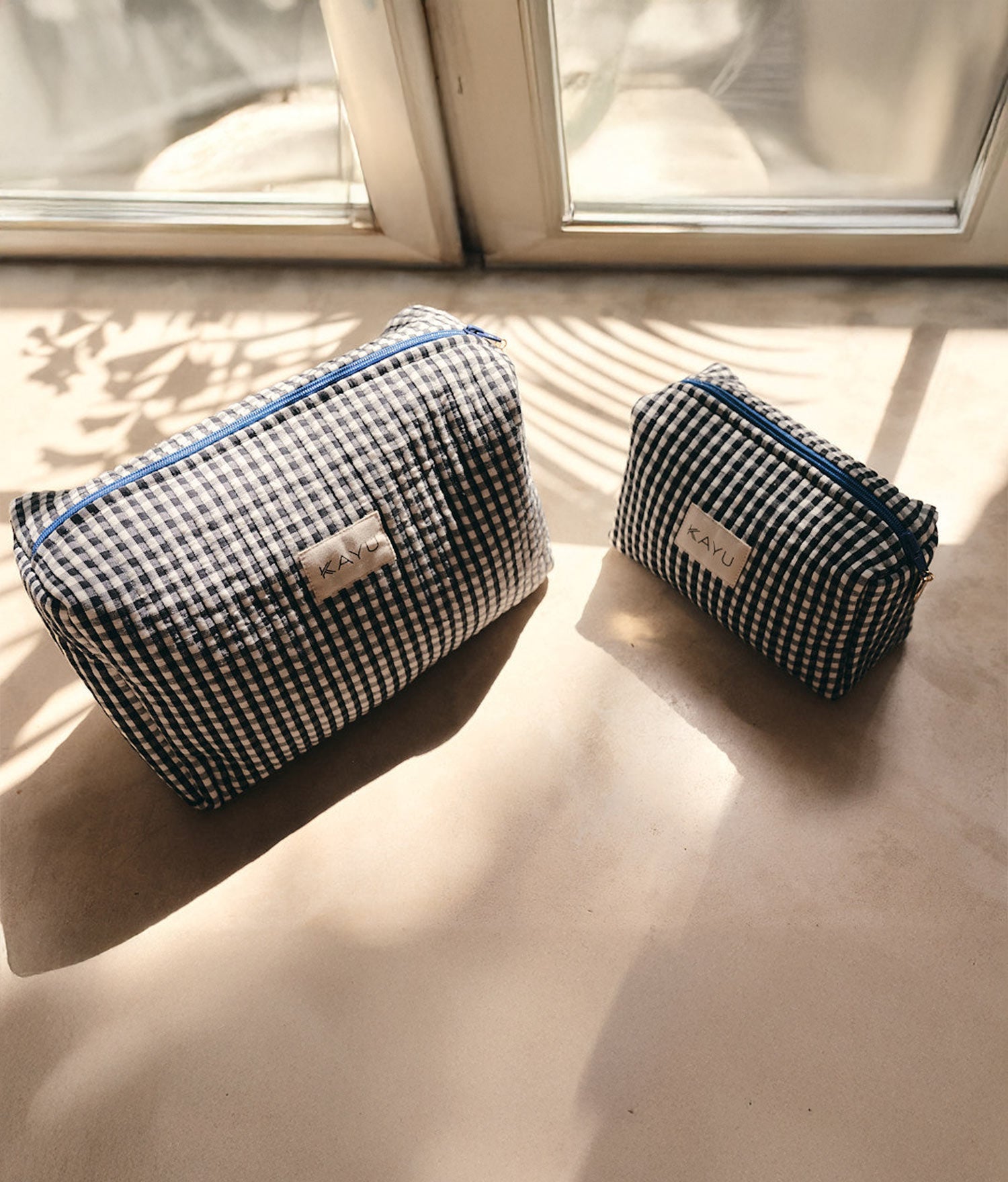 Quilted gingham cotton with contrasting piping make these adorable pouches the perfect place to stash your beauty essentials. The zip top with logo charm keeps your belongings secure.