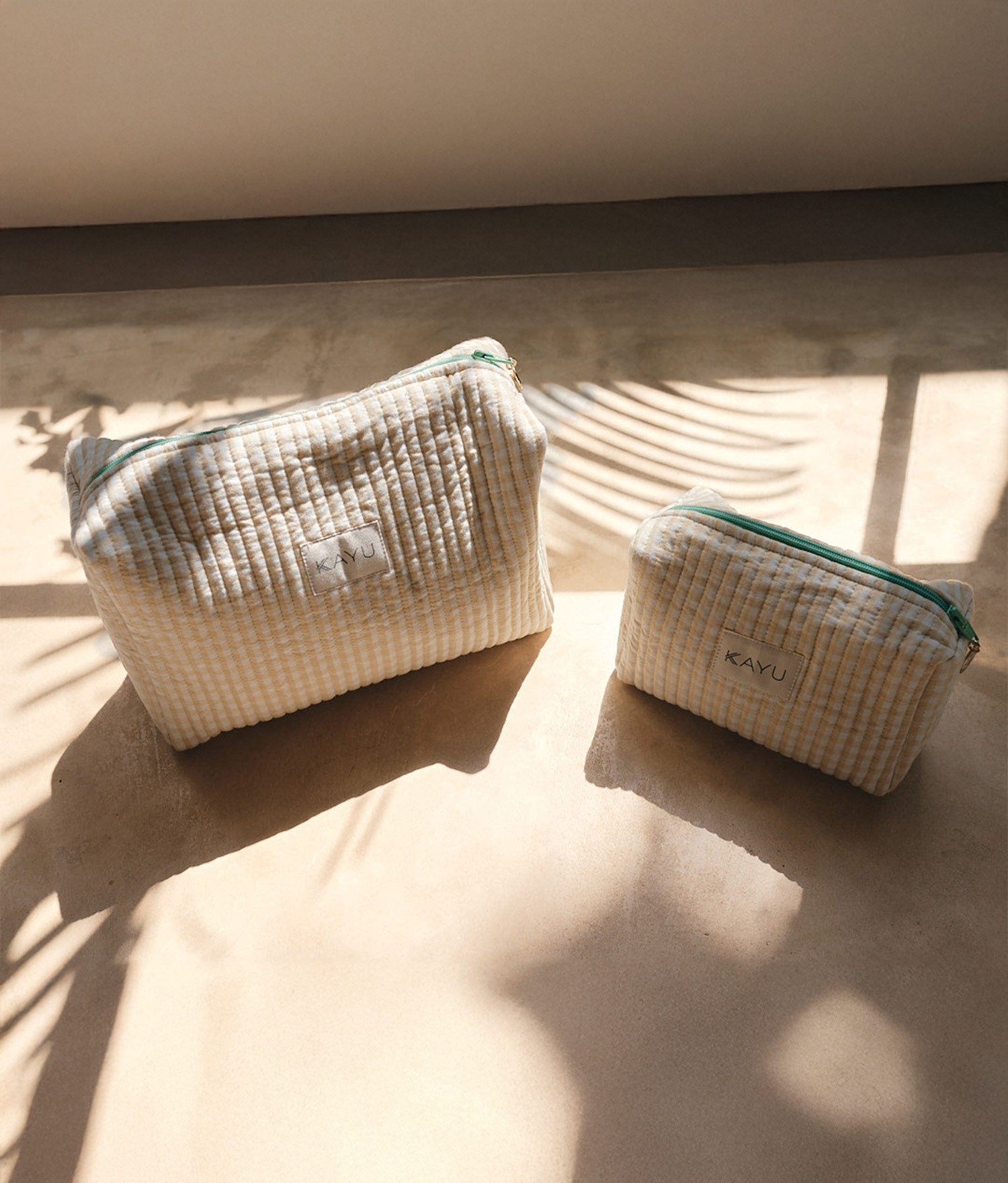 Quilted gingham cotton with contrasting piping make these adorable pouches the perfect place to stash your beauty essentials. The zip top with logo charm keeps your belongings secure.