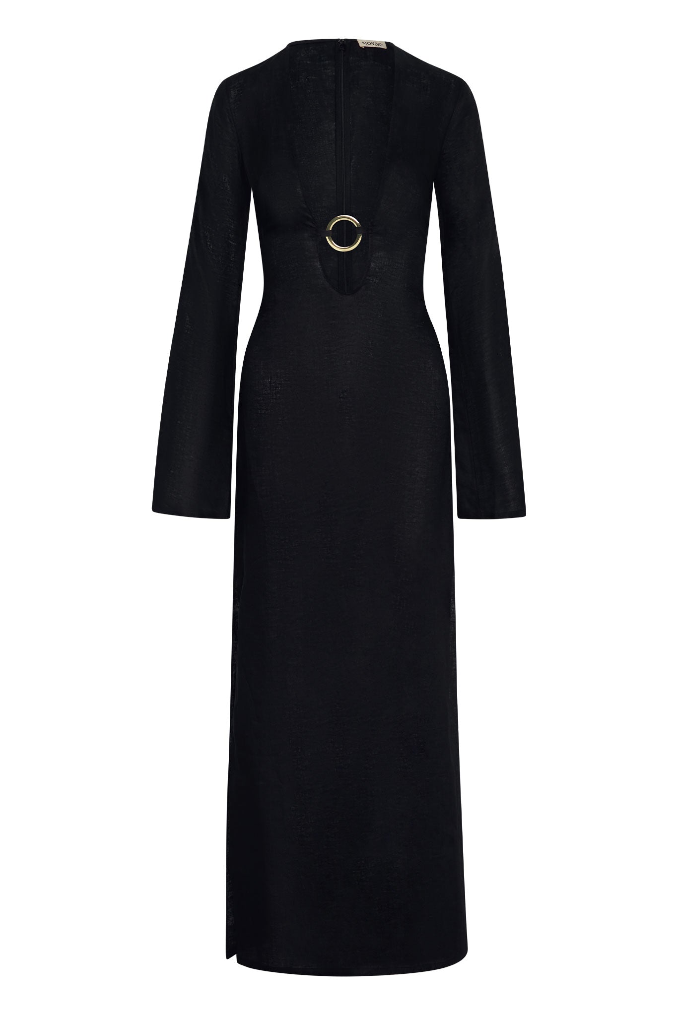 Glamorous and chic! This Montego Dress will make you feel like a star. Made in an airy linen, this elegant dress with a plunging neckline, gold ring detailing and high side seam slits will make you brighten up any room you walk in. Paired with any of our swim, this dress will elevate any beach look!