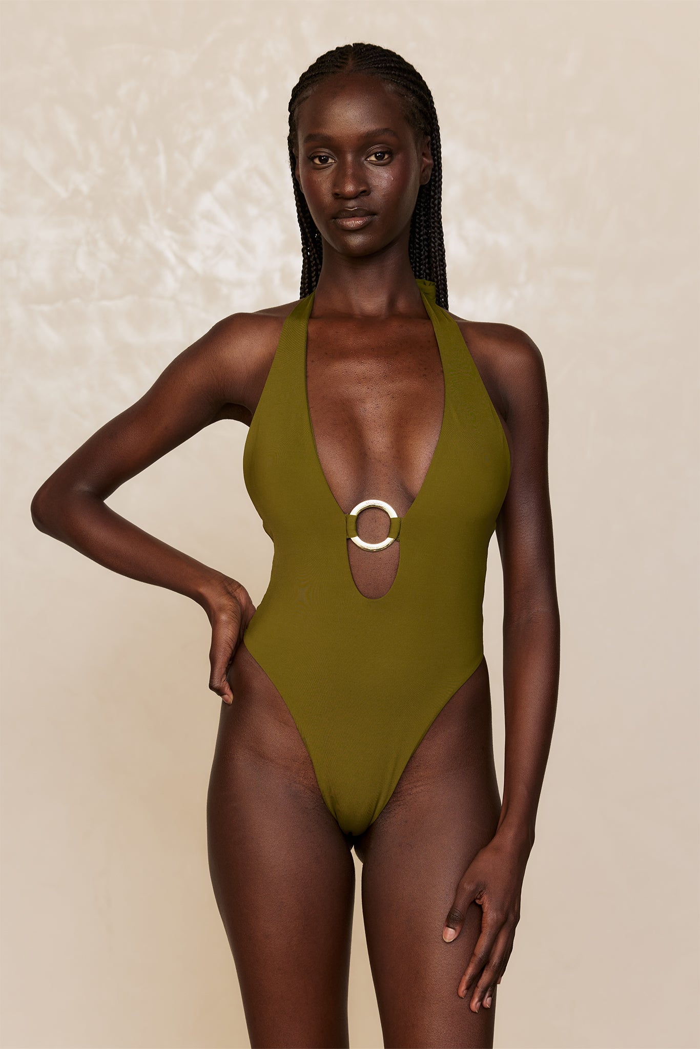 Turn heads and feel confident in the Montego One Piece. Designed for a chic look, this halter plunge one-piece drapes effortlessly, adding a luxe touch. With its sultry low back and elongating high-leg cut, it sculpts a stunning silhouette, whether you’re sipping cocktails under the sun or talking a golden hour dip.