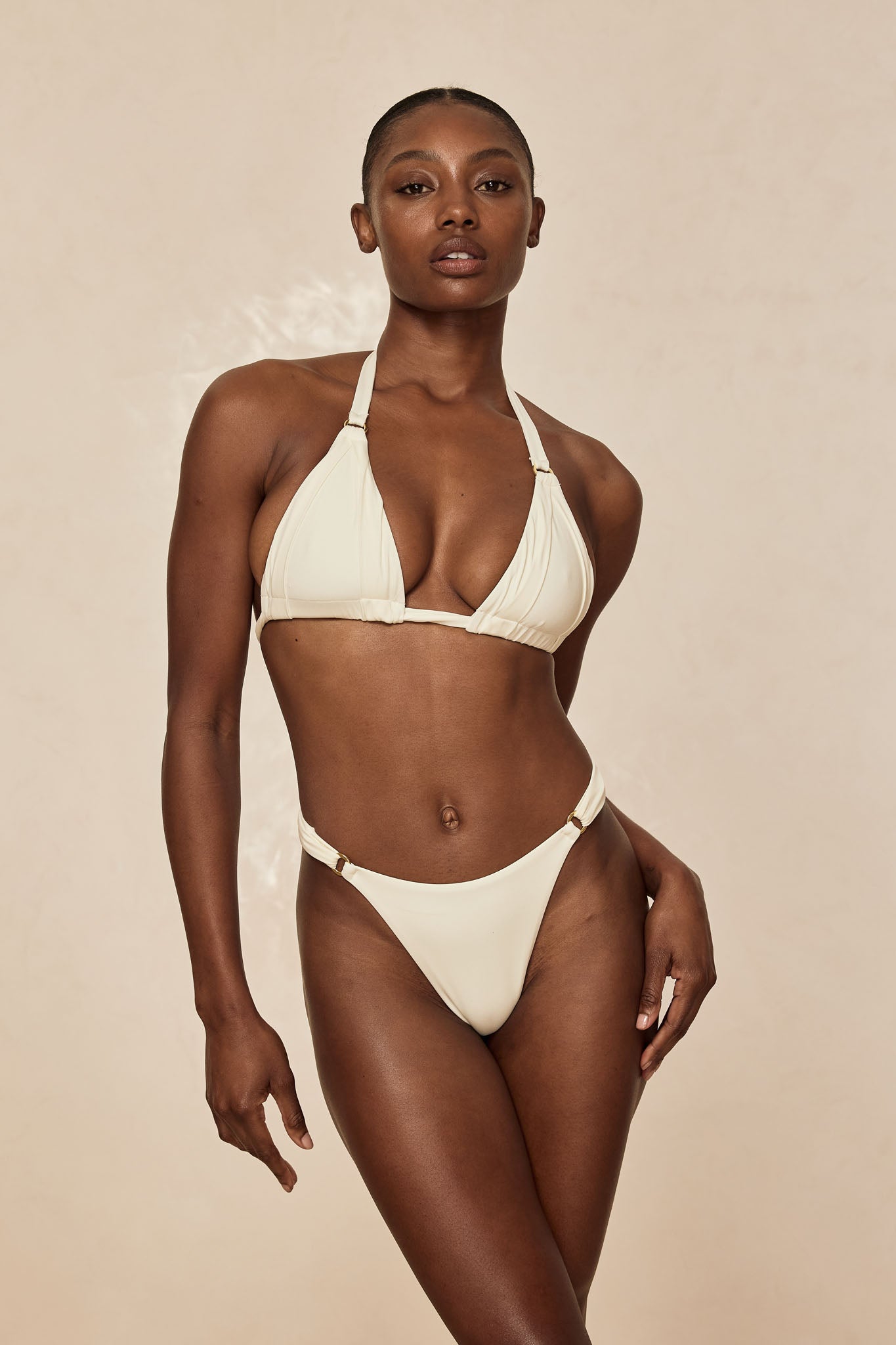 Not your everyday triangle! If you loved our Tulum Top, you'll love our the Morocco Top even more. Featuring gold ring hardware, soft adjustable back & neck ties for comfort and pleated cup detail for the perfect lift and support.