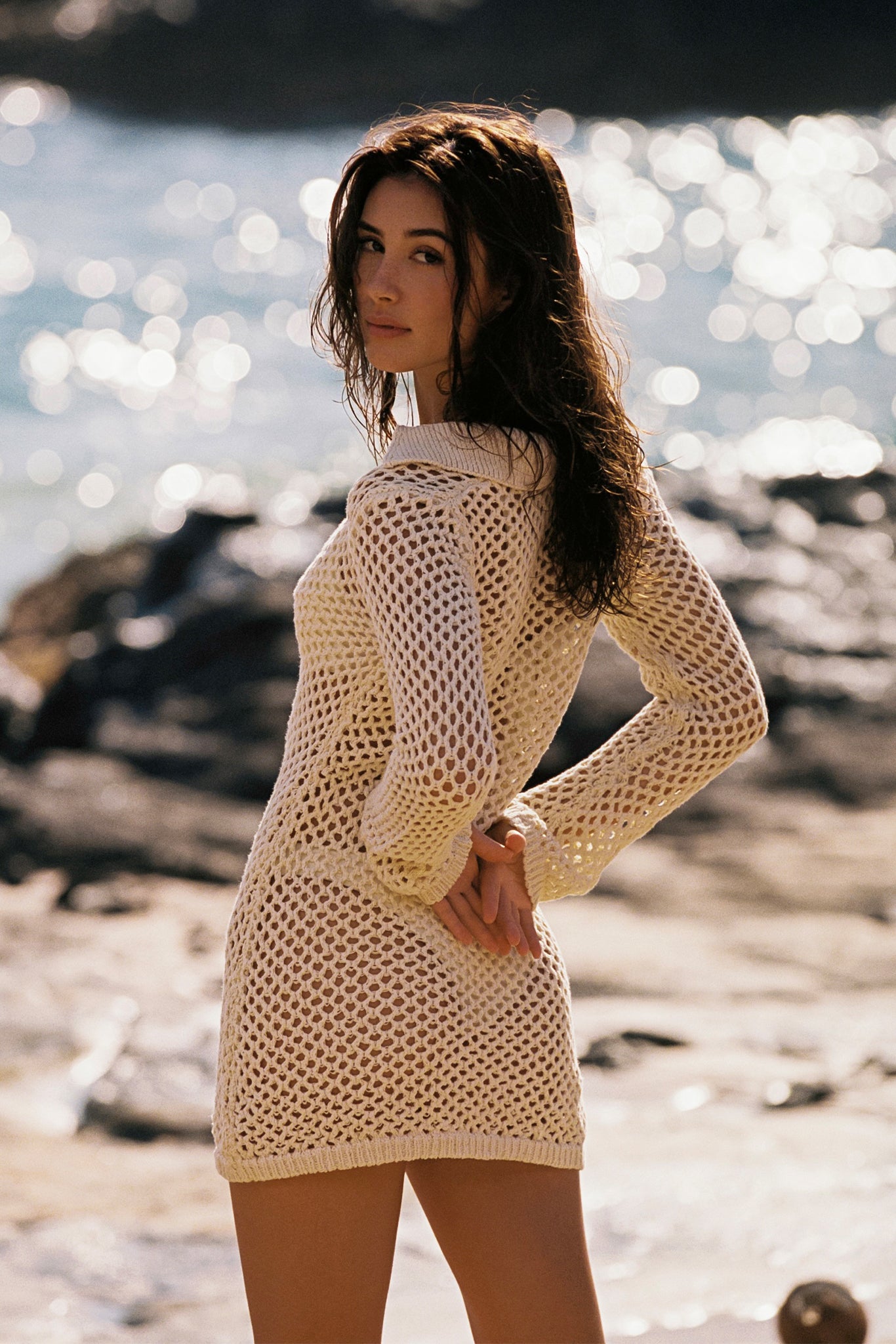 The Newport Dress is a chic & effortless mini dress that can go from vacation to brunch. This resort inspired collared dress is crafted from a soft breathable cotton that features a v-neckline and an open knit crochet design-- that's perfect for all day comfort!