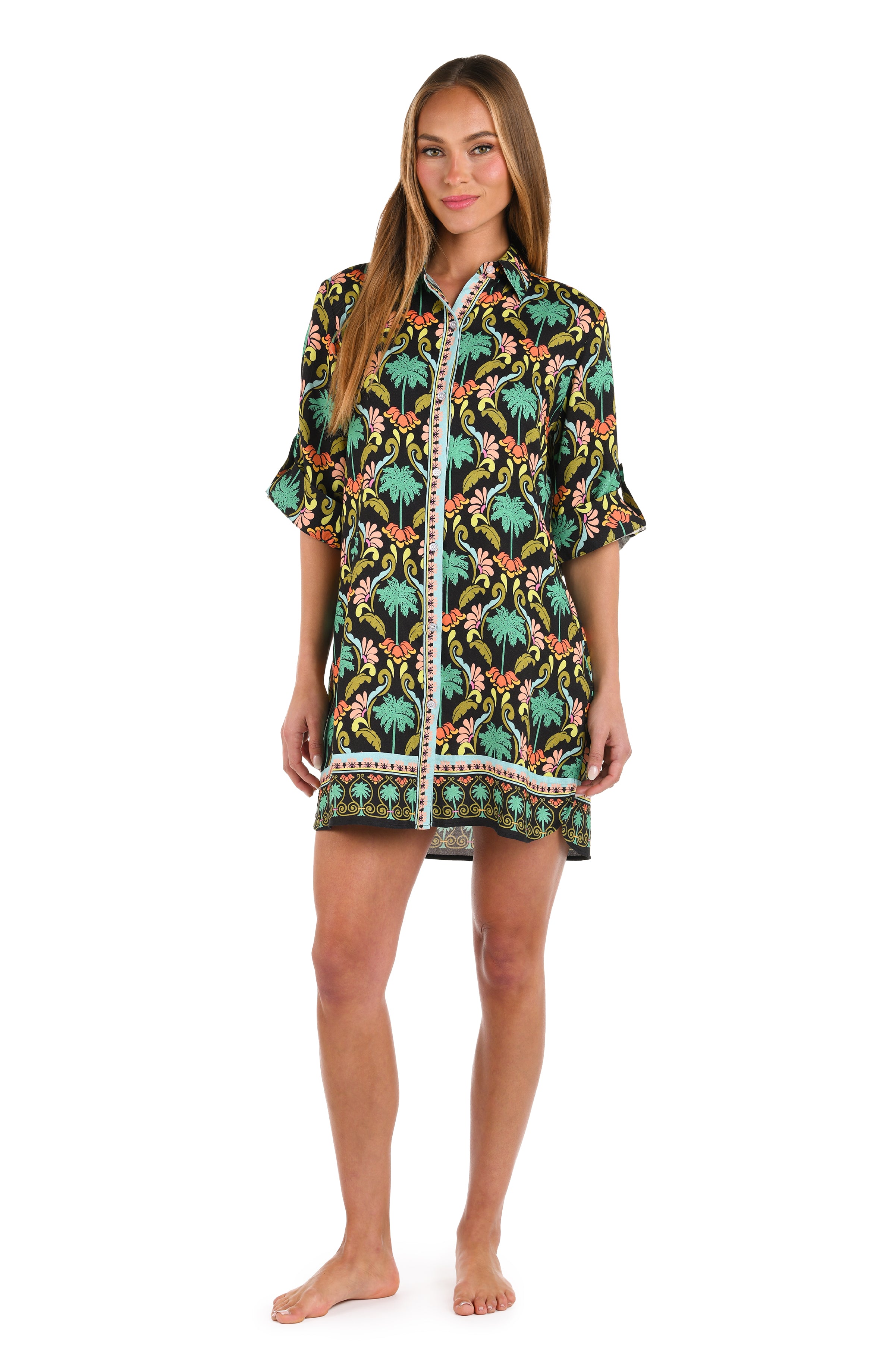 This print features a bold and tropical-inspired floral pattern with vibrant orange, green, and coral hues set against a rich black background. Styled with a button-up front, chest pocket and dolman sleeves, it's perfect for throwing on post dip. The versatile design looks equally good when paired with a pair of skinny jeans and a camisole.