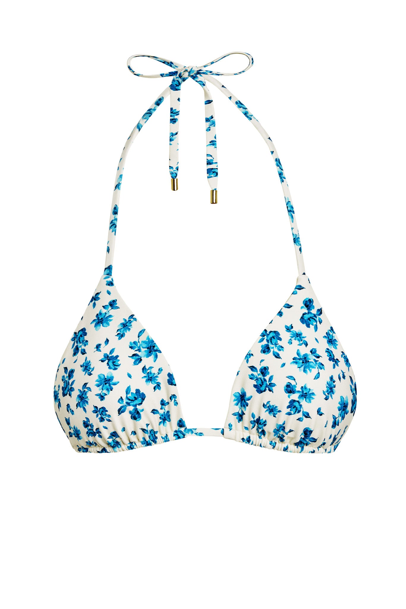 The Palma Top is a classic triangle style that is named by Natasha and Devin as their all time favorite. Designed with a soft recycled fabric in our feminine floral print, this swim top is complete with removable padding and adjustable neck and back ties.