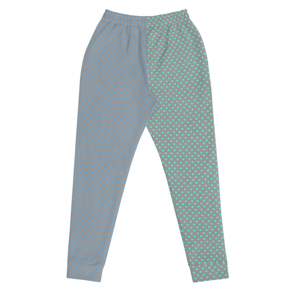 Soft, slim-fitting grey joggers in two-tuned blue polka dot heart print.