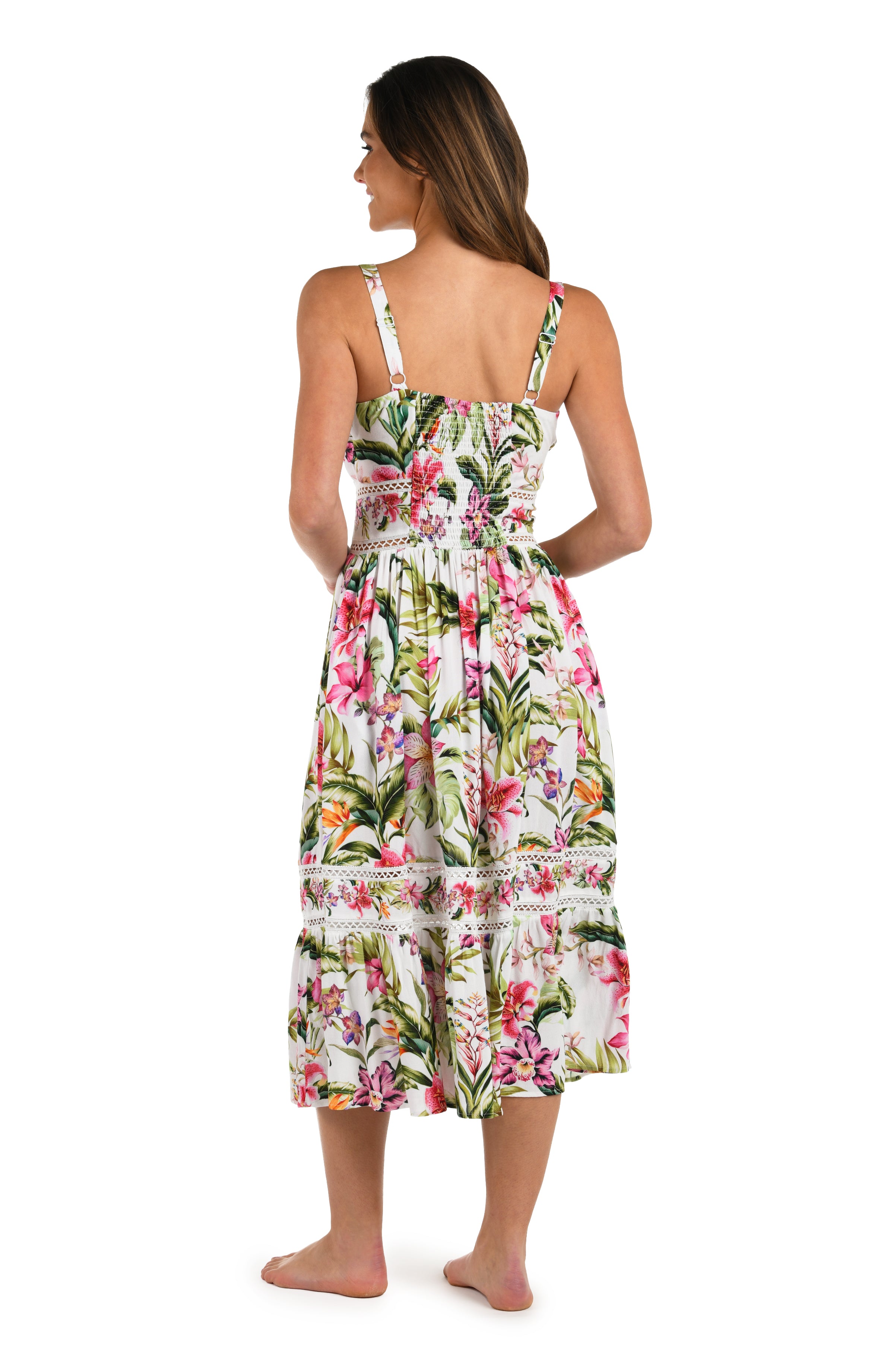 This lively floral design exudes a fresh, summery feel, perfect for a stylish and exotic beach look. This swimsuit cover-up dress offers a relaxed and breezy fit, perfect for effortless comfort on warm days. The lightweight fabric and flowy silhouette allow for easy movement, while the adjustable straps and lace detailing add a flattering, stylish touch.