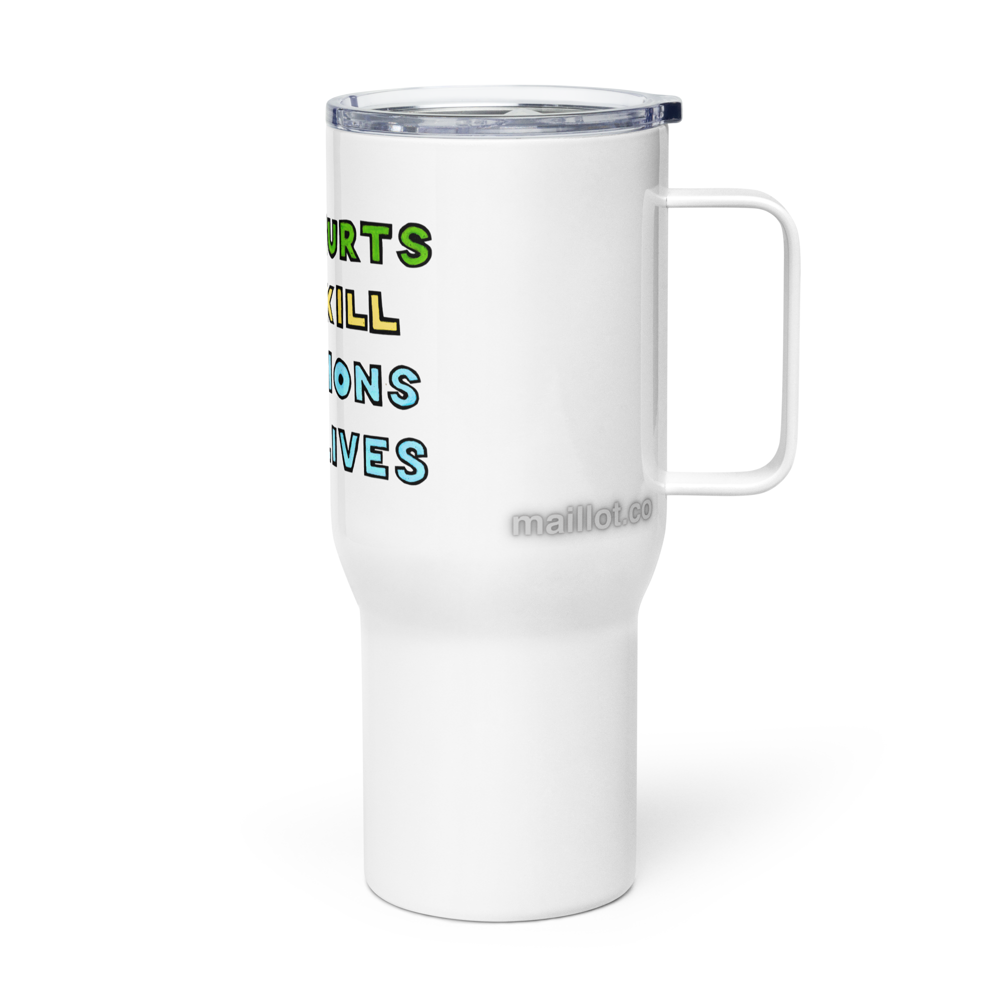 - Spark conversation and reflection with the green, yellow, and blue block lettering reading 'LOVE HURTS | GUNS KILL | ABORTIONS SAVE LIVES' - original painted artwork created exclusively for maillot.co.