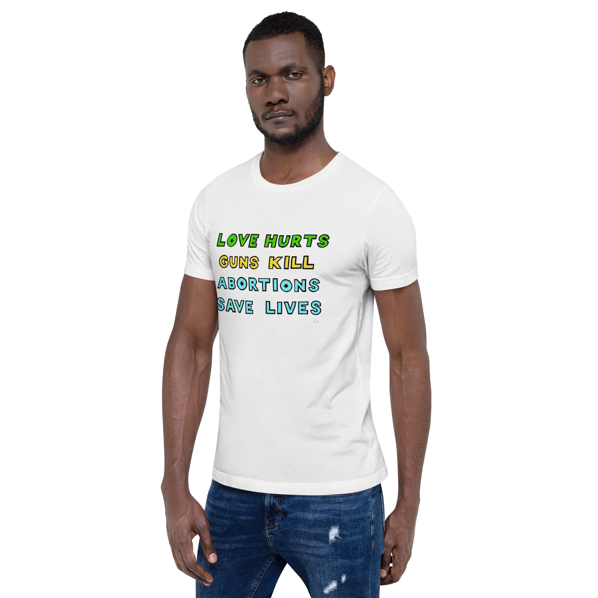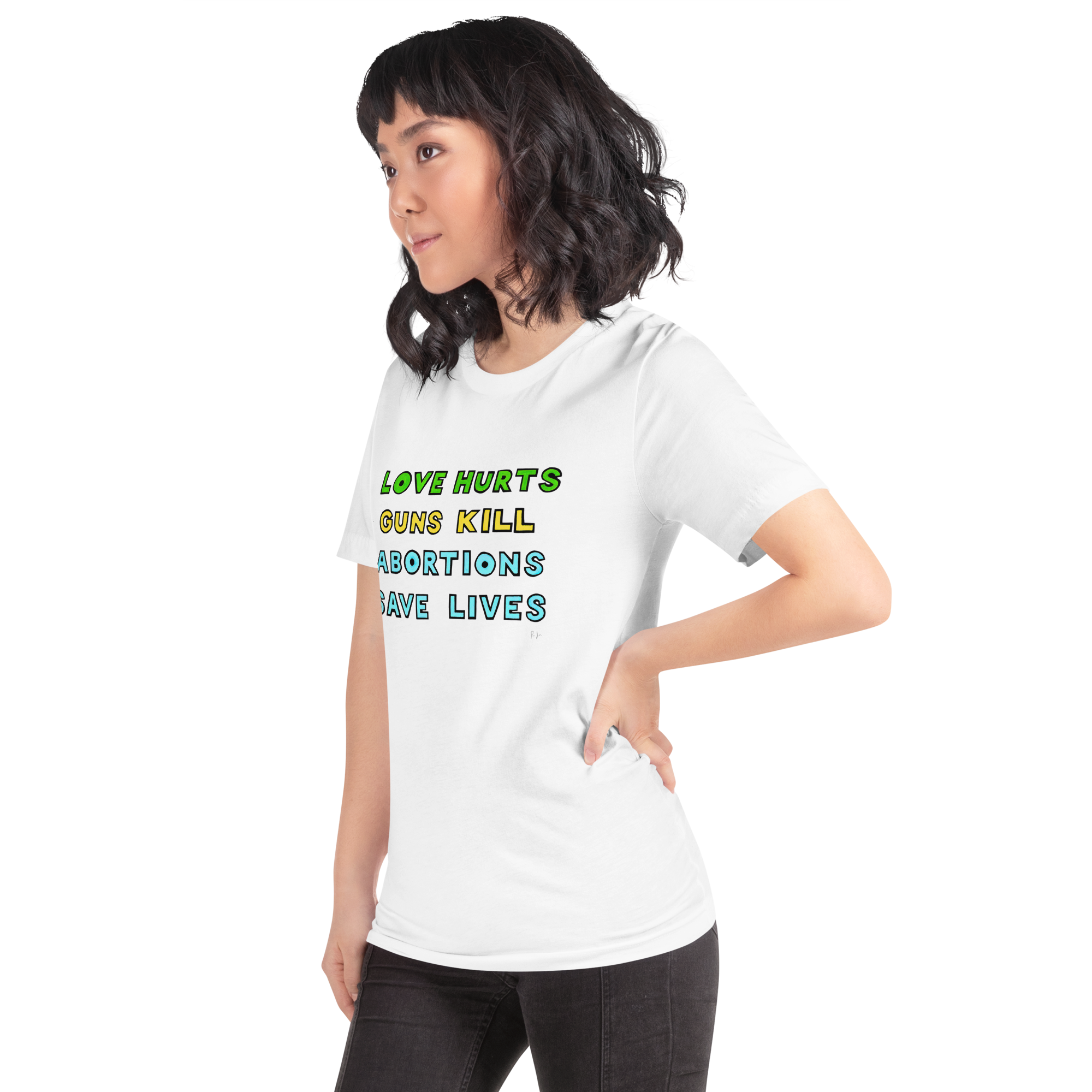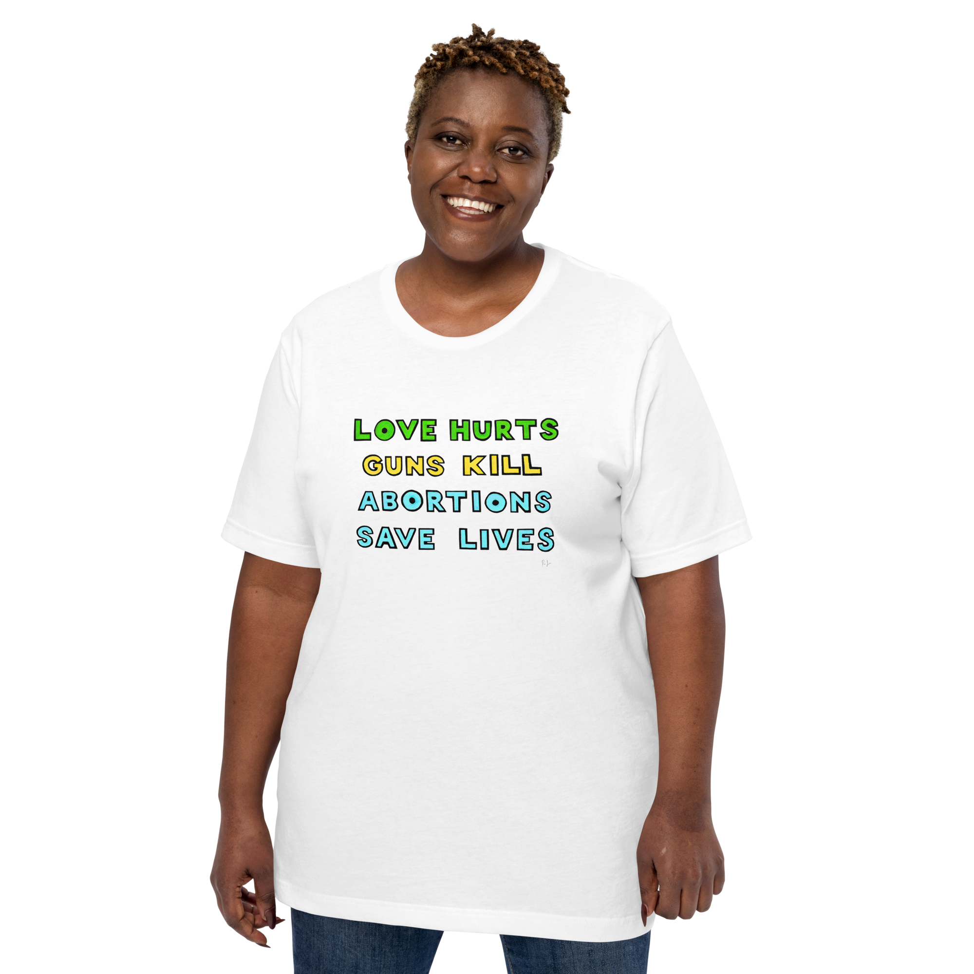 - Spark conversation and reflection with the original painted artwork featuring green, yellow, and blue block lettering that reads 'LOVE HURTS' 'GUNS KILL' 'ABORTIONS SAVE LIVES.'
